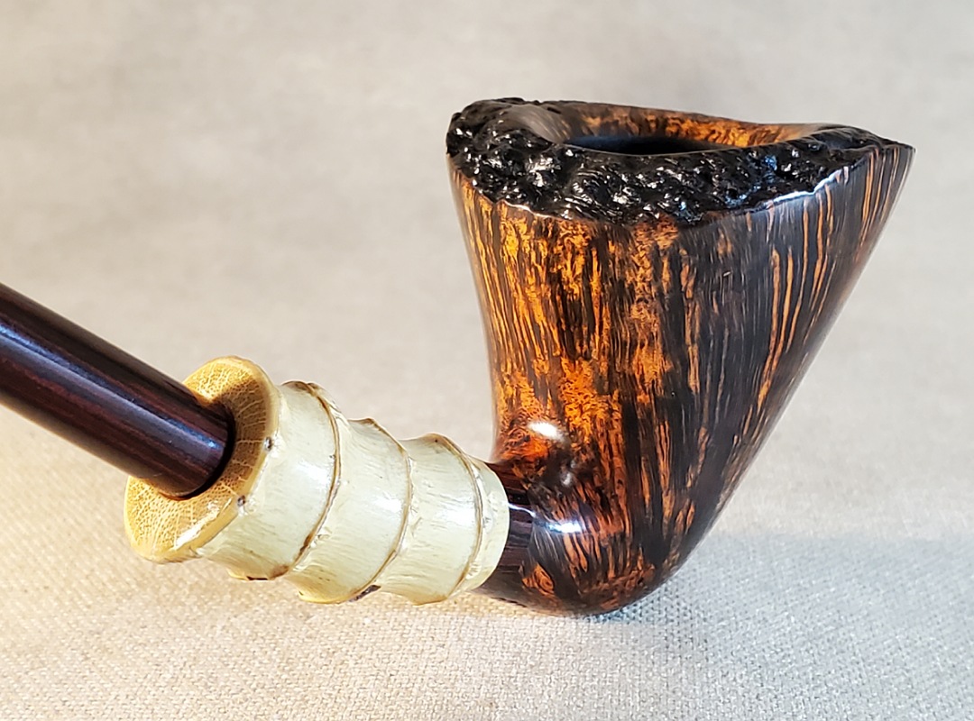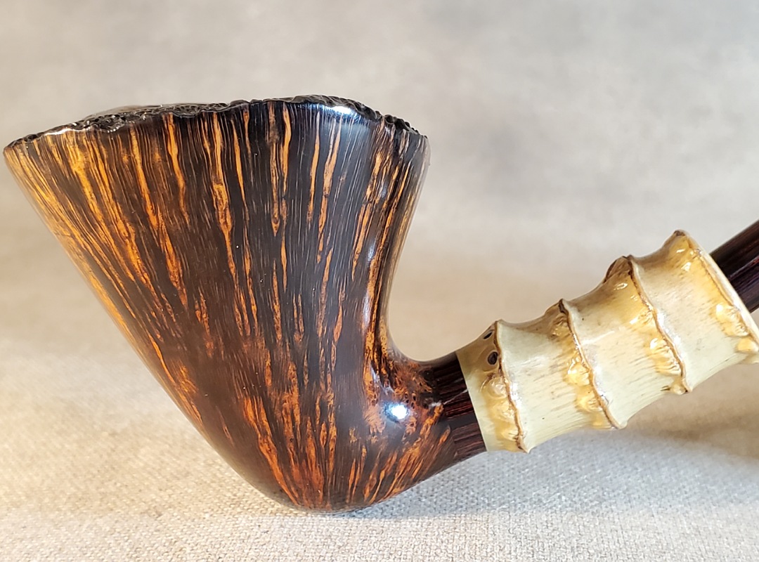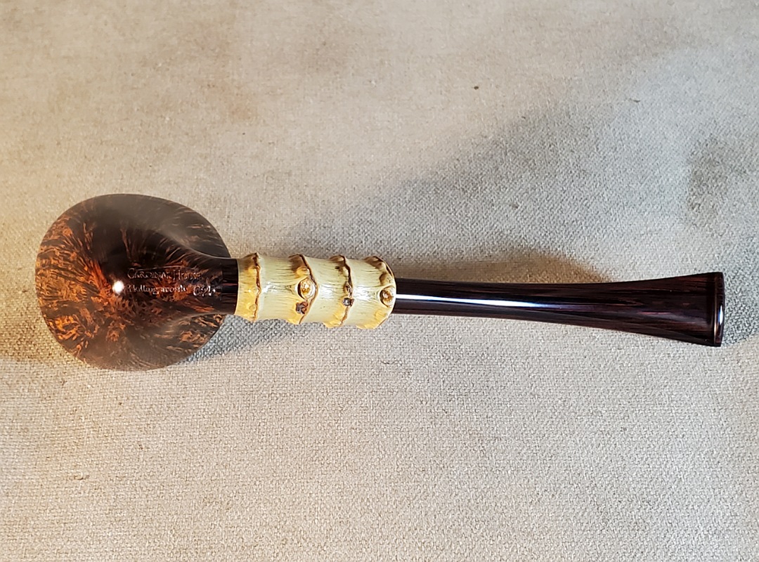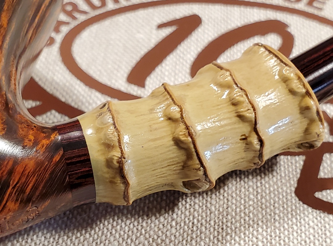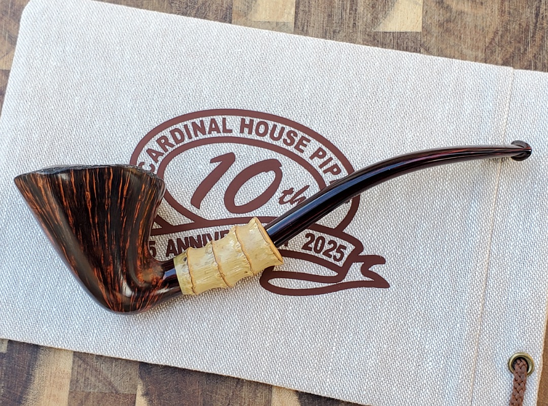 This 10th Anniversary Cardinal House pipes Hollingsworth series Freehand Dublin shaped briar pipe features a natural plateau rim and a bamboo shank. The stem is expertly hand-cut from NYH German Classic Cumberland Ebonite rod.