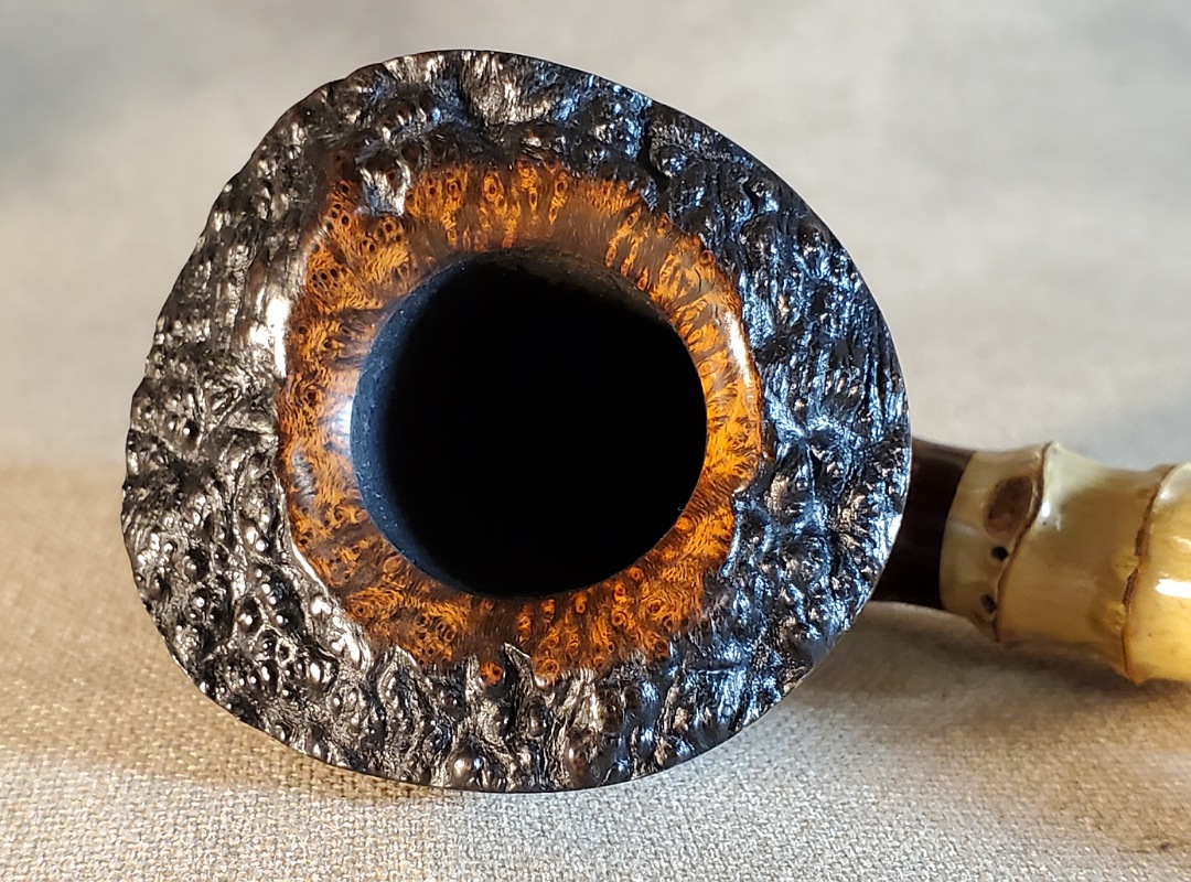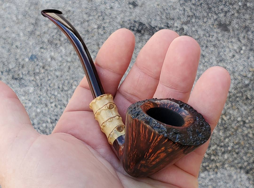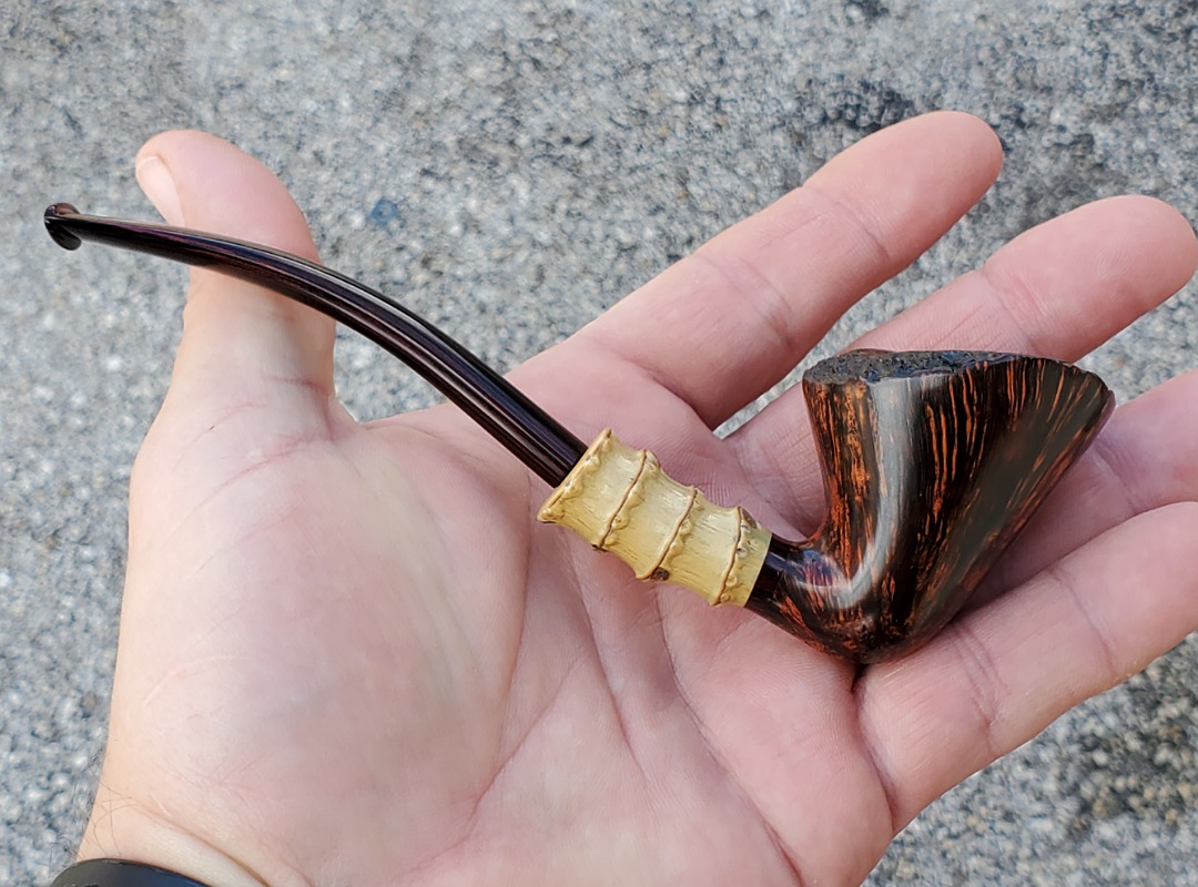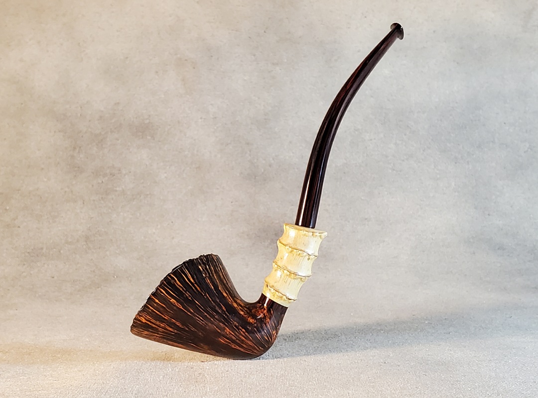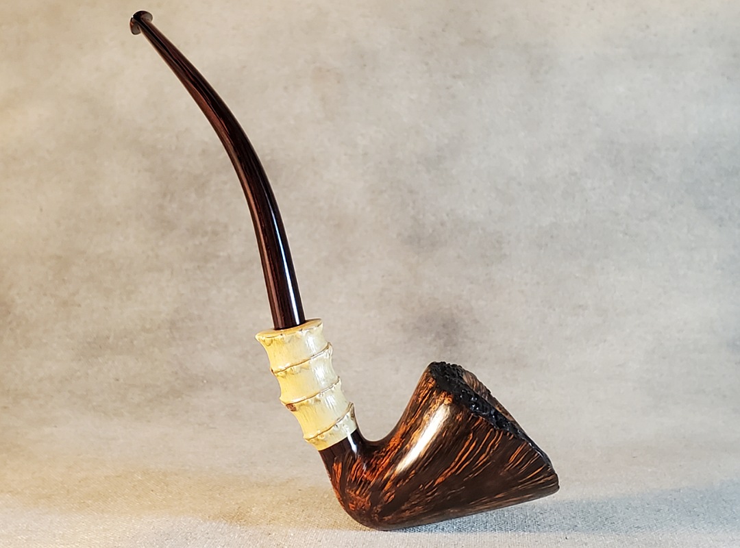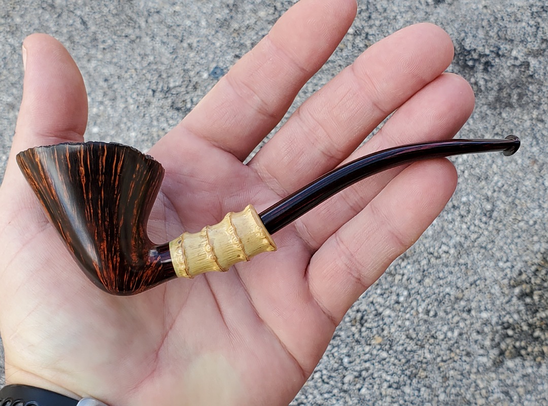 This 10th Anniversary Cardinal House pipes Hollingsworth series Freehand Dublin shaped briar pipe features a natural plateau rim and a bamboo shank. The stem is expertly hand-cut from NYH German Classic Cumberland Ebonite rod.