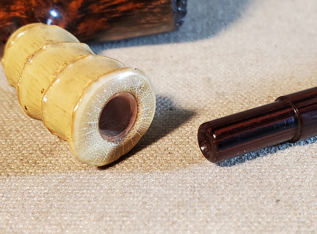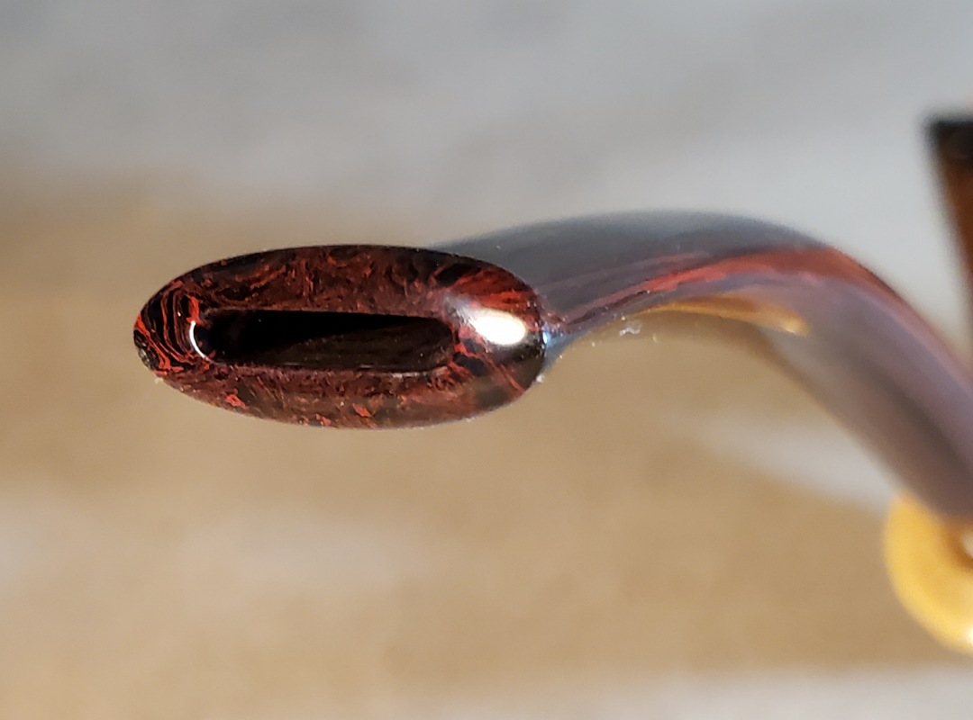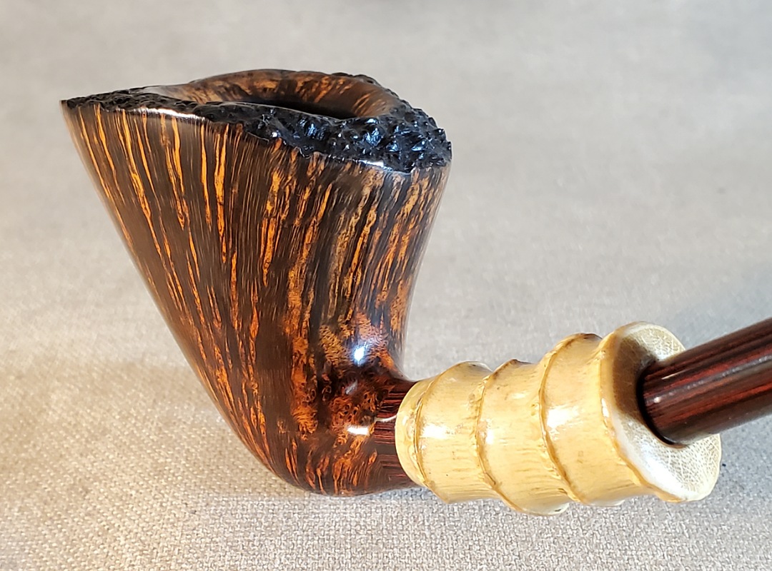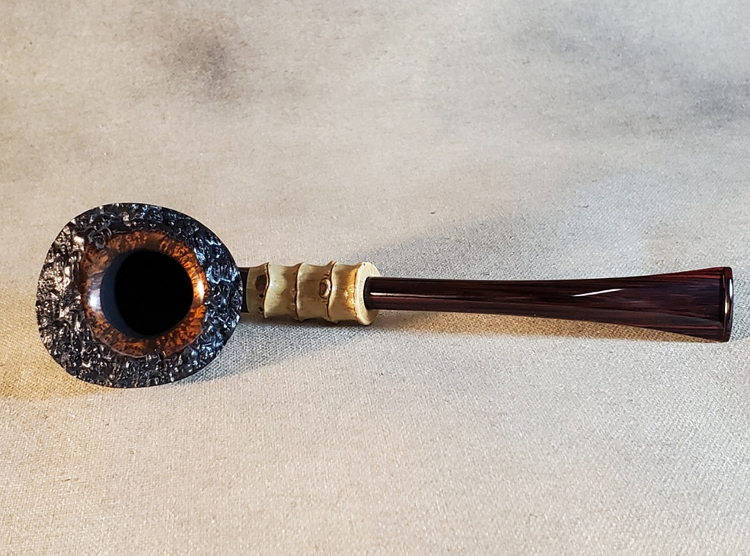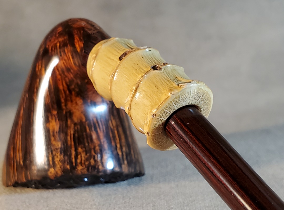 This 10th Anniversary Cardinal House pipes Hollingsworth series Freehand Dublin shaped briar pipe features a natural plateau rim and a bamboo shank. The stem is expertly hand-cut from NYH German Classic Cumberland Ebonite rod.
