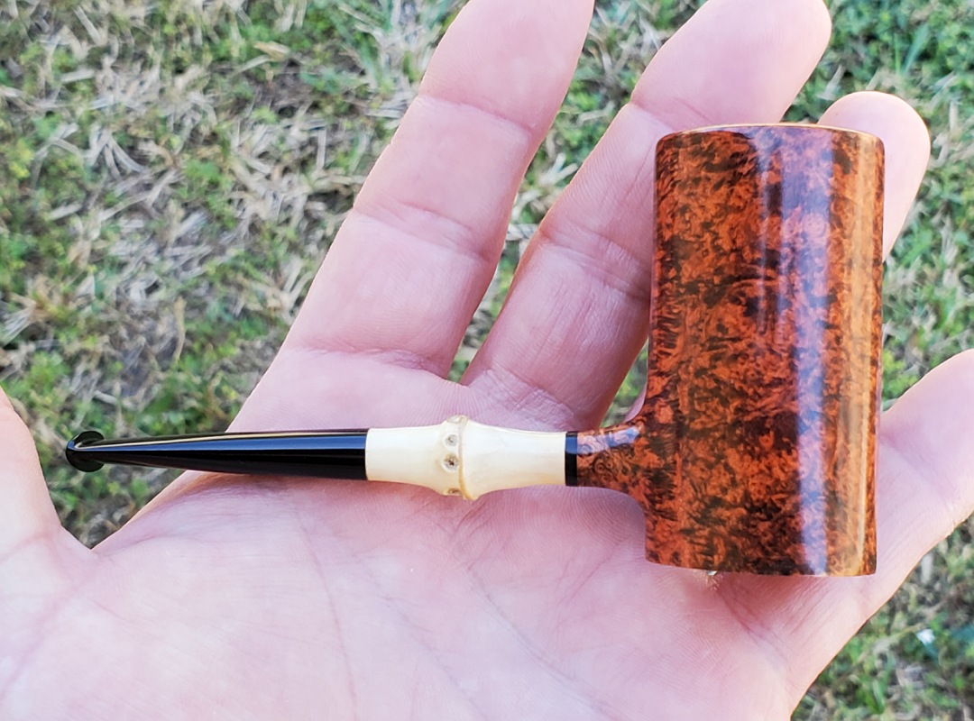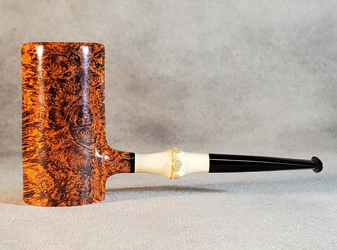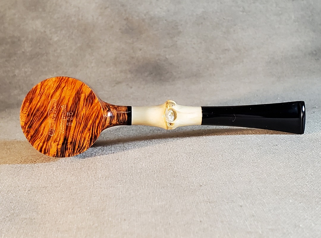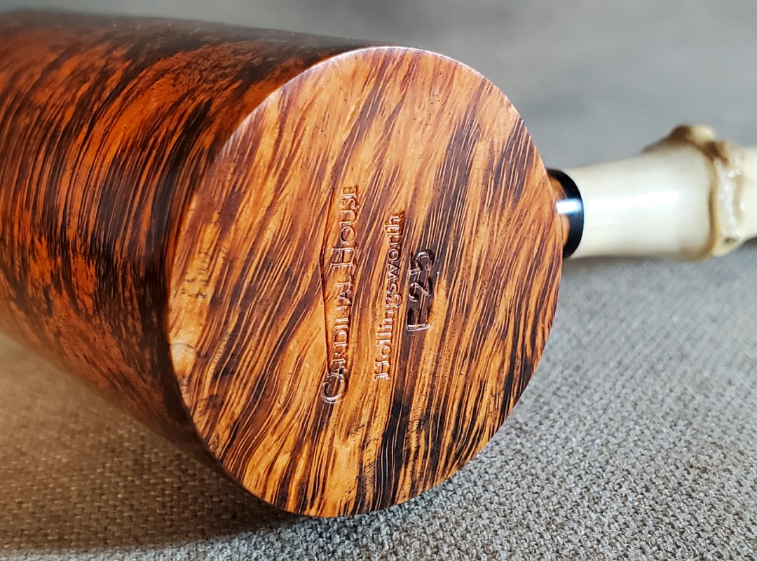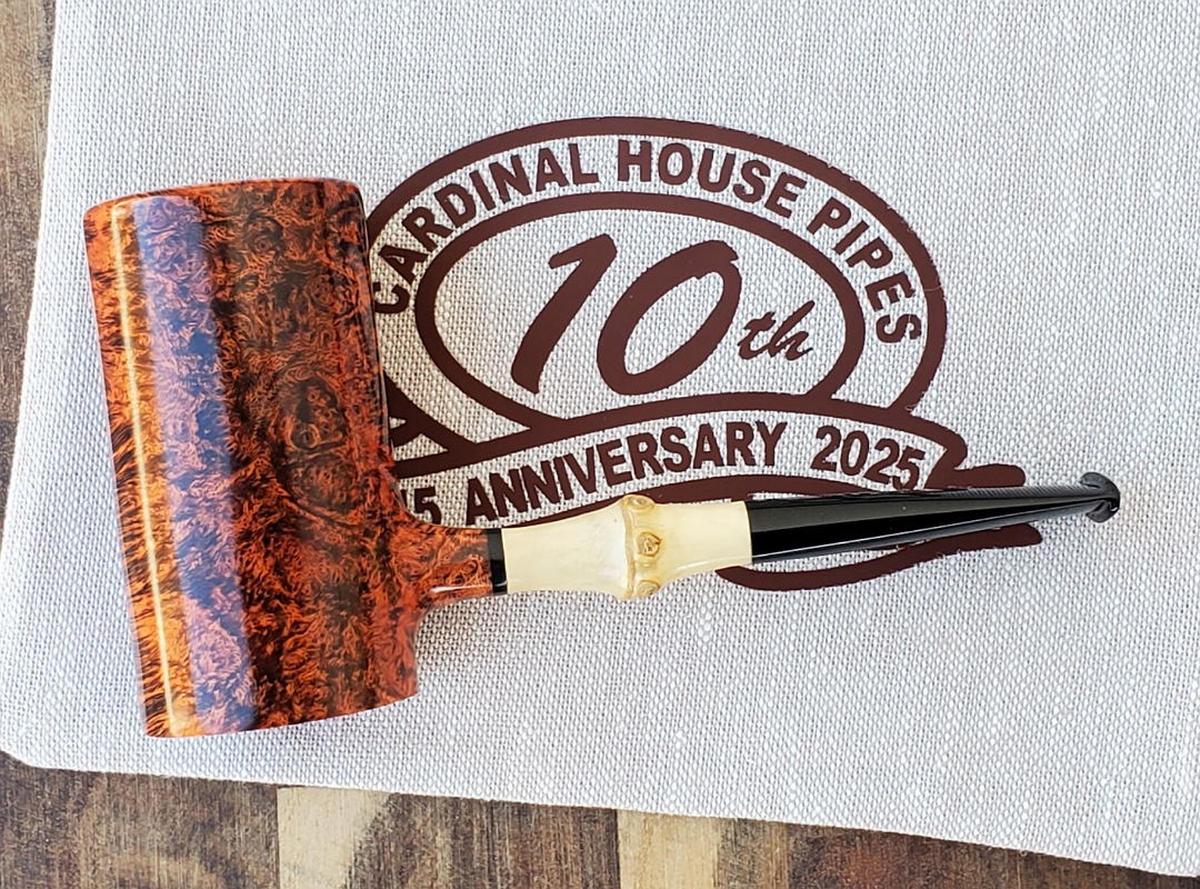This 10th Anniversary Cardinal House pipes Hollingsworth series Poker shaped briar pipe has all the grain! The pencil-thin bamboo shank is reinforced with stainless steel tubing with a stainless tenon. The stem is expertly hand-cut from black NYH German Ebonite rod.