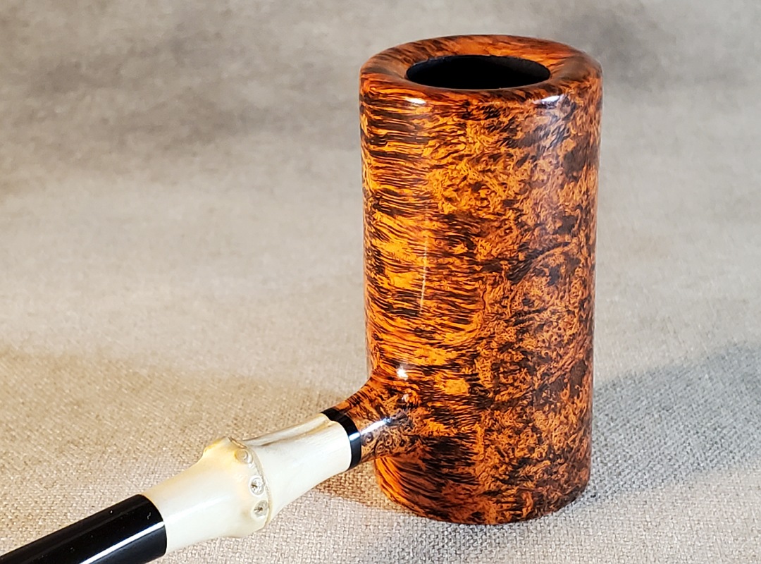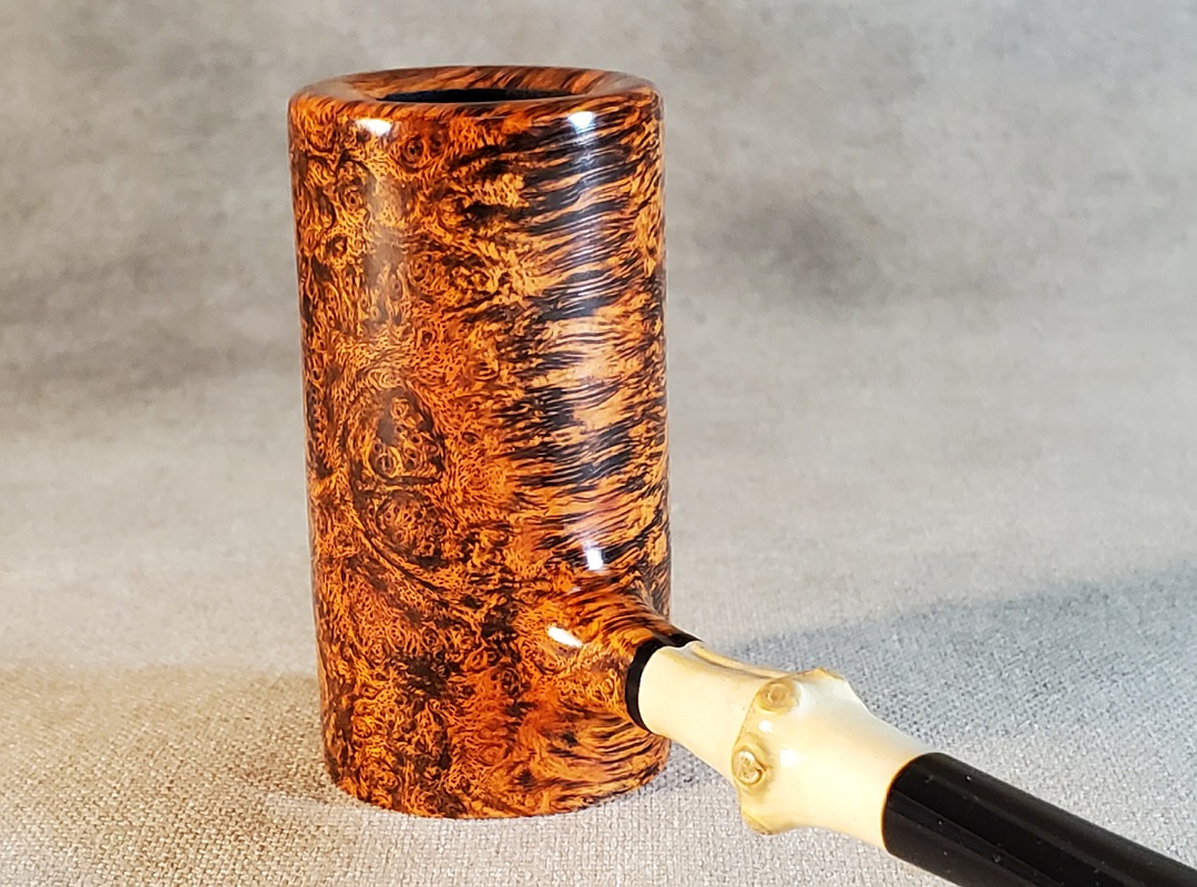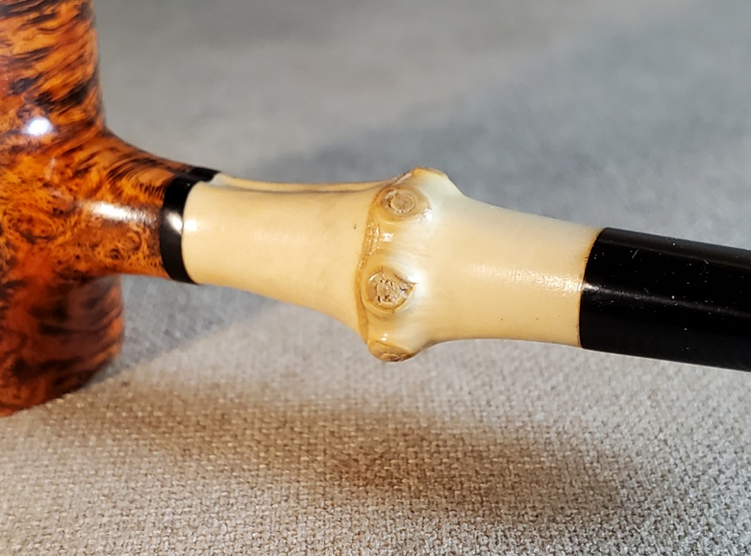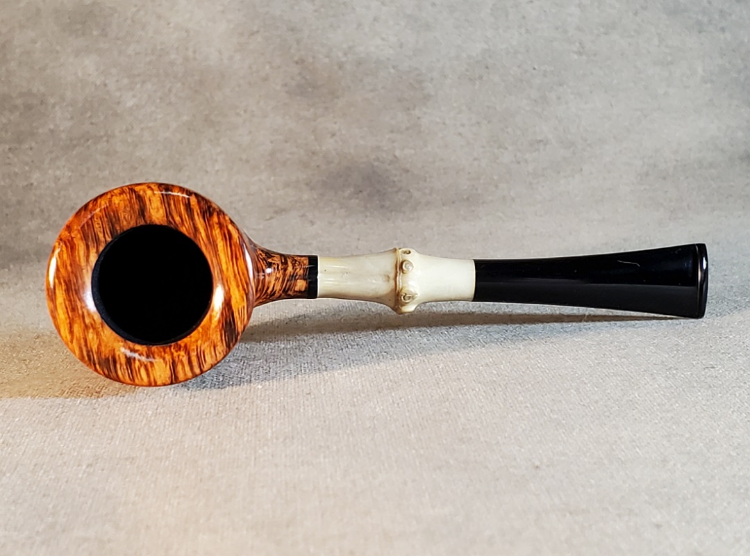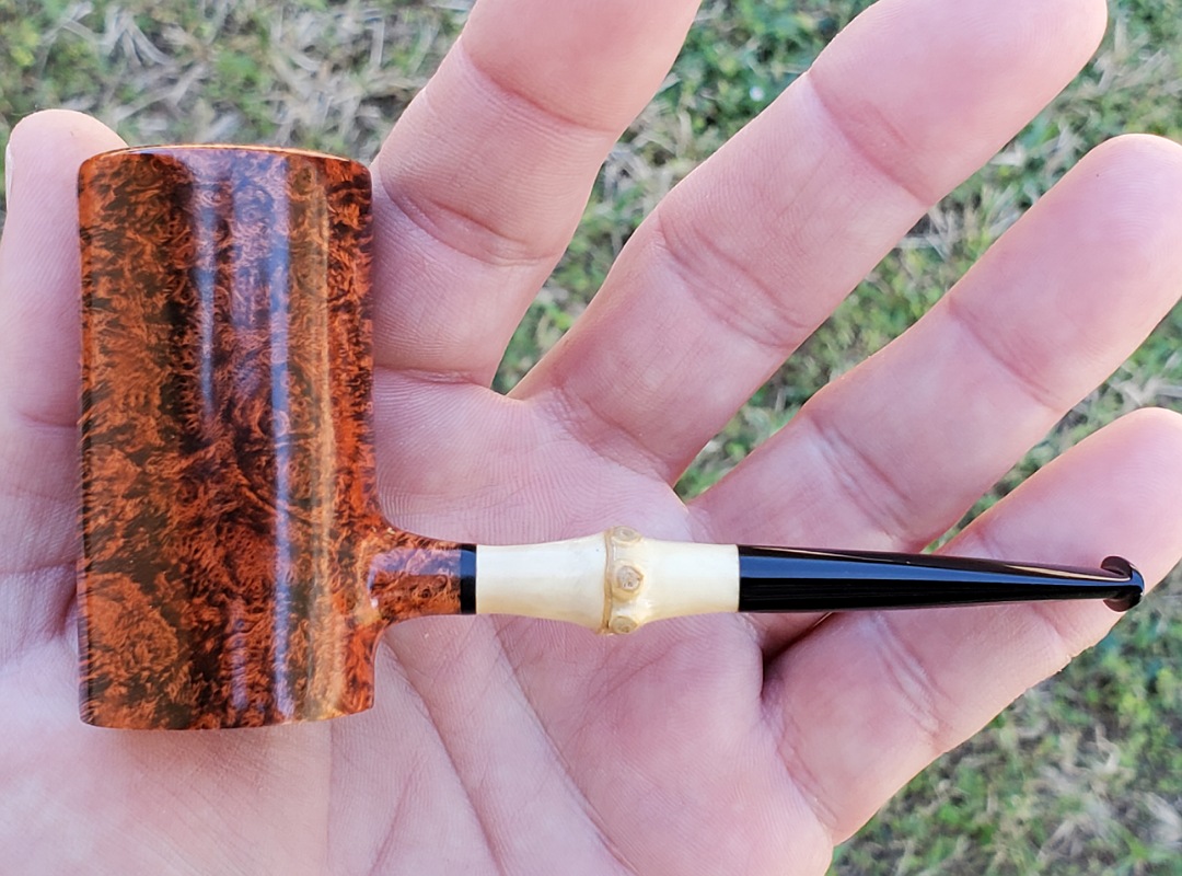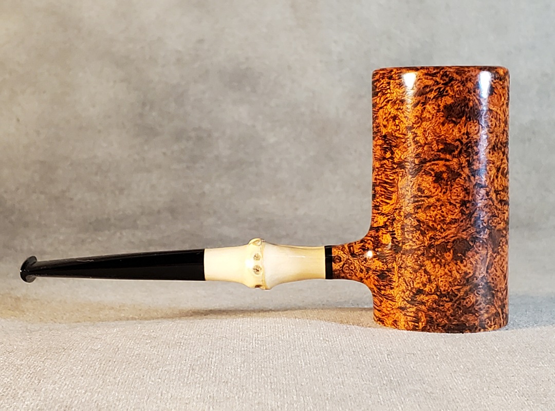 This 10th Anniversary Cardinal House pipes Hollingsworth series Poker shaped briar pipe has all the grain! The pencil-thin bamboo shank is reinforced with stainless steel tubing with a stainless tenon. The stem is expertly hand-cut from black NYH German Ebonite rod.