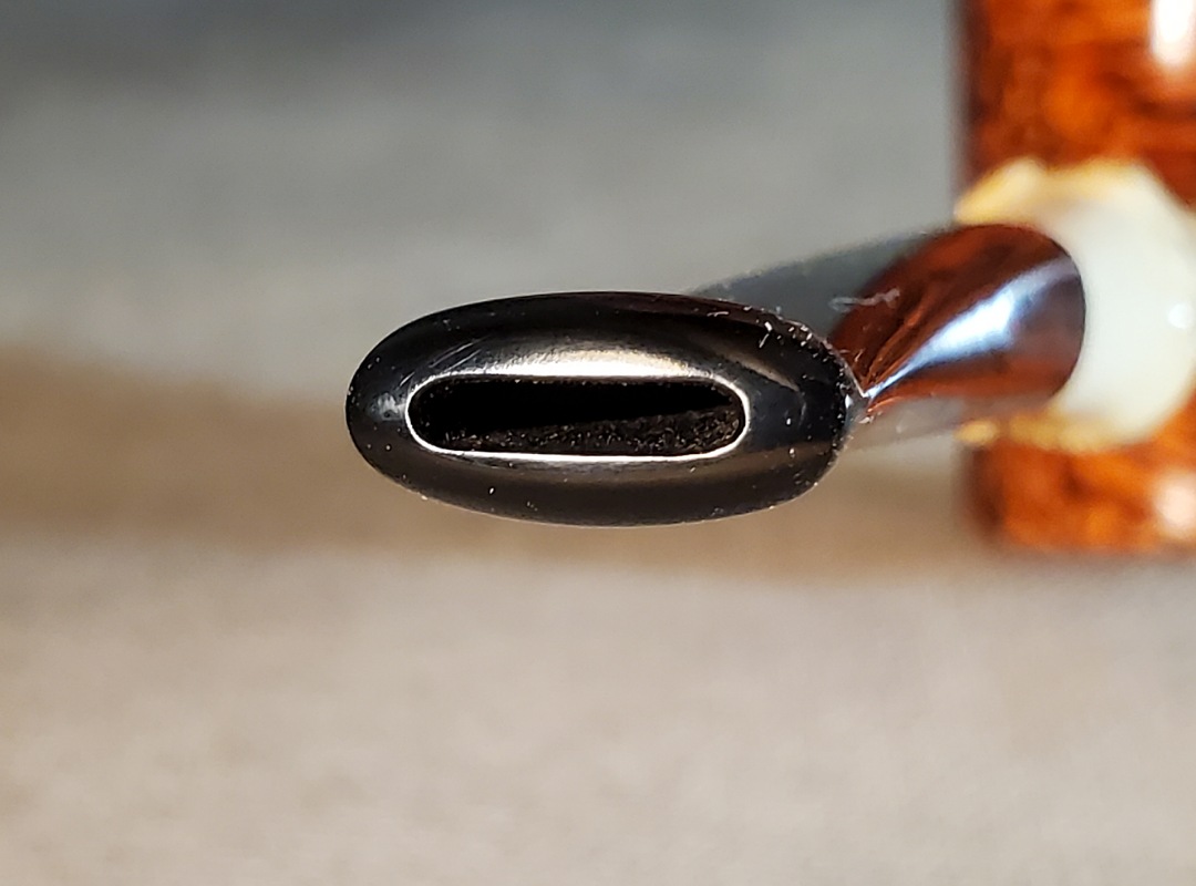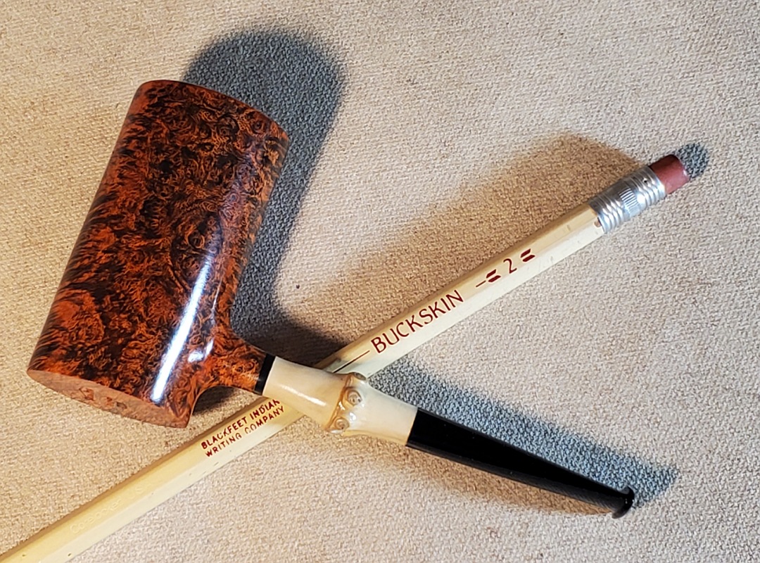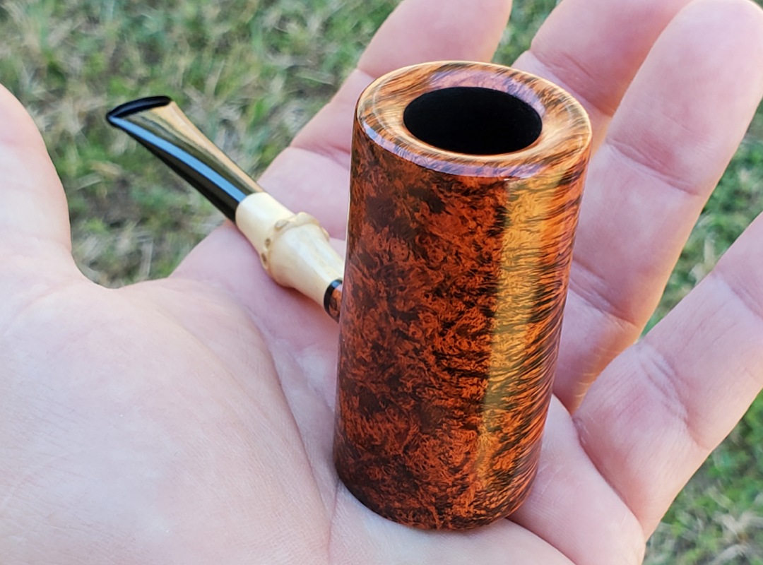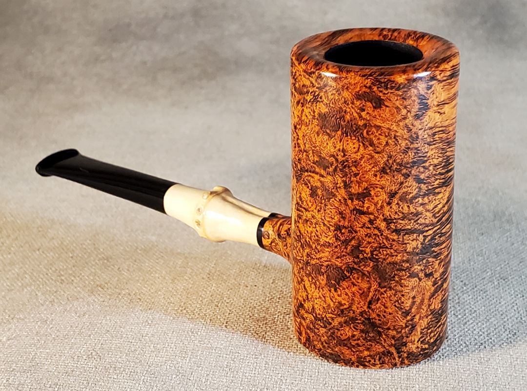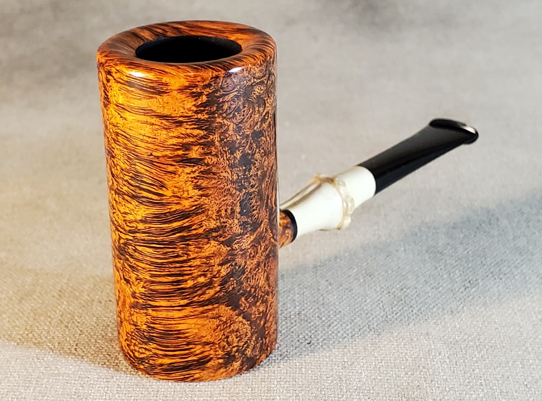 This 10th Anniversary Cardinal House pipes Hollingsworth series Poker shaped briar pipe has all the grain! The pencil-thin bamboo shank is reinforced with stainless steel tubing with a stainless tenon. The stem is expertly hand-cut from black NYH German Ebonite rod.