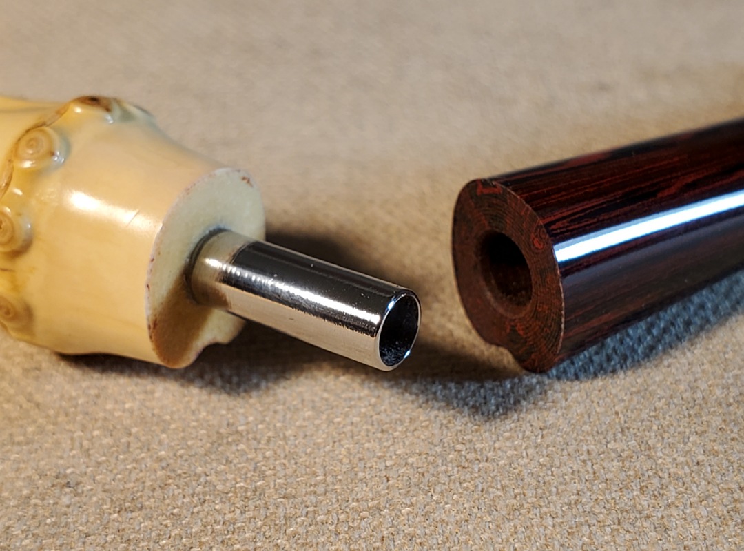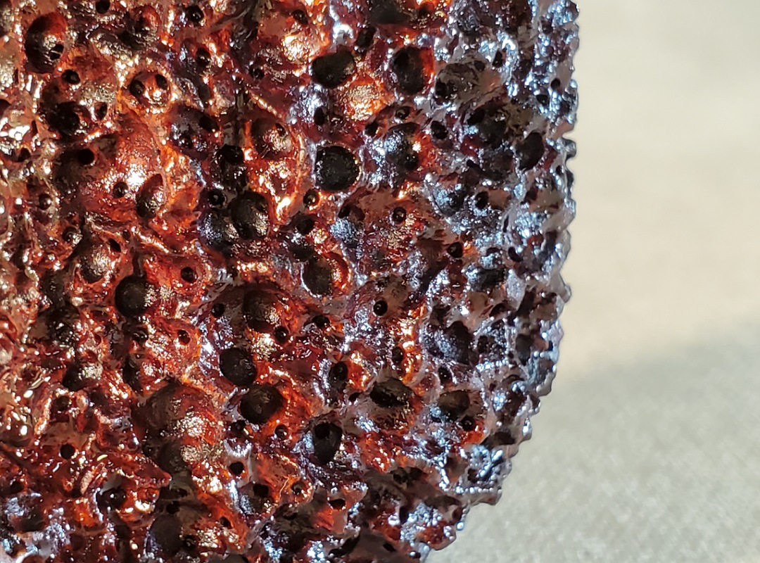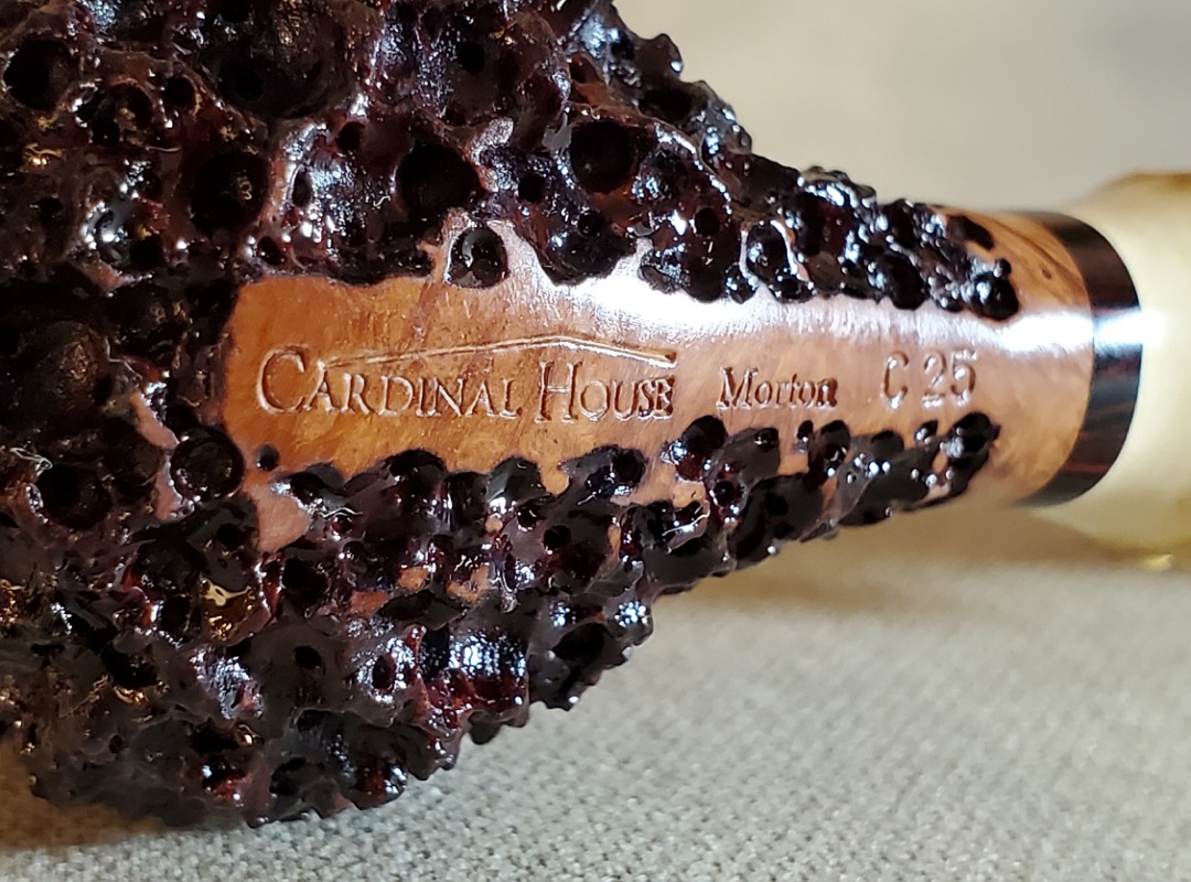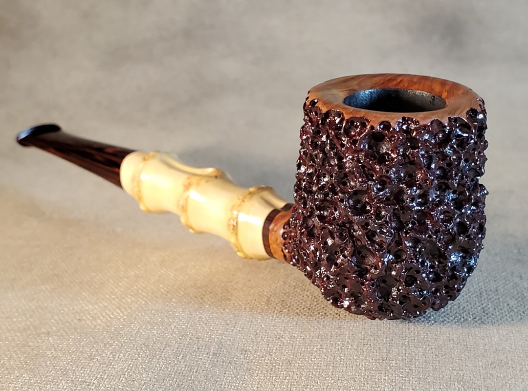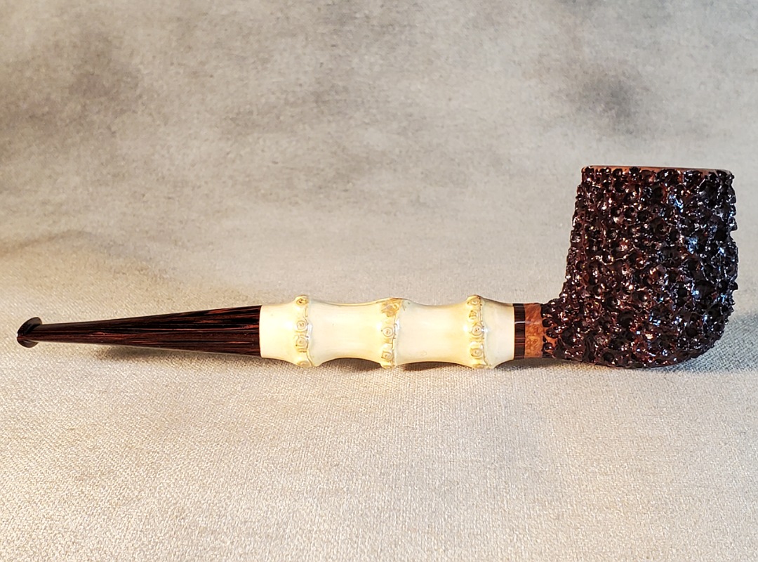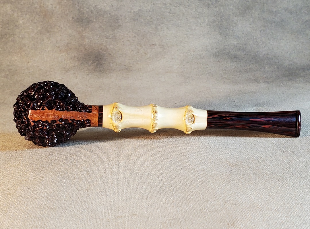 This 10th Anniversary Cardinal House pipes Morton series Billiard shaped briar pipe is painstakingly carved in my deep and highly detailed “Lava Rock” style finish. The natural Bamboo shank is reinforced with stainless steel tubing with a stainless tenon. The stem is expertly hand-cut from NYH German Classic Cumberland Ebonite rod.