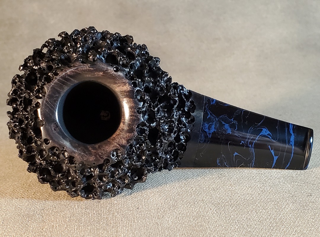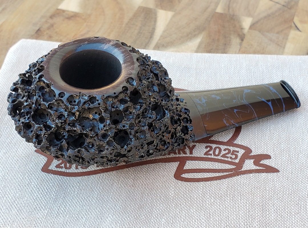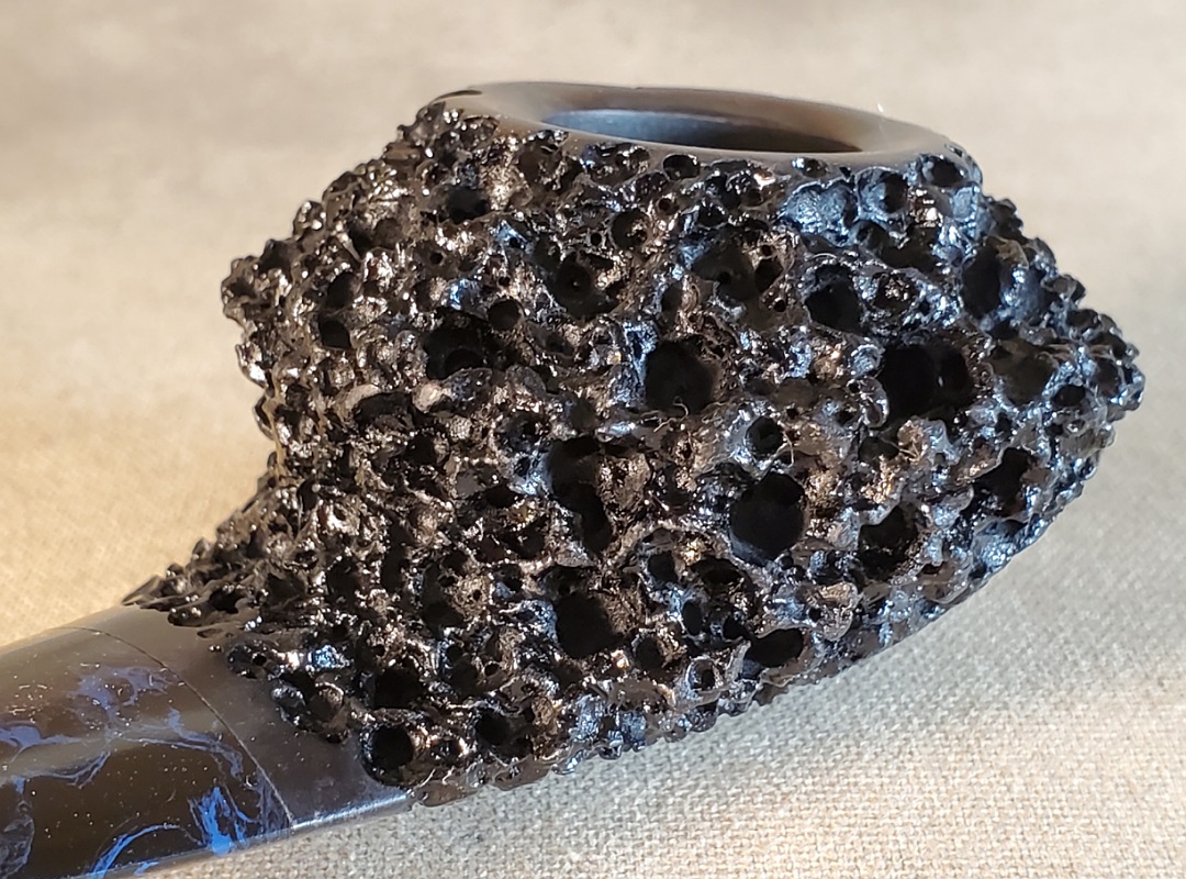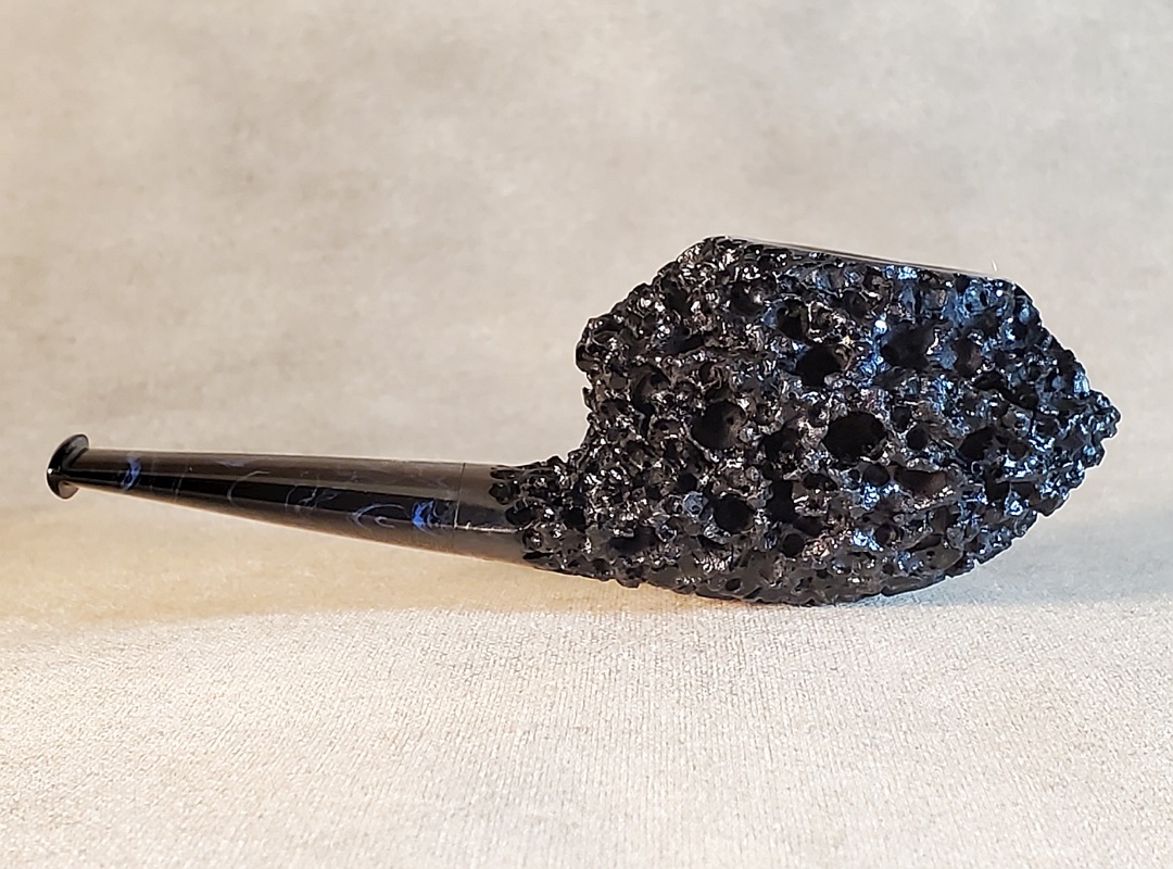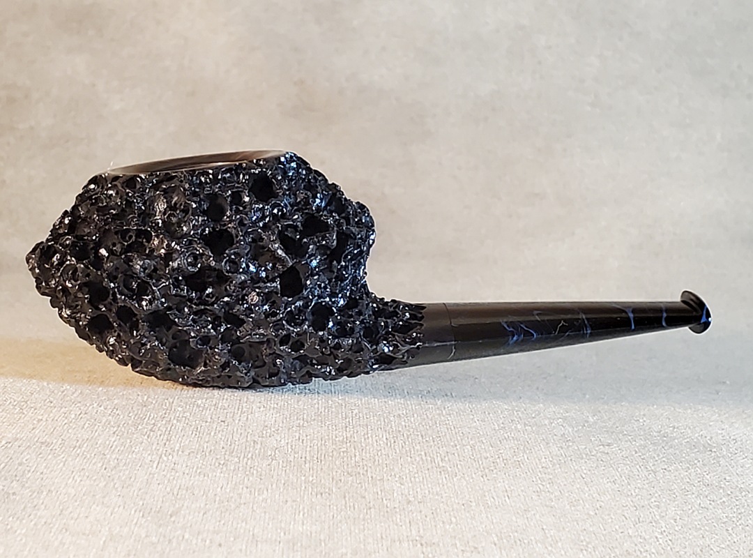 This 10th Anniversary Cardinal House pipes Munn series Eskimo shaped briar pipe is painstakingly carved in my deep and highly detailed “Lava Rock” style finish. The thin “blade-shank” is reinforced with stainless steel tubing with a stainless tenon. The stem is expertly hand-cut from Limited Edition black/blue SEM Brindle Ebonite rod.