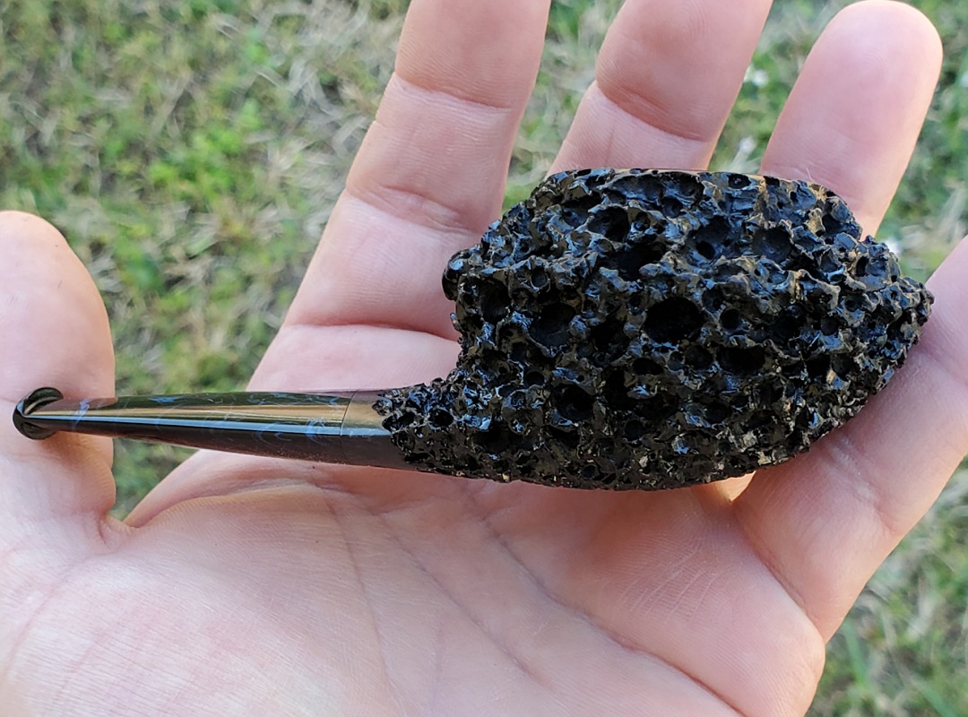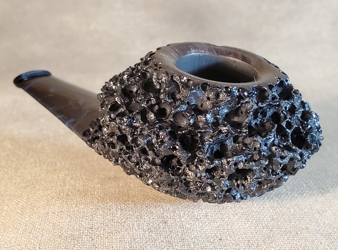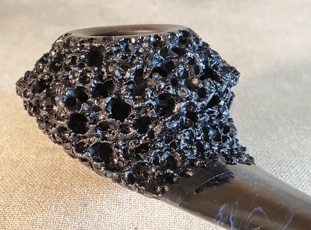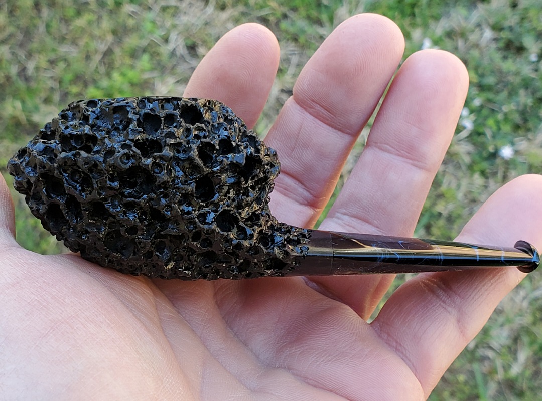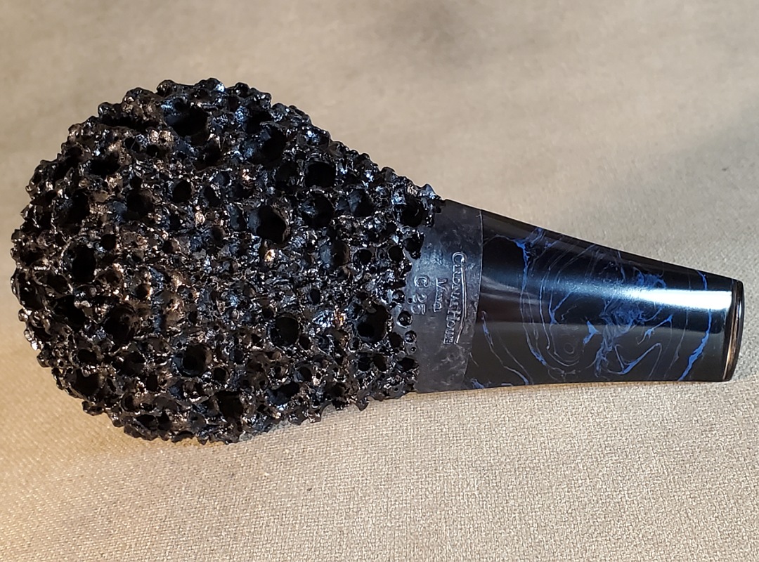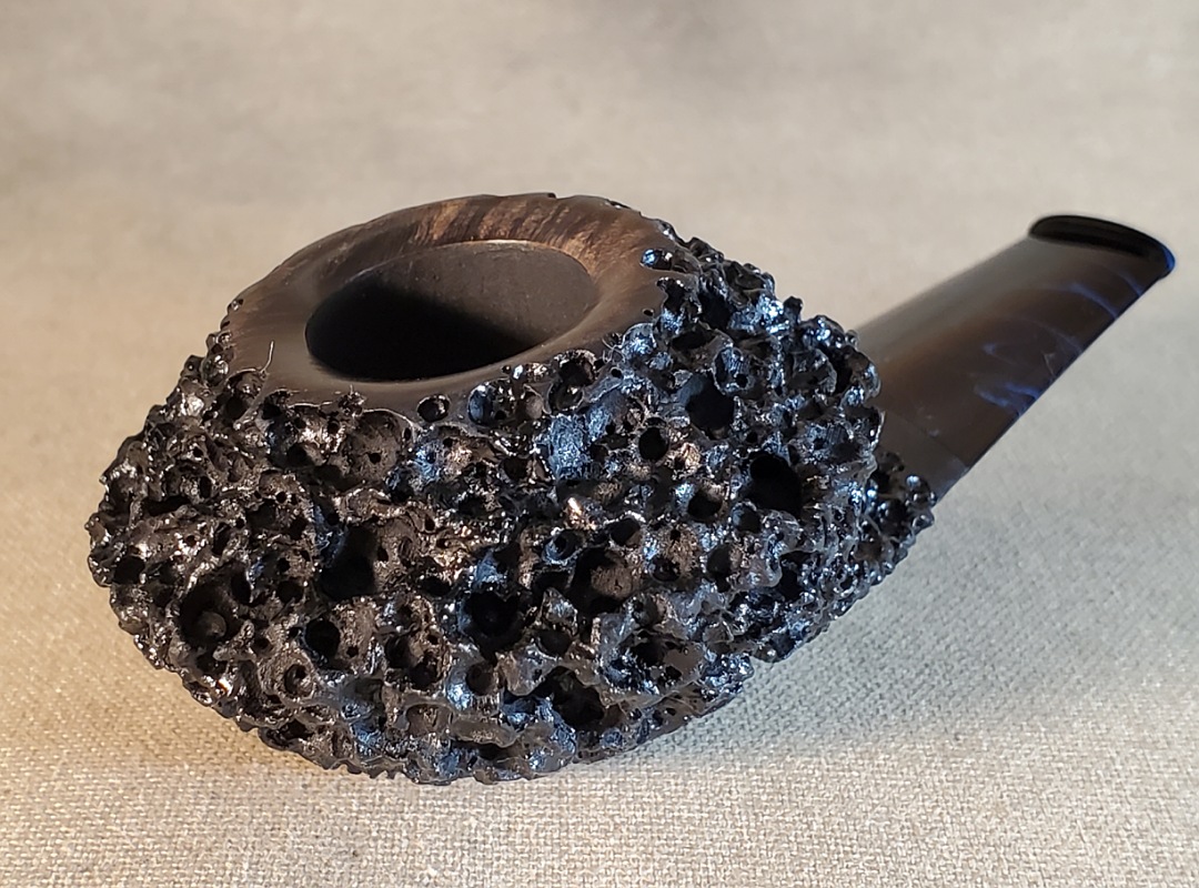 This 10th Anniversary Cardinal House pipes Munn series Eskimo shaped briar pipe is painstakingly carved in my deep and highly detailed “Lava Rock” style finish. The thin “blade-shank” is reinforced with stainless steel tubing with a stainless tenon. The stem is expertly hand-cut from Limited Edition black/blue SEM Brindle Ebonite rod.