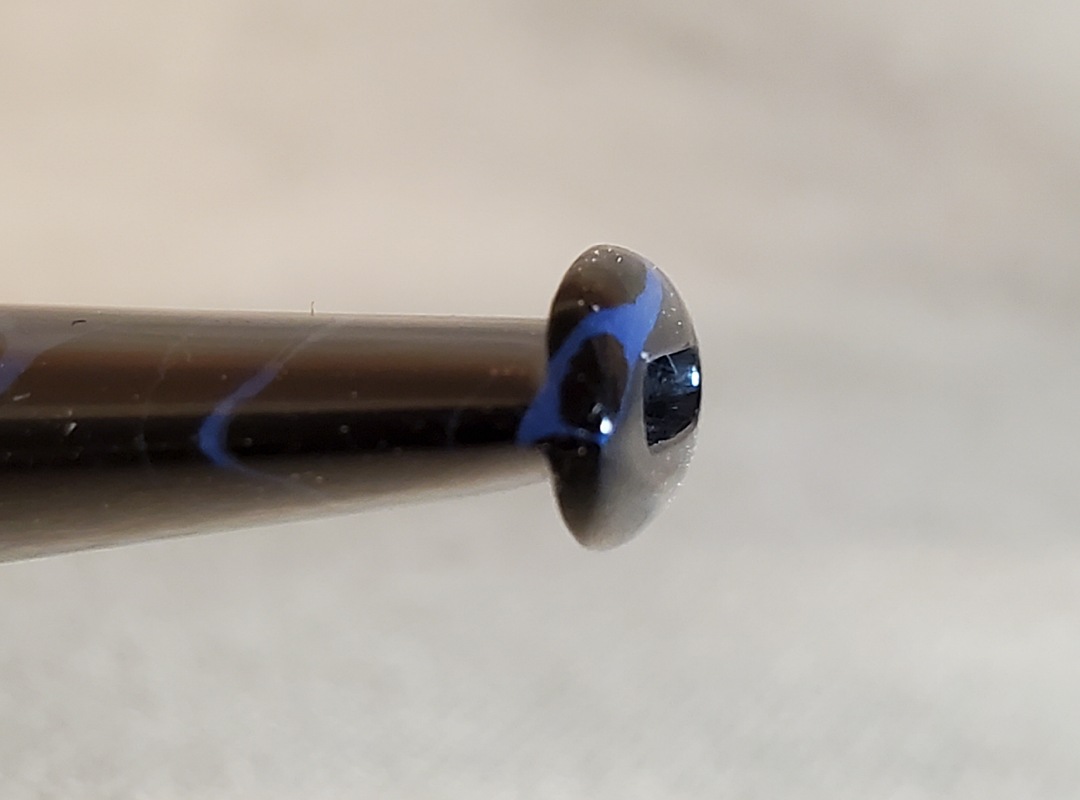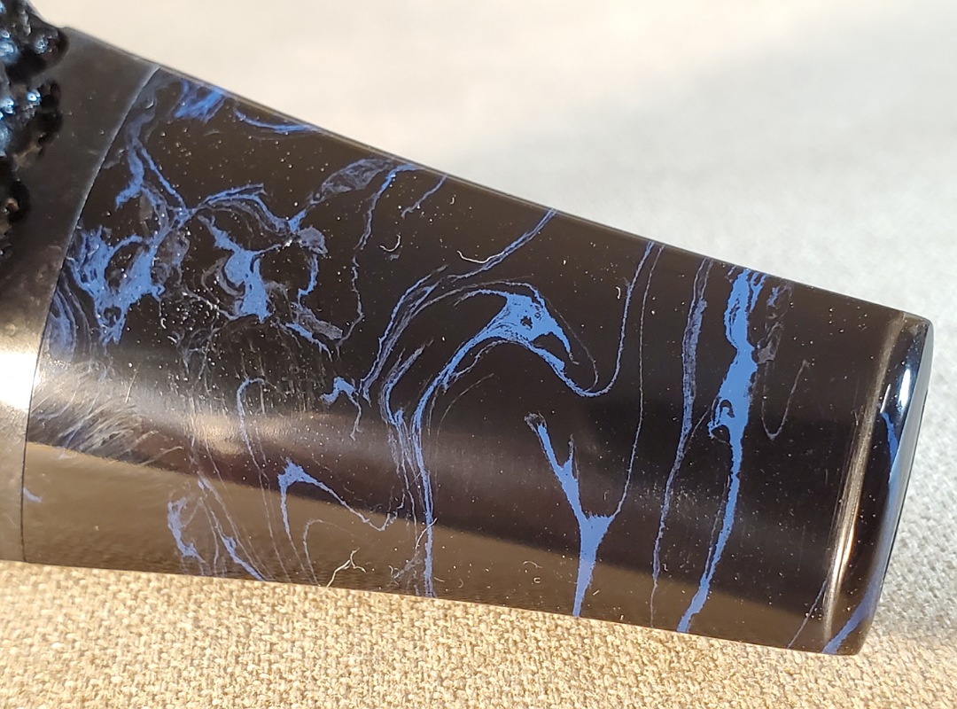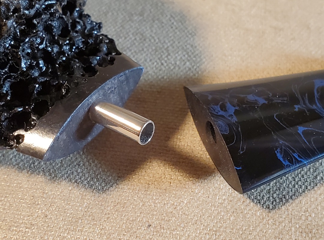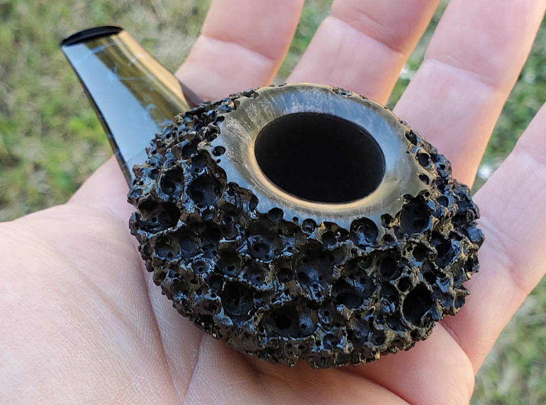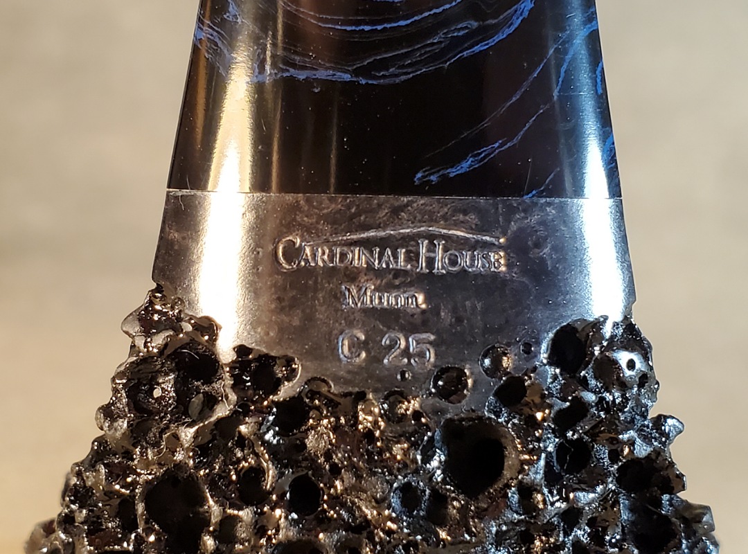 This 10th Anniversary Cardinal House pipes Munn series Eskimo shaped briar pipe is painstakingly carved in my deep and highly detailed “Lava Rock” style finish. The thin “blade-shank” is reinforced with stainless steel tubing with a stainless tenon. The stem is expertly hand-cut from Limited Edition black/blue SEM Brindle Ebonite rod.