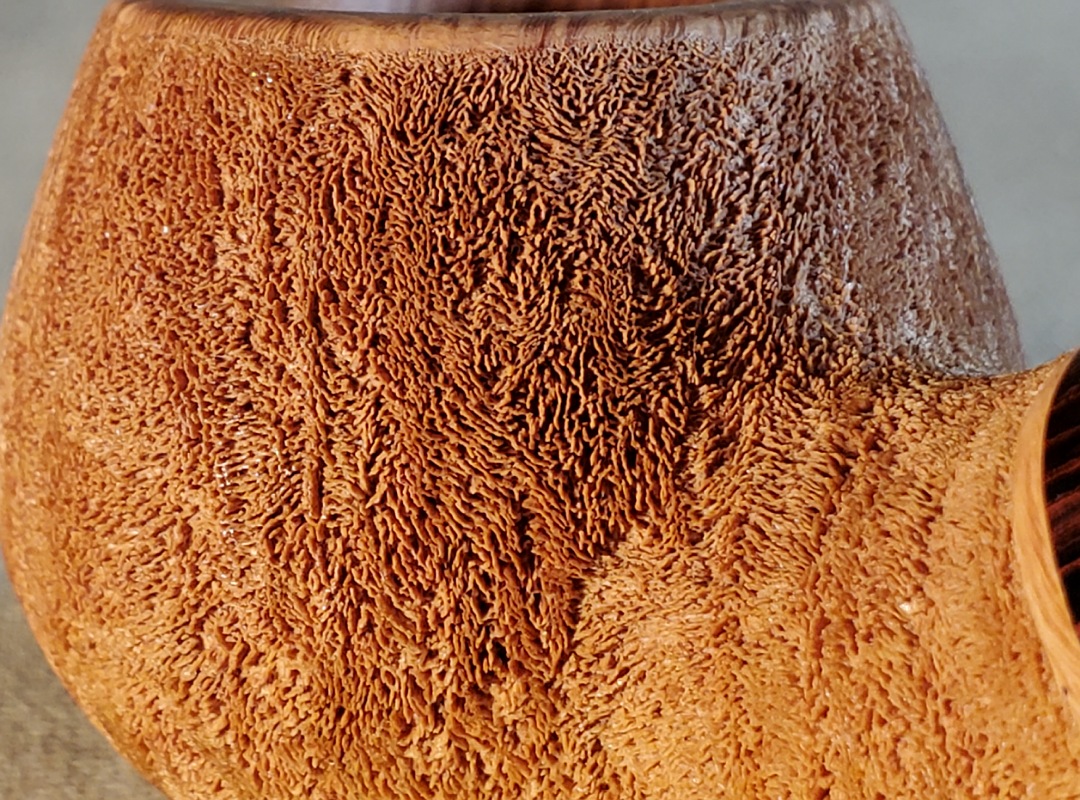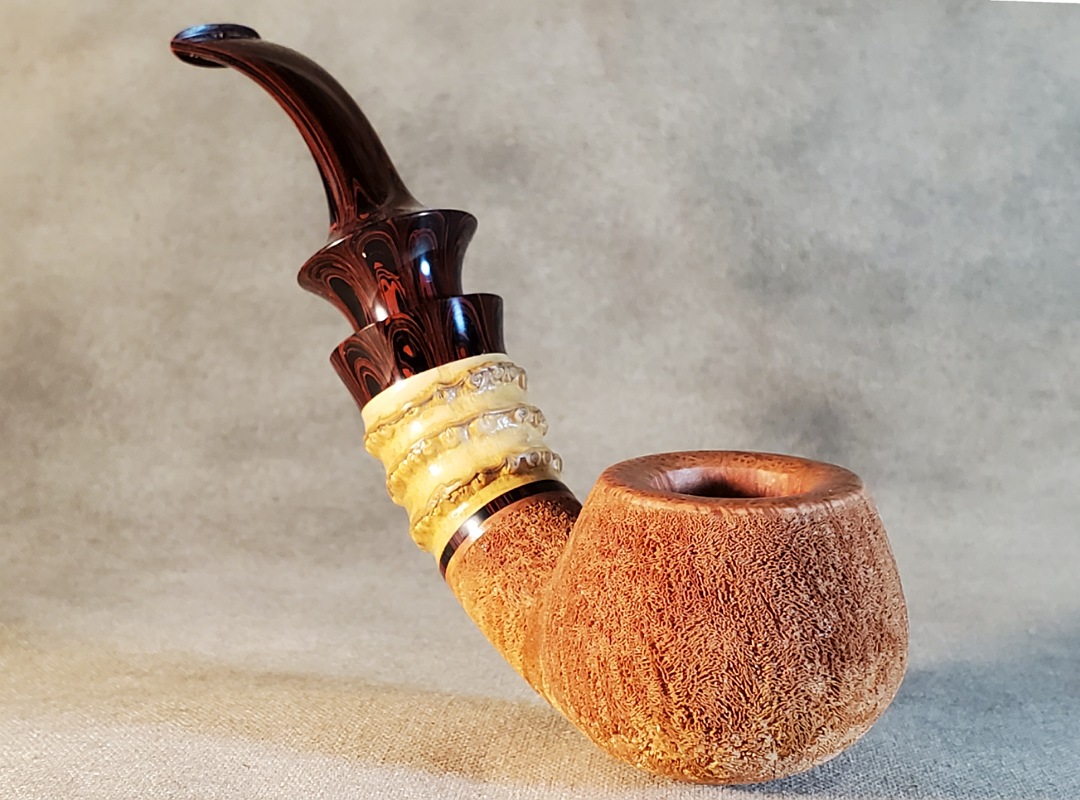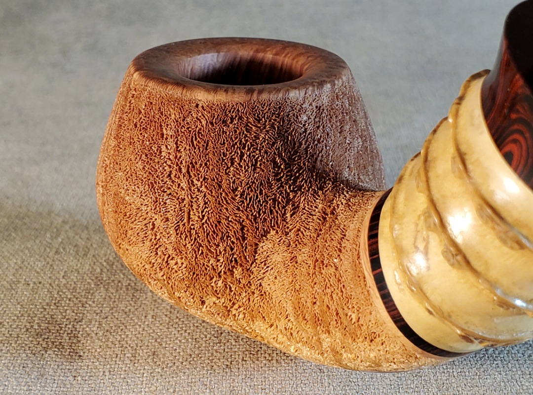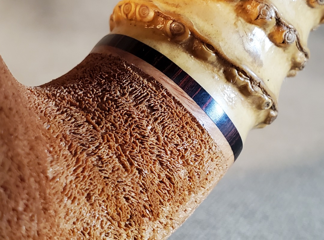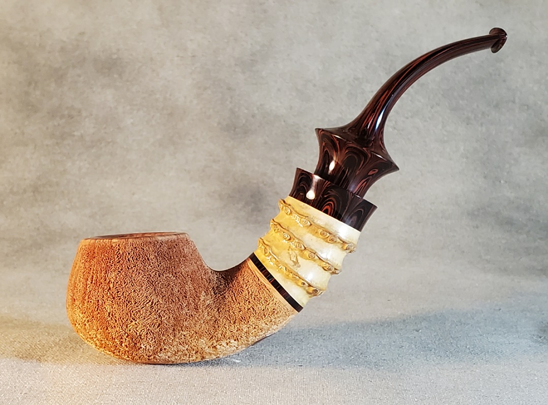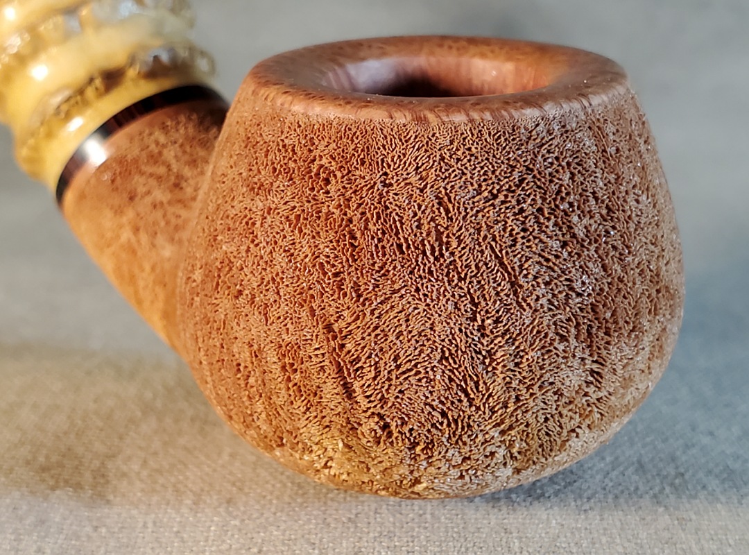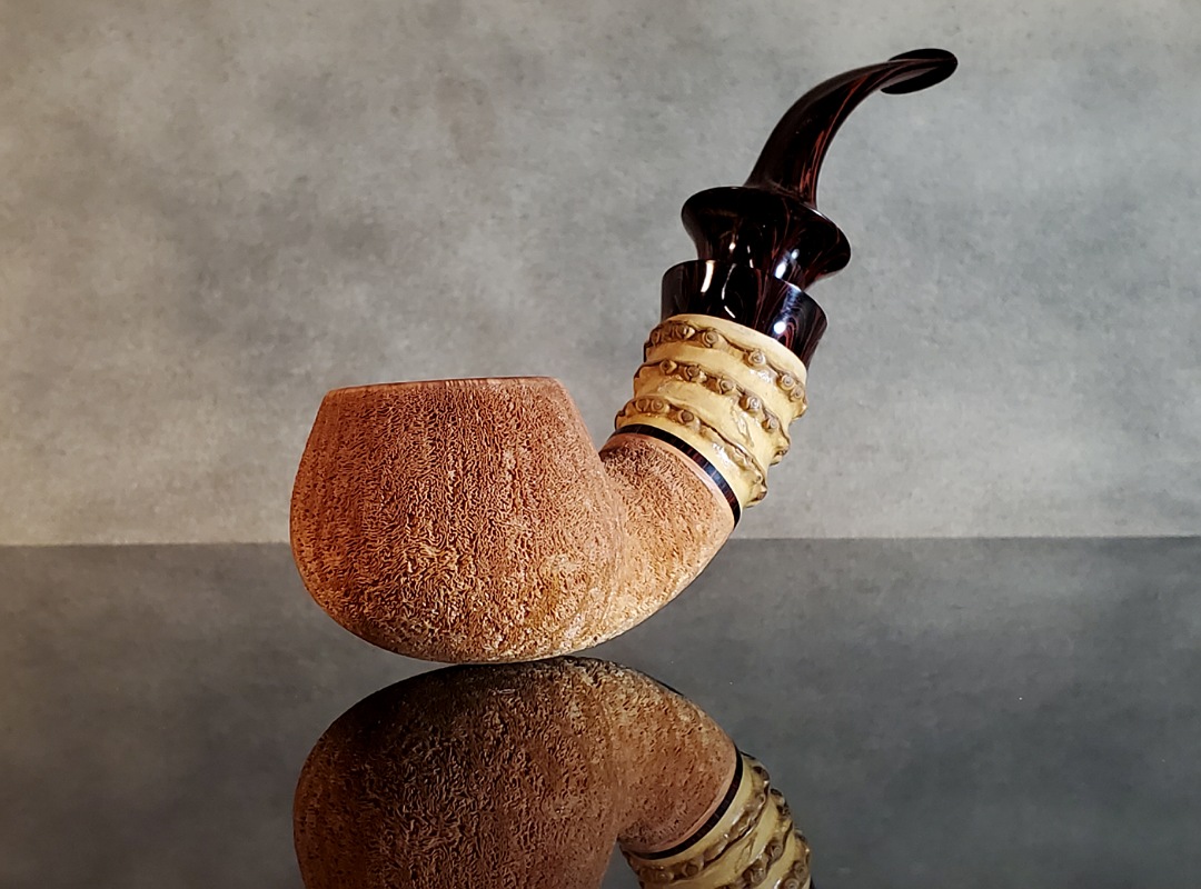 The Cannoy Signature Series represents the best of my work. These pipes combine the highest level of my skills and attention, and the highest quality materials I have access to, and often use my most sacred, proprietary finishes. This Cannoy Signature Series Brandy shaped briar pipe is dressed in my mesmerizing Suedeblast finish. It incorporates a three node natural Bamboo shank reaching over 28mm diameter at its widest! The ferrule and stem are expertly hand-cut from wide diameter NYH German Classic Cumberland Ebonite. The nomenclature features a hand-signed signature in archival ink and substrate, inlaid under a small clear acrylic window.