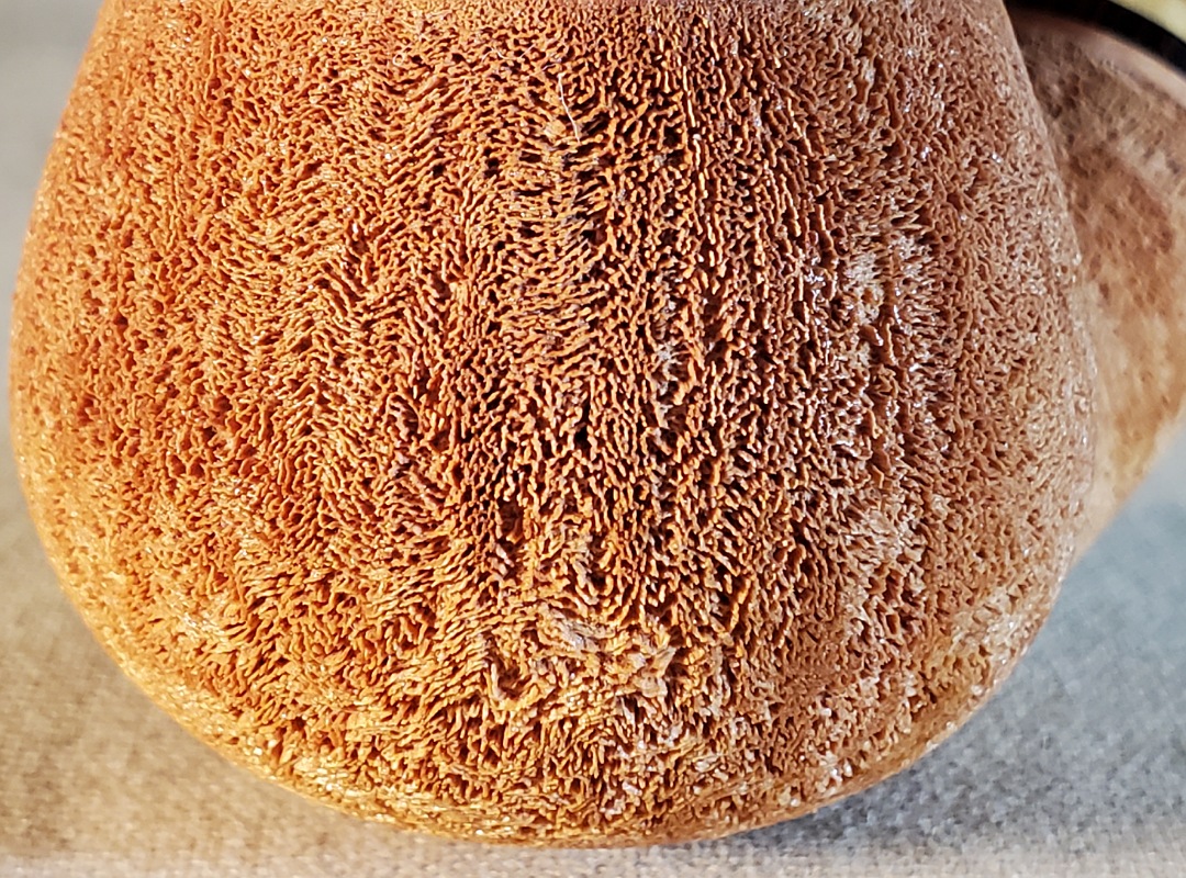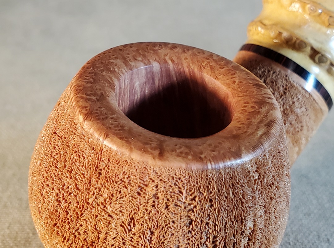 This pipe is 6 inches long from chin to button. The stummel is 1.46 inches tall from base to rim. The chamber is 3/4 inches diameter and 1.12 inches deep. This pipe weighs 74.6 grams (2.63 ounces)