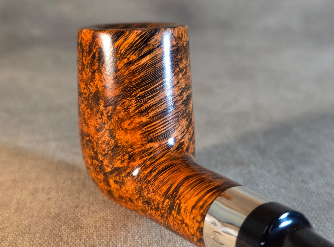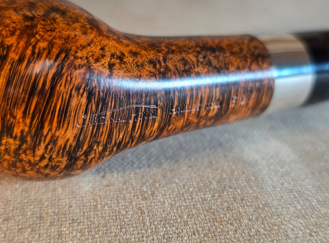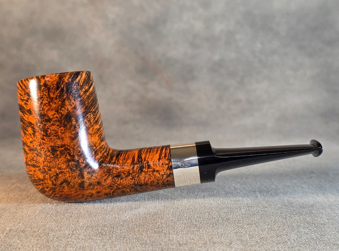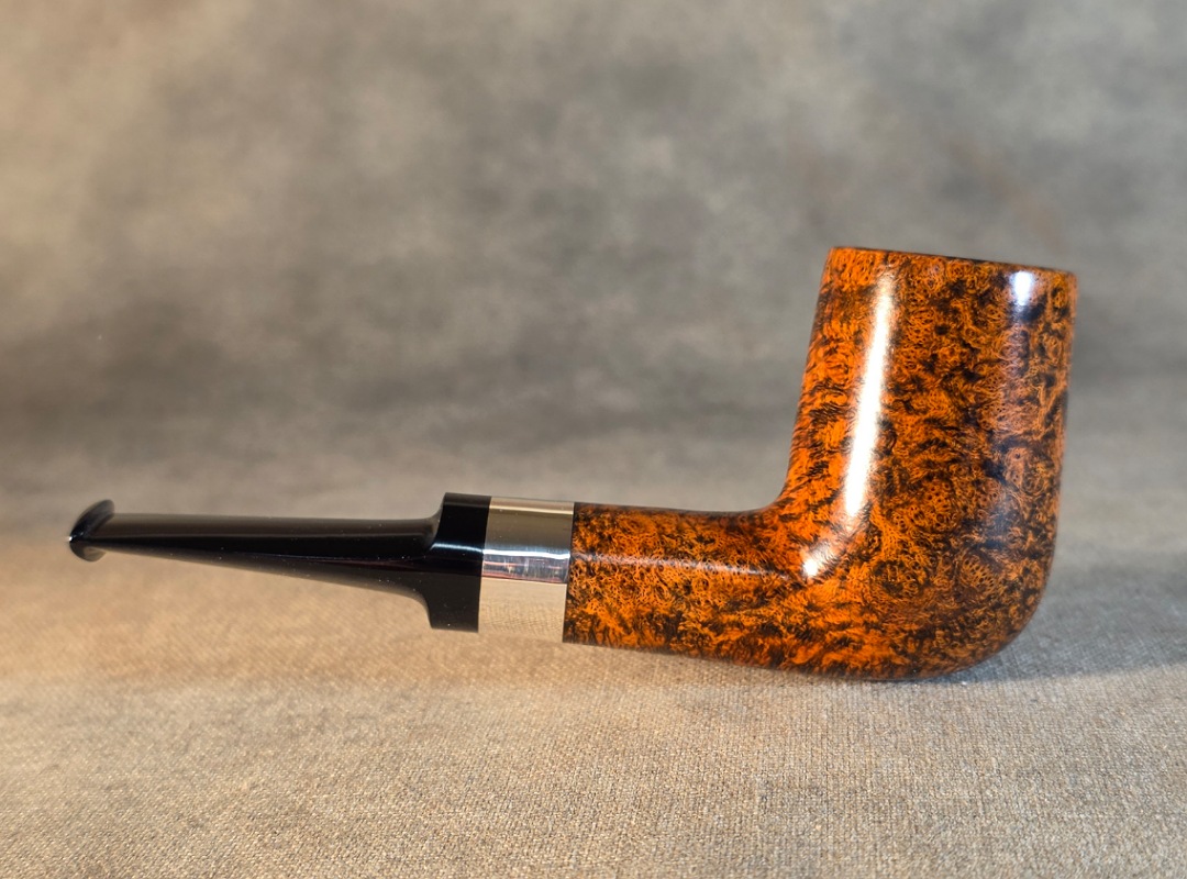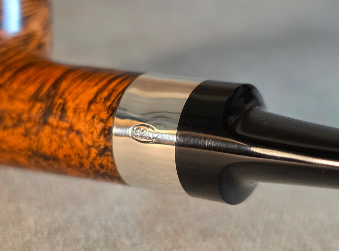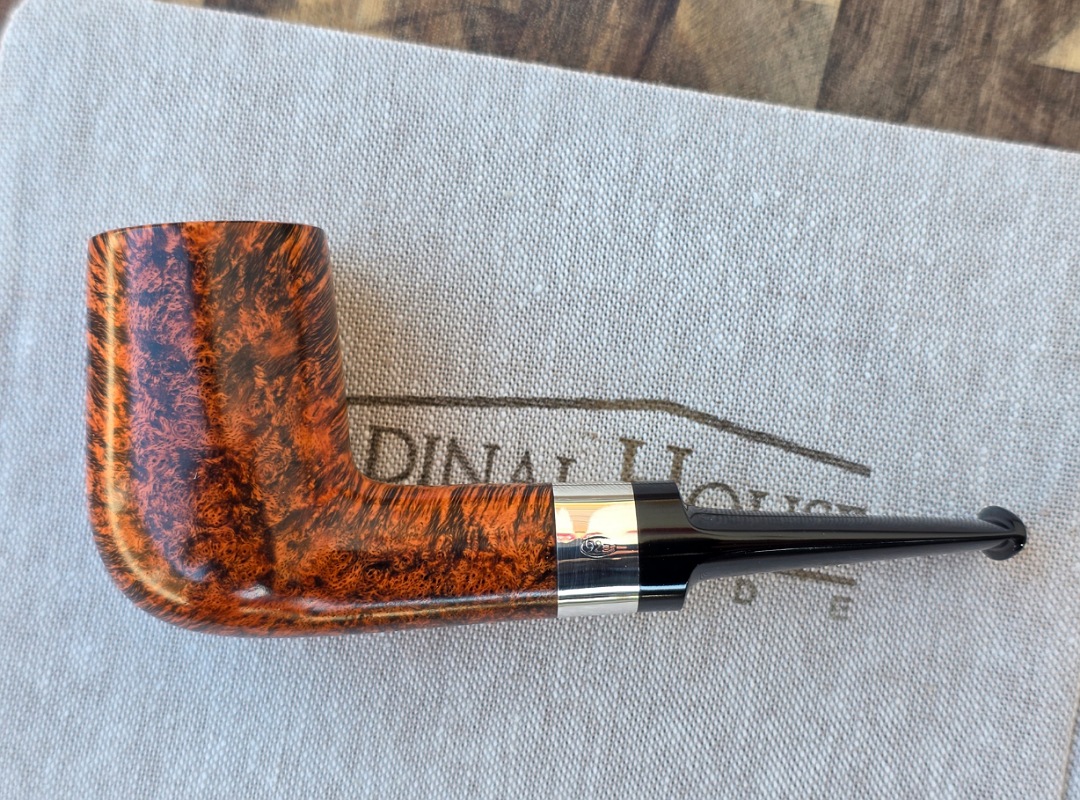 ThisĀ Cardinal House pipes Hollingsworth series Billiard shaped briar pipe highlights gorgeous cross-grain with a high contrast finish. It features a shank band of Sterling Silver. The saddle stem is expertly hand-cut from black NYH German Ebonite rod.