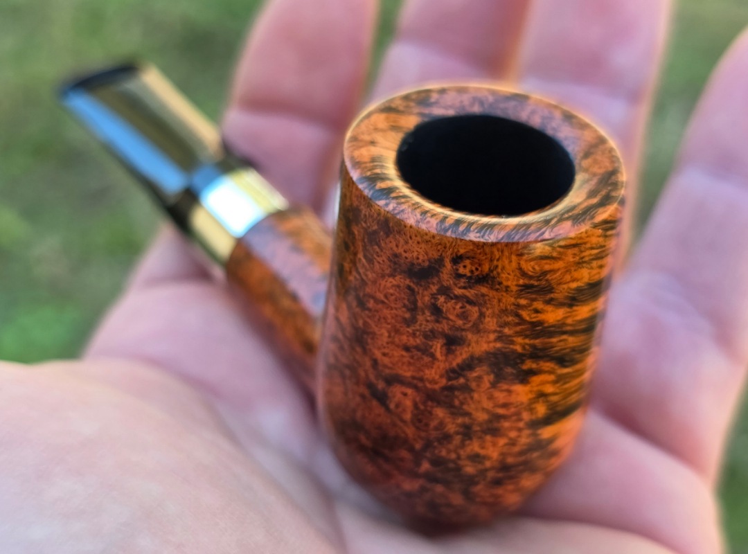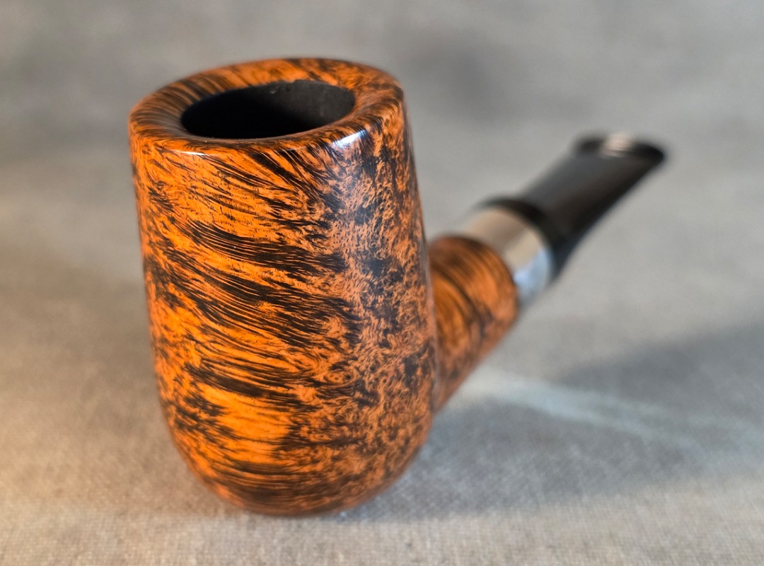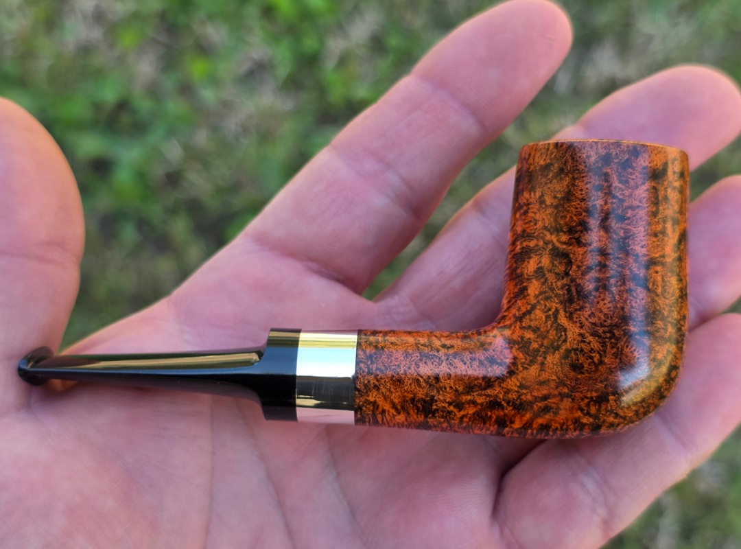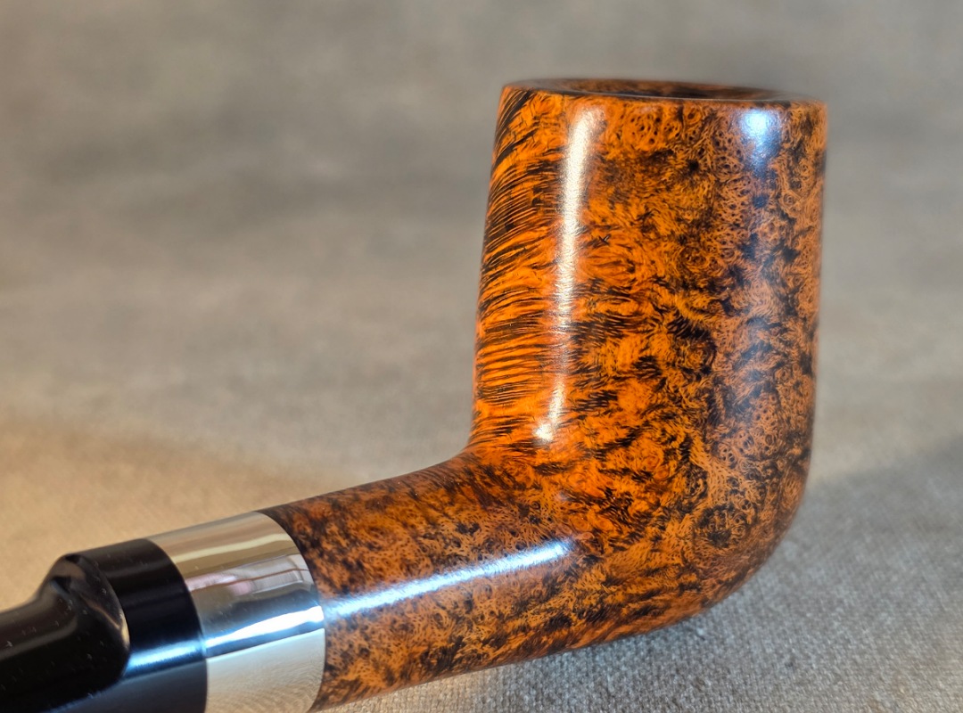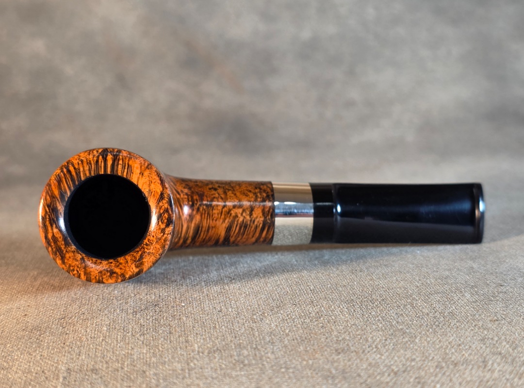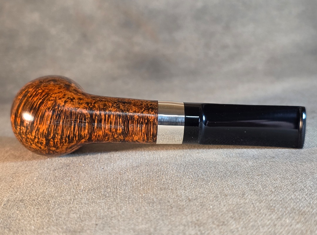 ThisĀ Cardinal House pipes Hollingsworth series Billiard shaped briar pipe highlights gorgeous cross-grain with a high contrast finish. It features a shank band of Sterling Silver. The saddle stem is expertly hand-cut from black NYH German Ebonite rod.