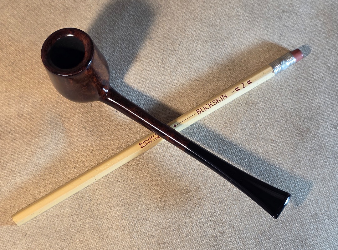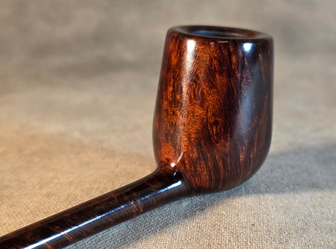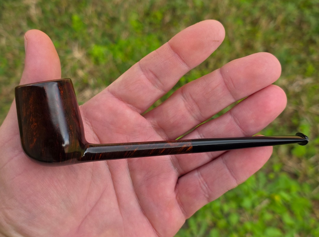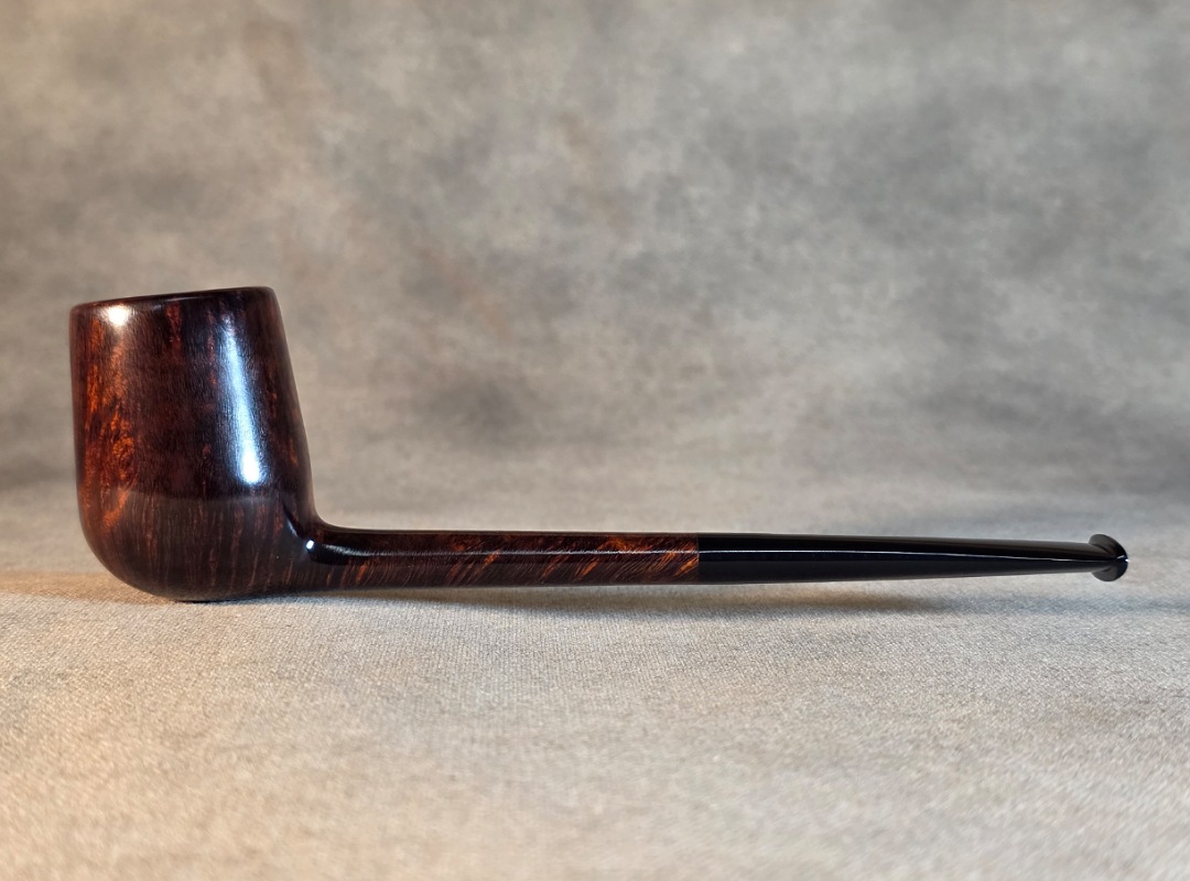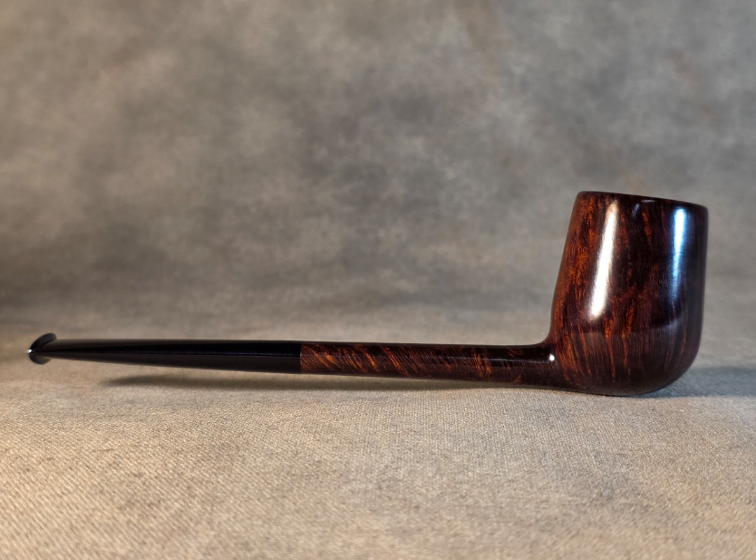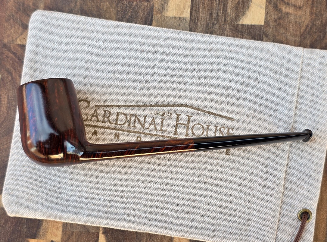 ThisĀ Cardinal House pipes Langford series Bing Billiard shaped briar pipe is finished in a gorgeous deep walnut stain. It features a pencil-thin shank reinforced with stainless steel tubing with a stainless tenon. The stem is expertly hand-cut from black NYH German Ebonite rod.