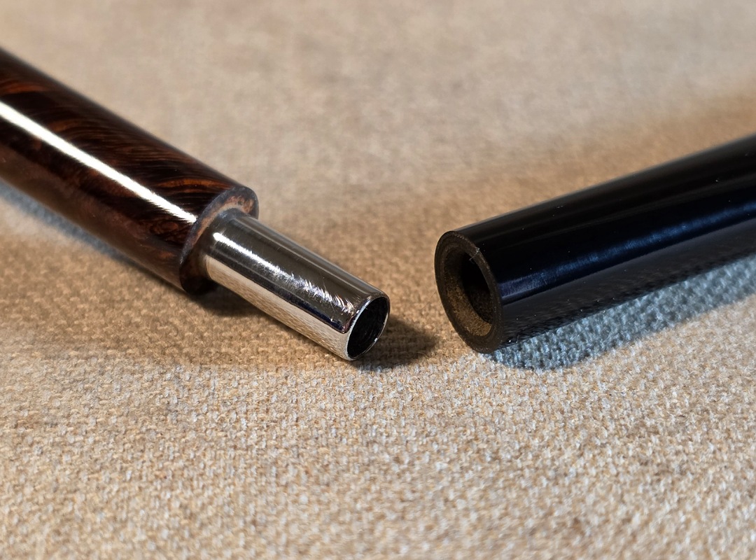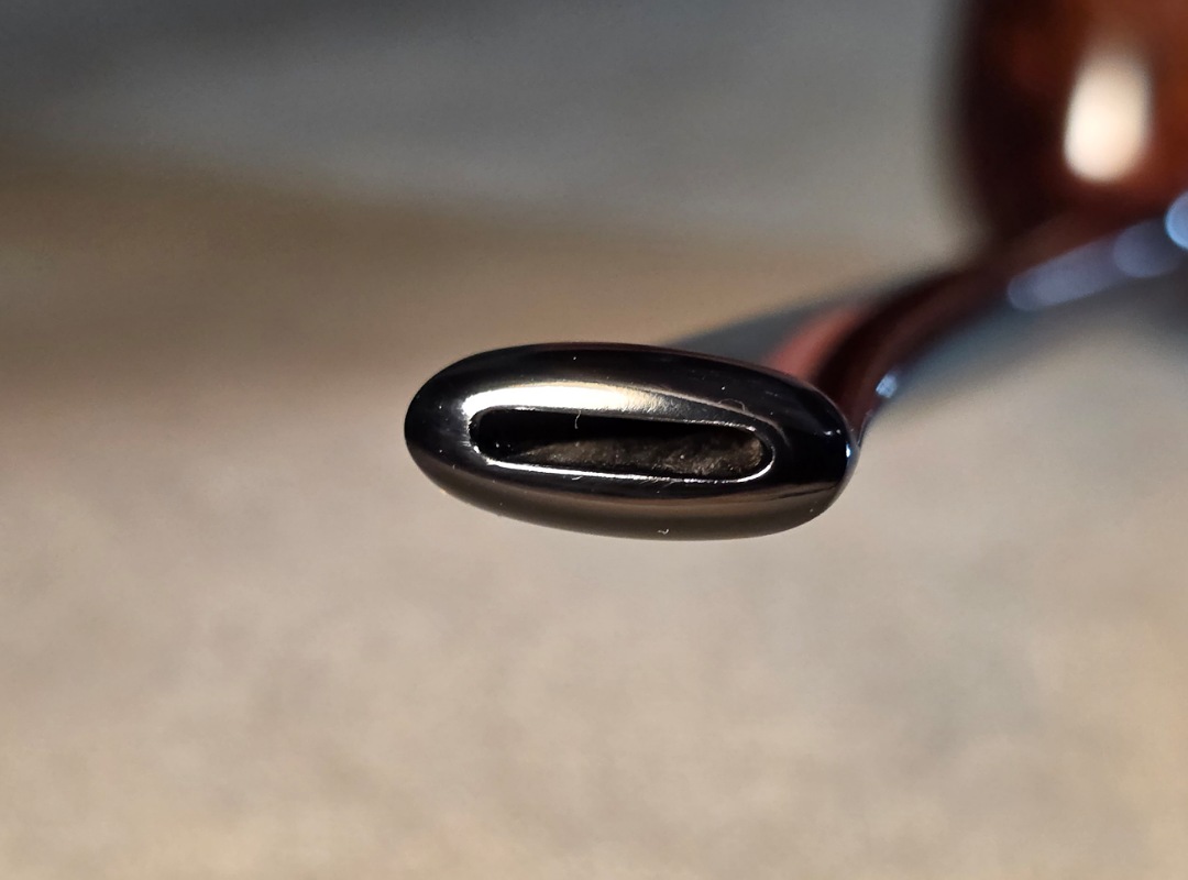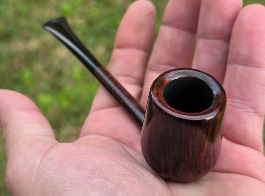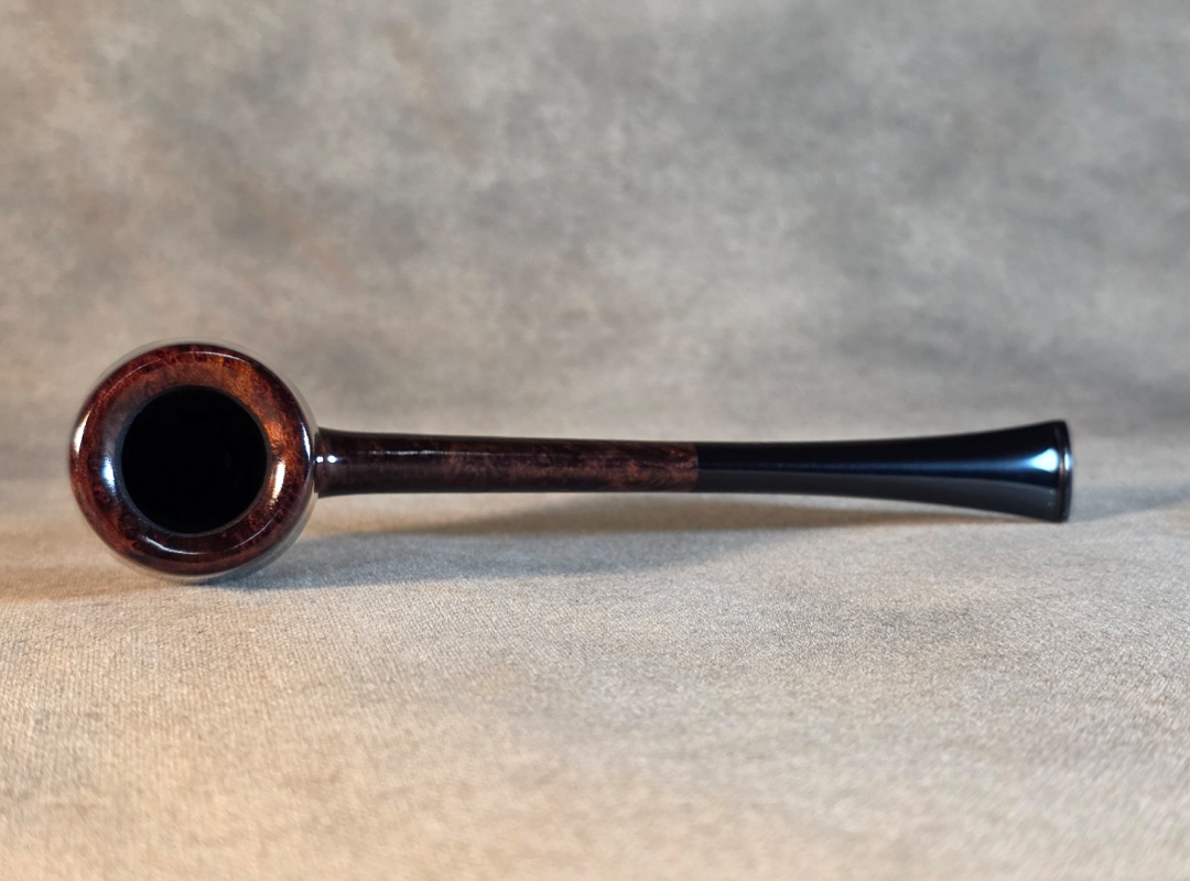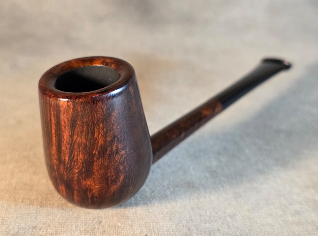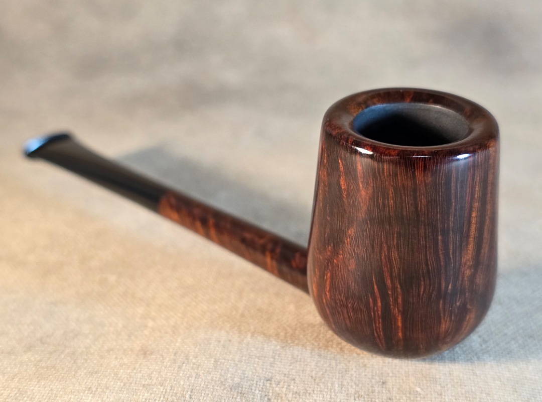 ThisĀ Cardinal House pipes Langford series Bing Billiard shaped briar pipe is finished in a gorgeous deep walnut stain. It features a pencil-thin shank reinforced with stainless steel tubing with a stainless tenon. The stem is expertly hand-cut from black NYH German Ebonite rod.