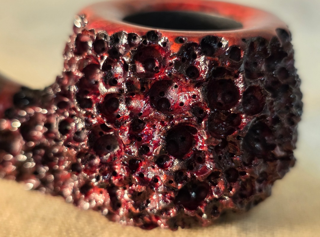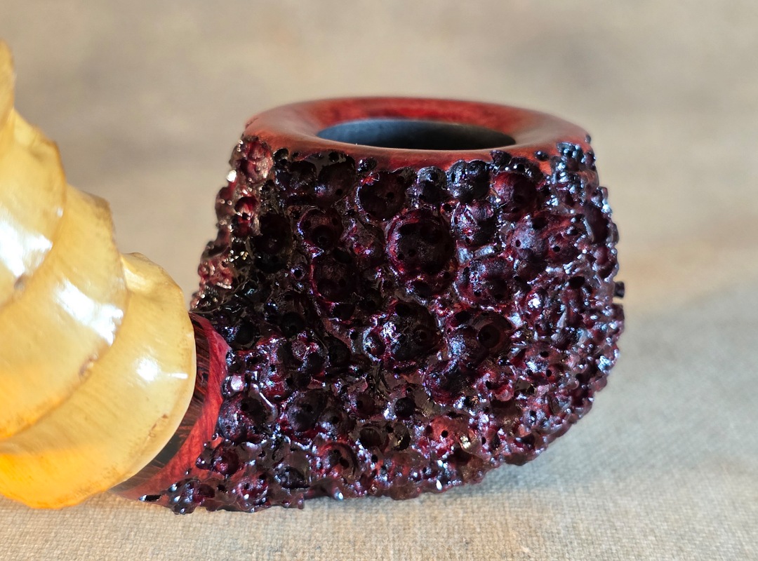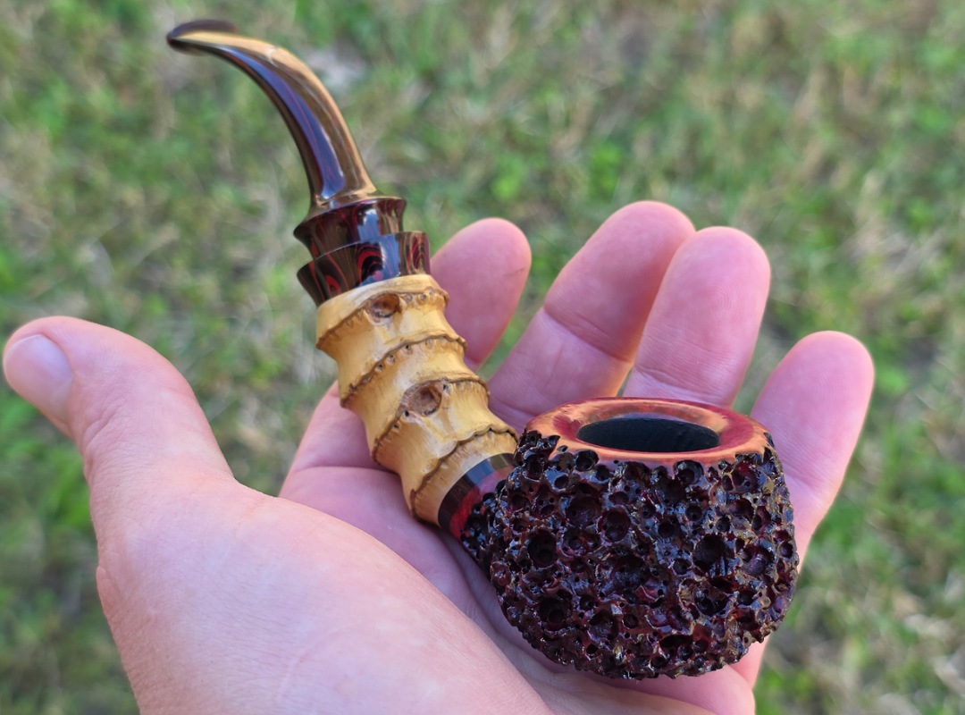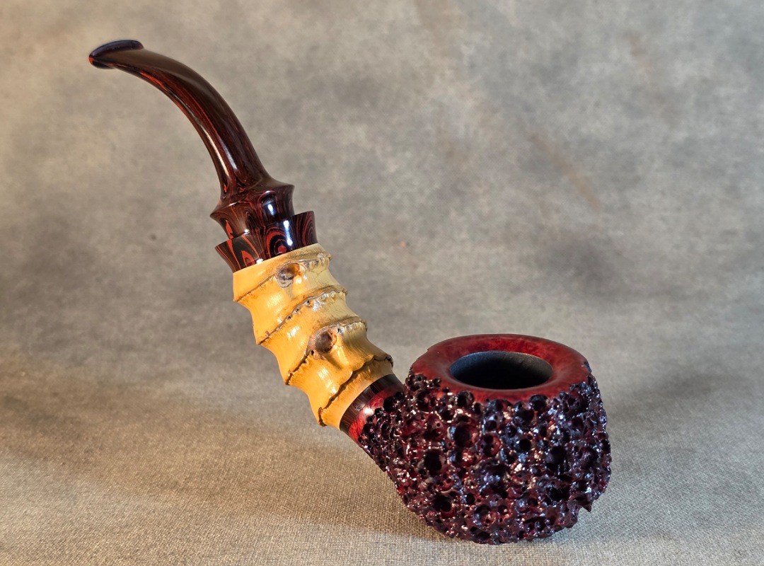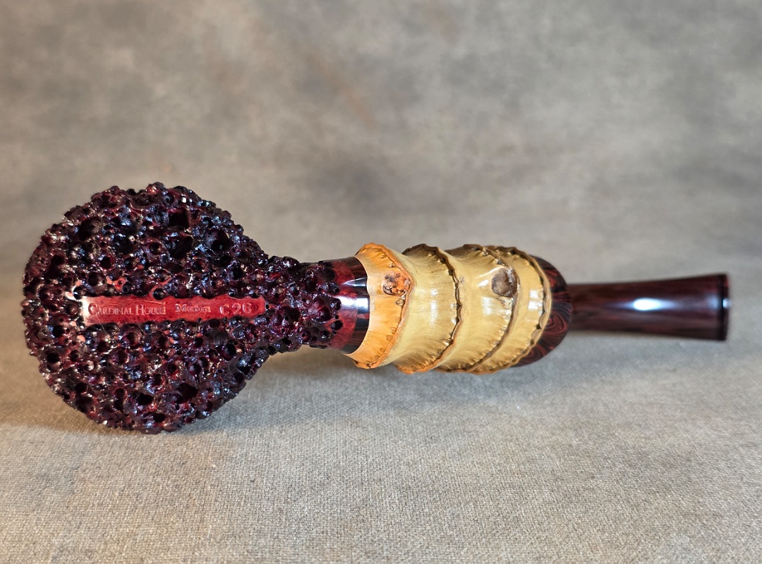 ThisĀ Cardinal House pipes Morton series Bent Brandy shaped briar pipe is painstakingly carved in my deep and highly detailed “Lava Rock” style finish. It features a shank of gorgeous four-node natural Bamboo. The stem is expertly hand-cut from NYH German Classic Cumberland Ebonite rod.