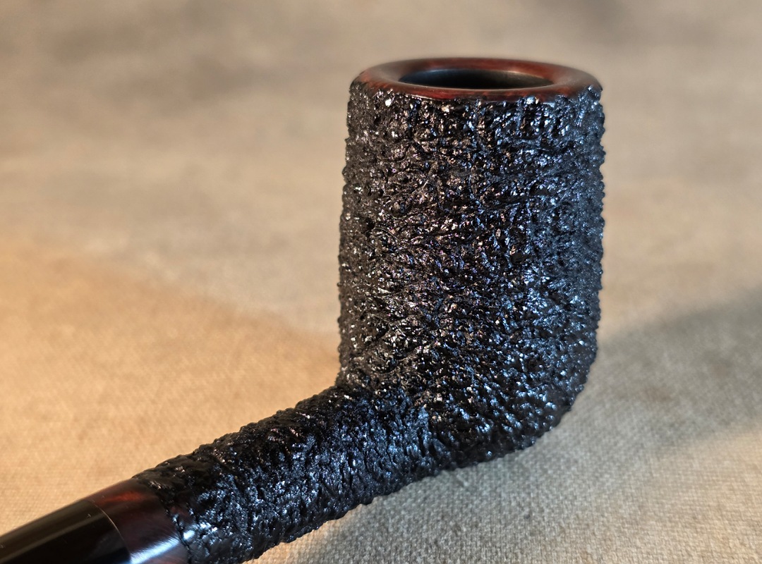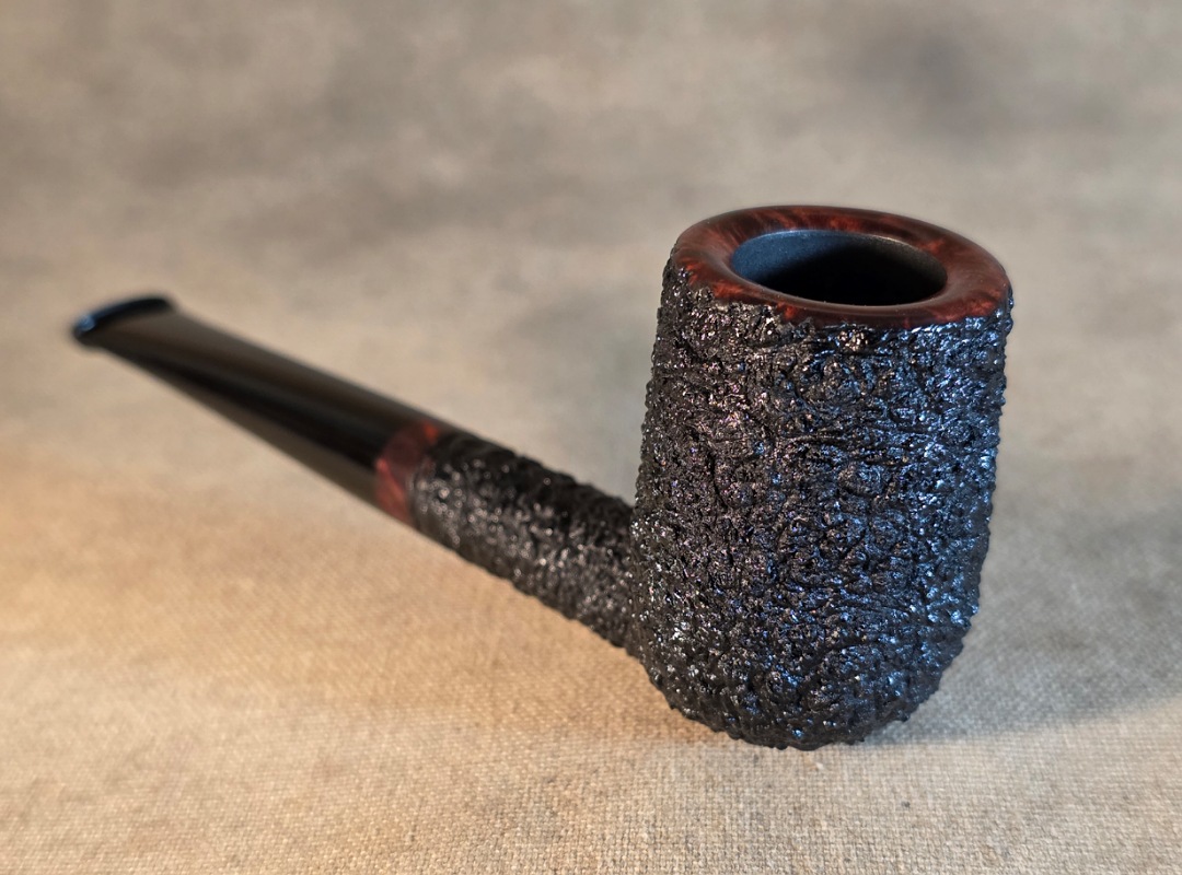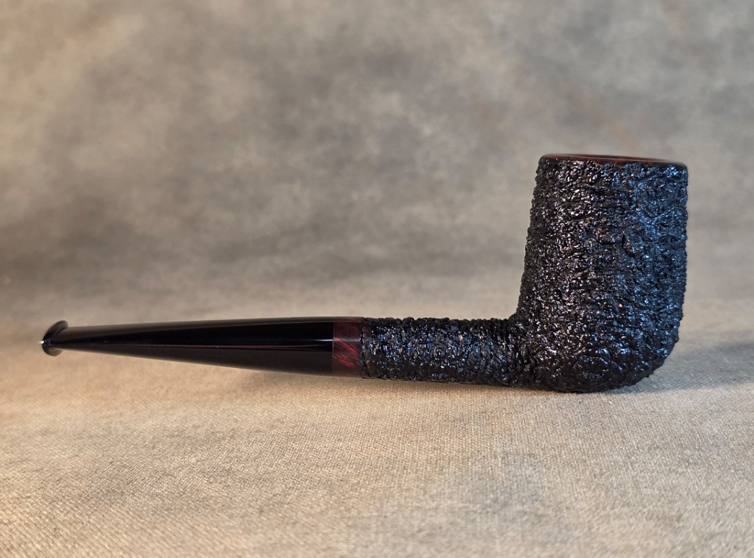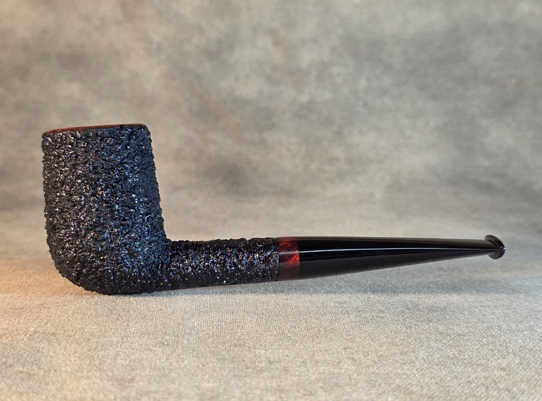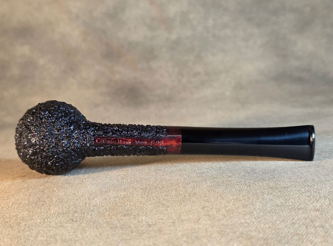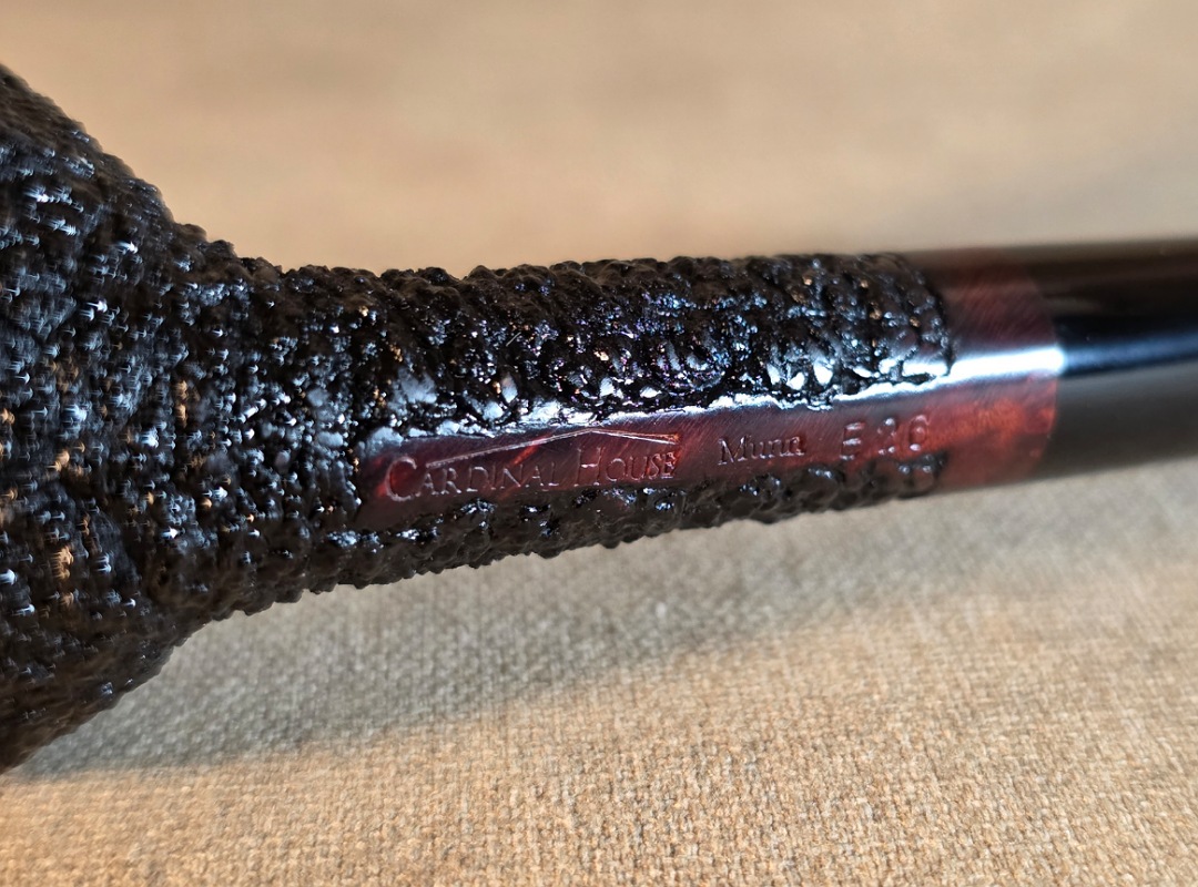 ThisĀ Cardinal House pipes Munn series Billiard shaped briar pipe is finished in a black stained traditional rustication with smooth Mahogany accents. The stem is expertly hand-cut from black NYH German Ebonite rod.