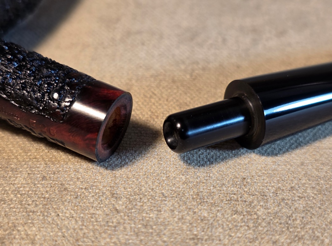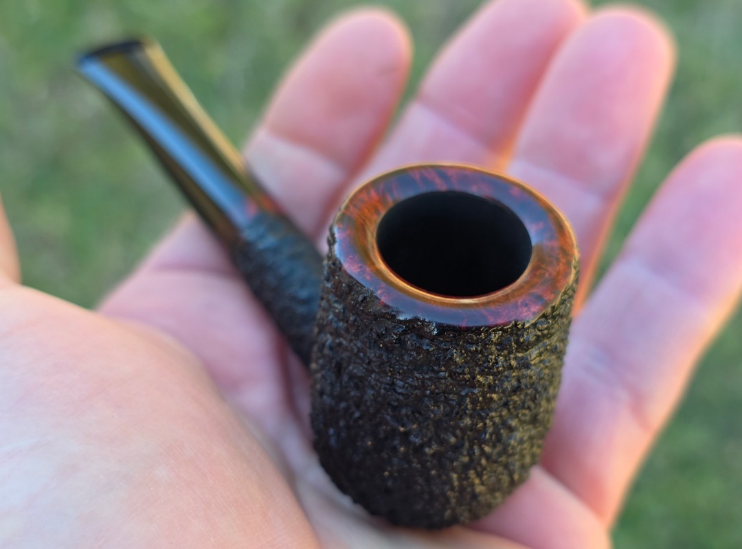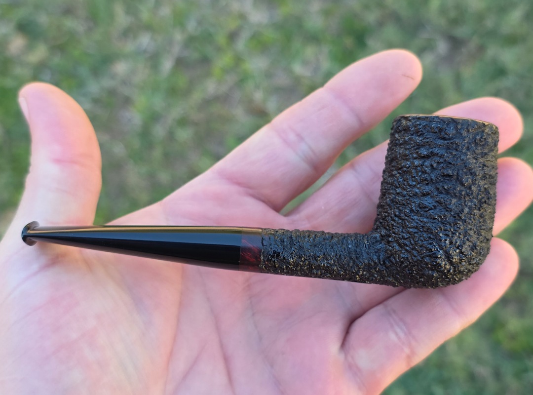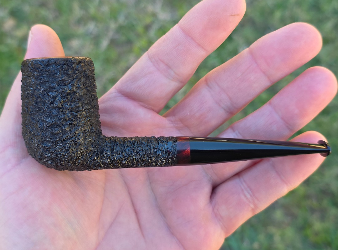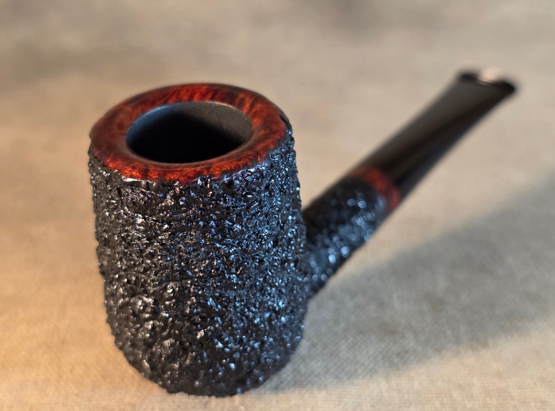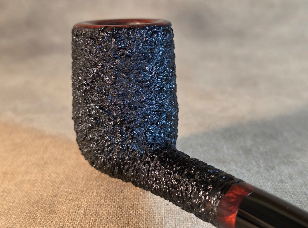 ThisĀ Cardinal House pipes Munn series Billiard shaped briar pipe is finished in a black stained traditional rustication with smooth Mahogany accents. The stem is expertly hand-cut from black NYH German Ebonite rod.