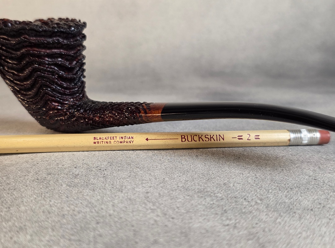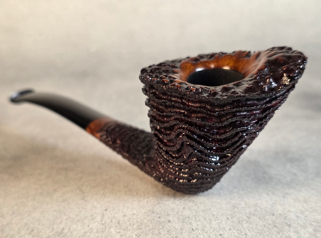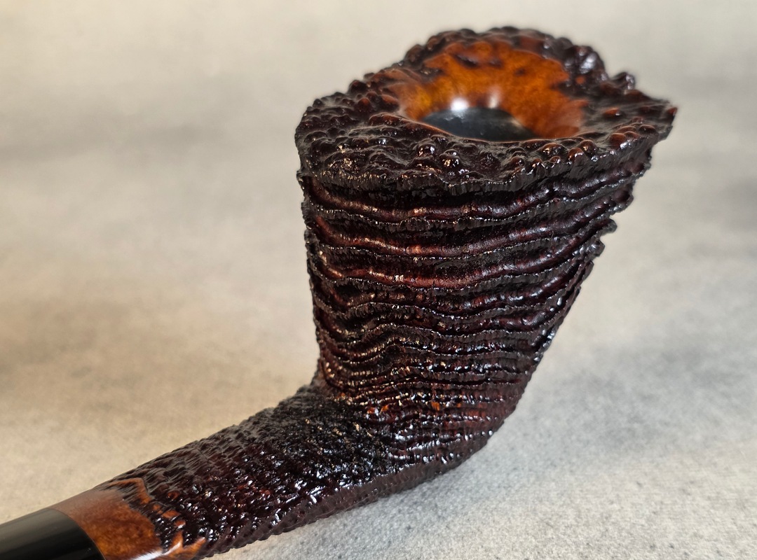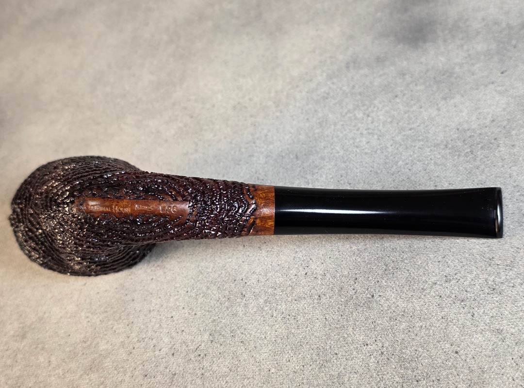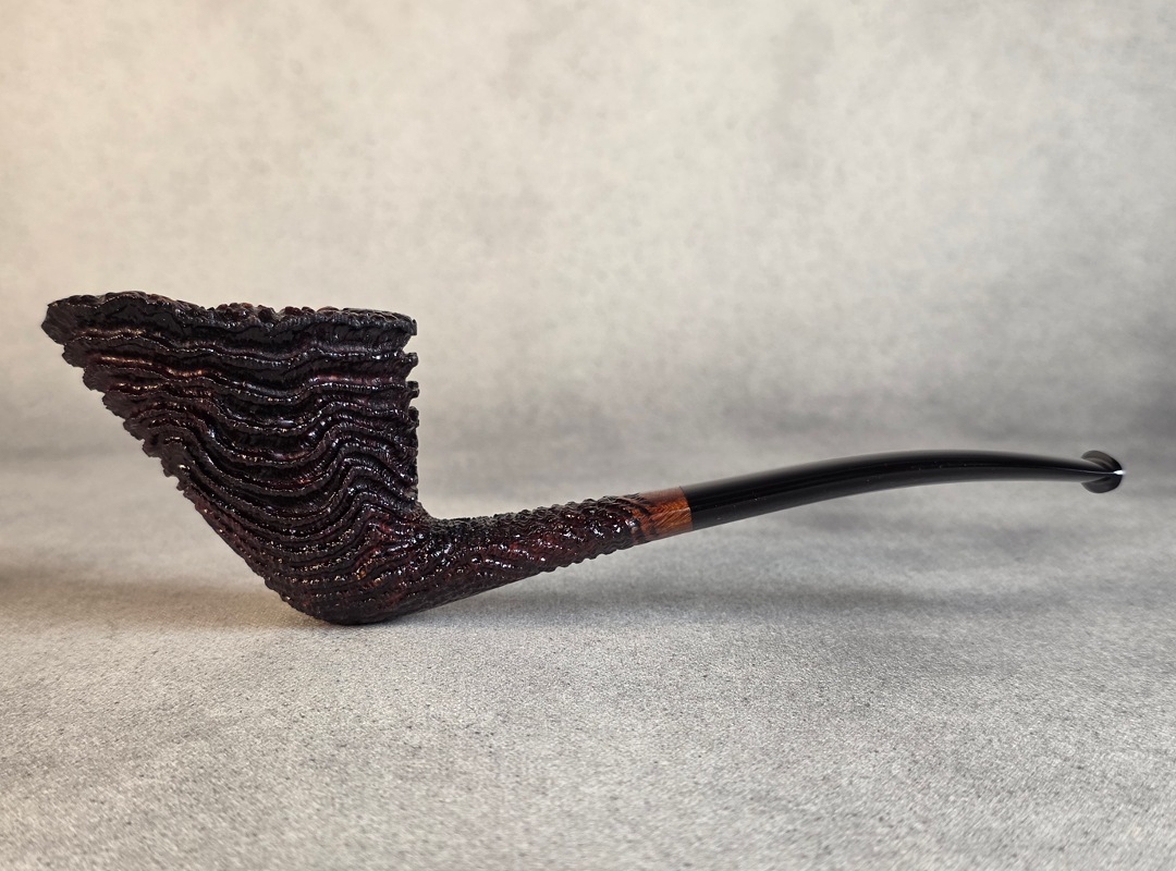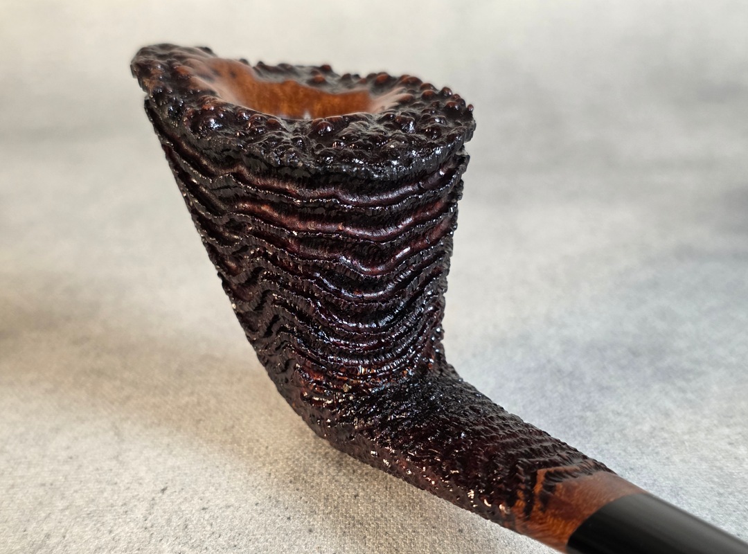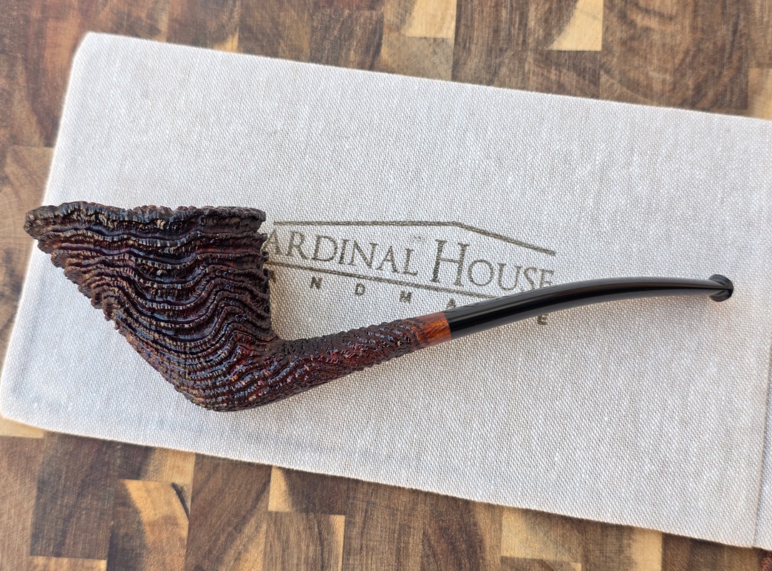 This Cardinal House pipes Munn series Freehand Dublin shaped briar pipe is finished in a gorgeous “ring-blast” style carved rustication. The thin/wide shank is reinforced with stainless steel tubing with a stainless tenon. The stem is expertly hand-cut from black NYH German Ebonite rod.