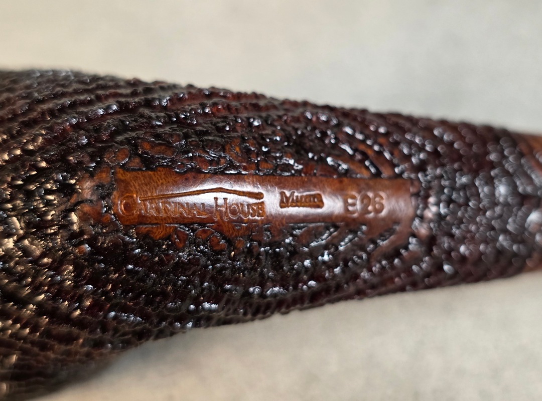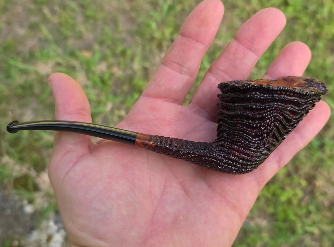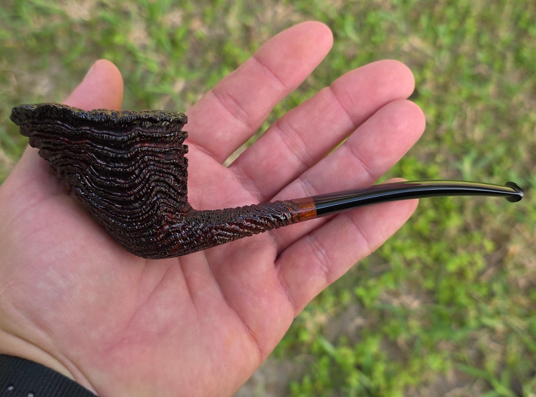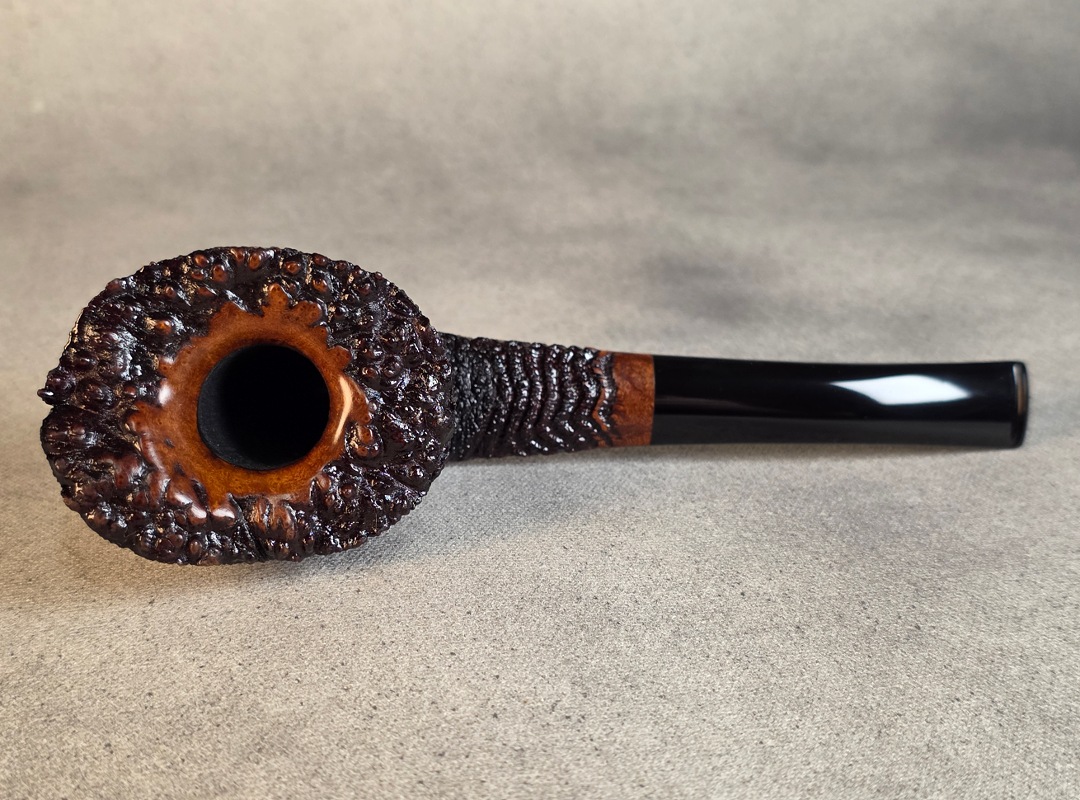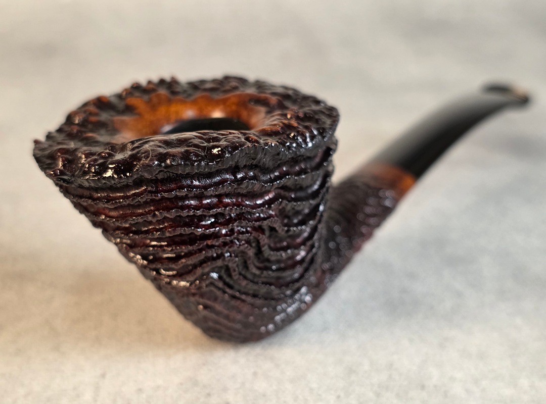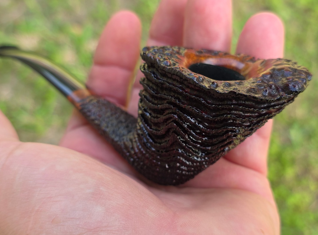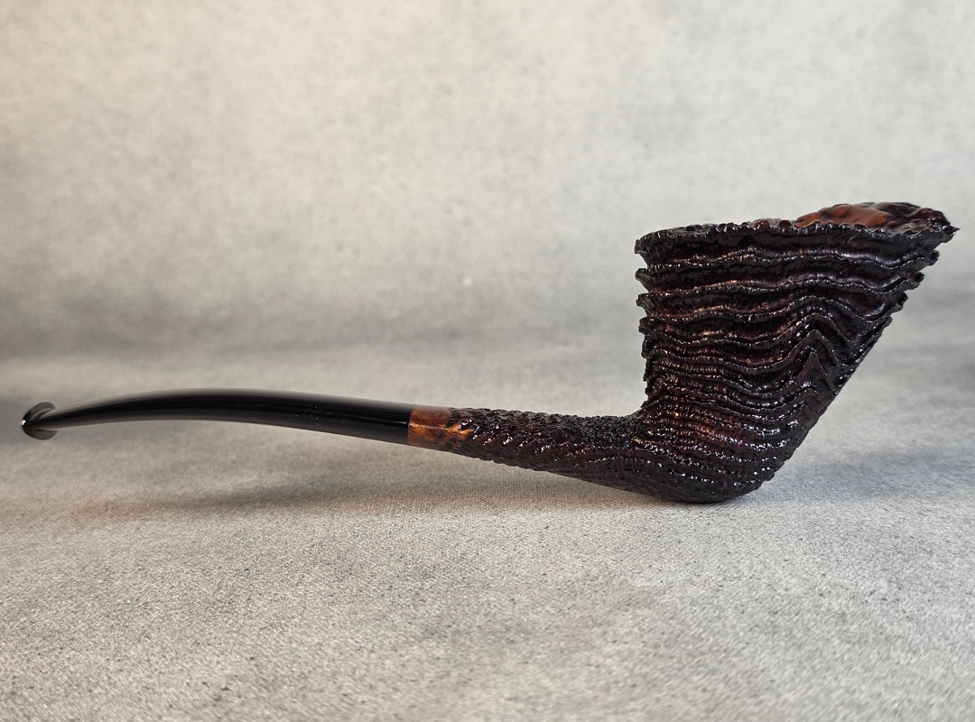 This Cardinal House pipes Munn series Freehand Dublin shaped briar pipe is finished in a gorgeous “ring-blast” style carved rustication. The thin/wide shank is reinforced with stainless steel tubing with a stainless tenon. The stem is expertly hand-cut from black NYH German Ebonite rod.