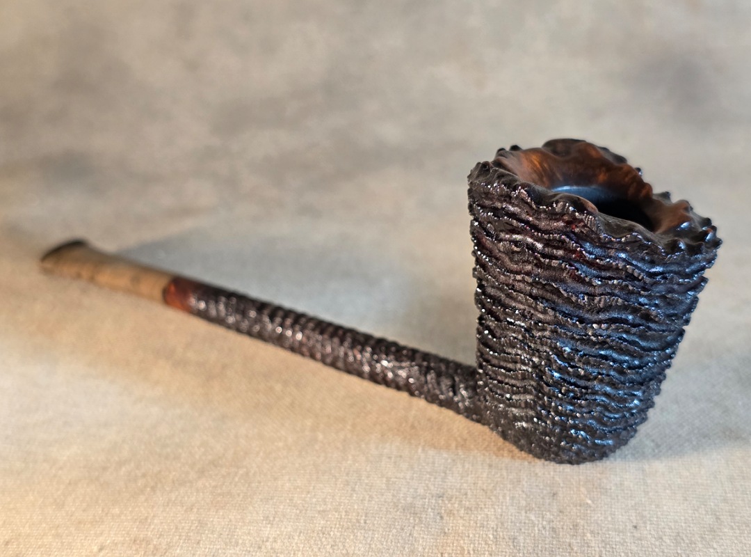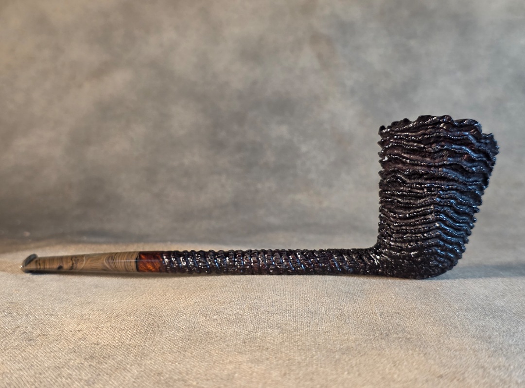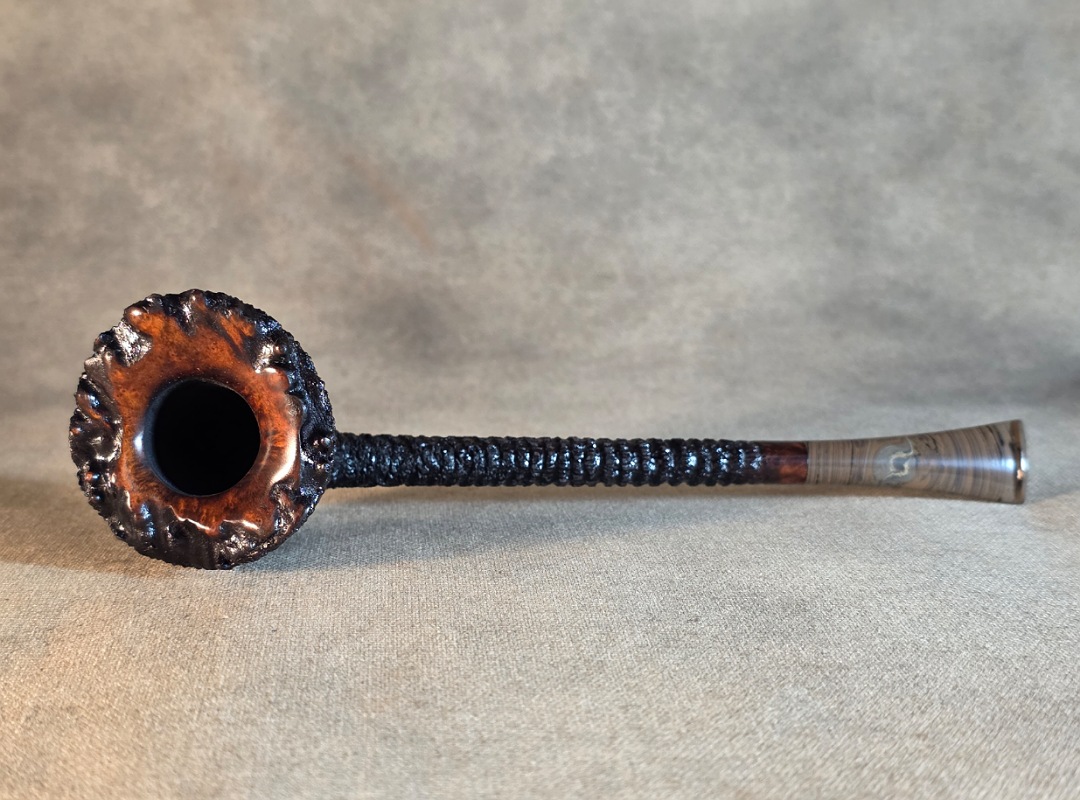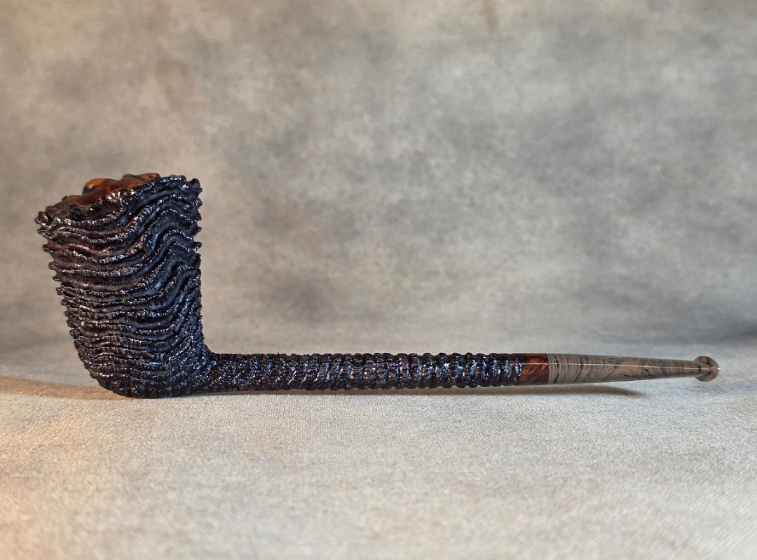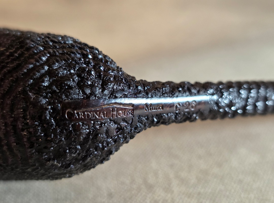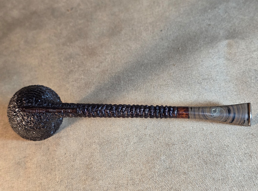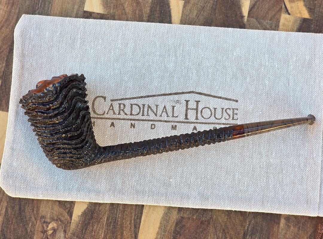 ThisĀ Cardinal House pipes Munn series Dublin shaped briar pipe is finished in a gorgeous “ring-blast” style carved rustication. The pencil-thin shank is reinforced with stainless steel tubing with a stainless tenon. The stem is expertly hand-cut from Limited Edition SEM Brindled Ebonite rod.