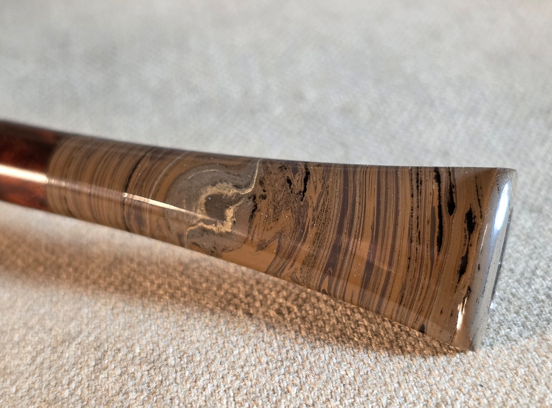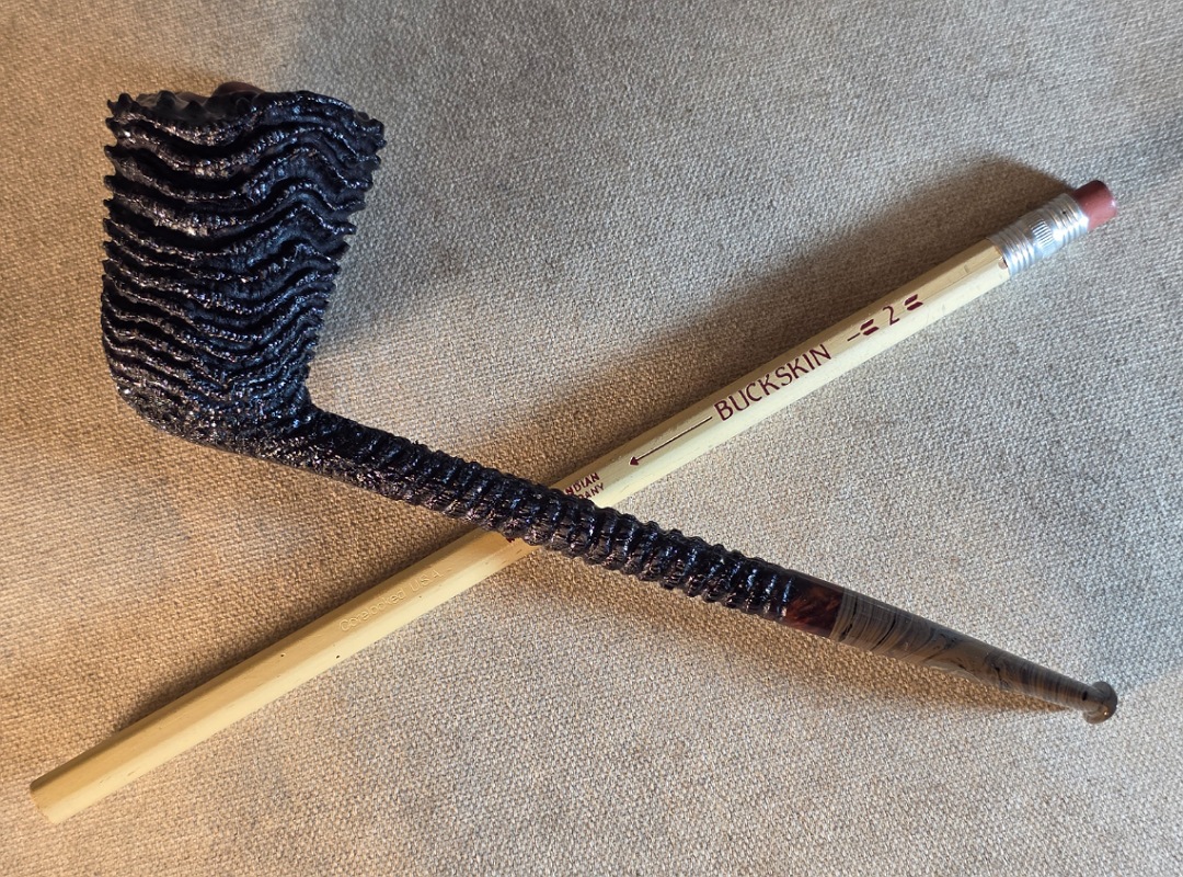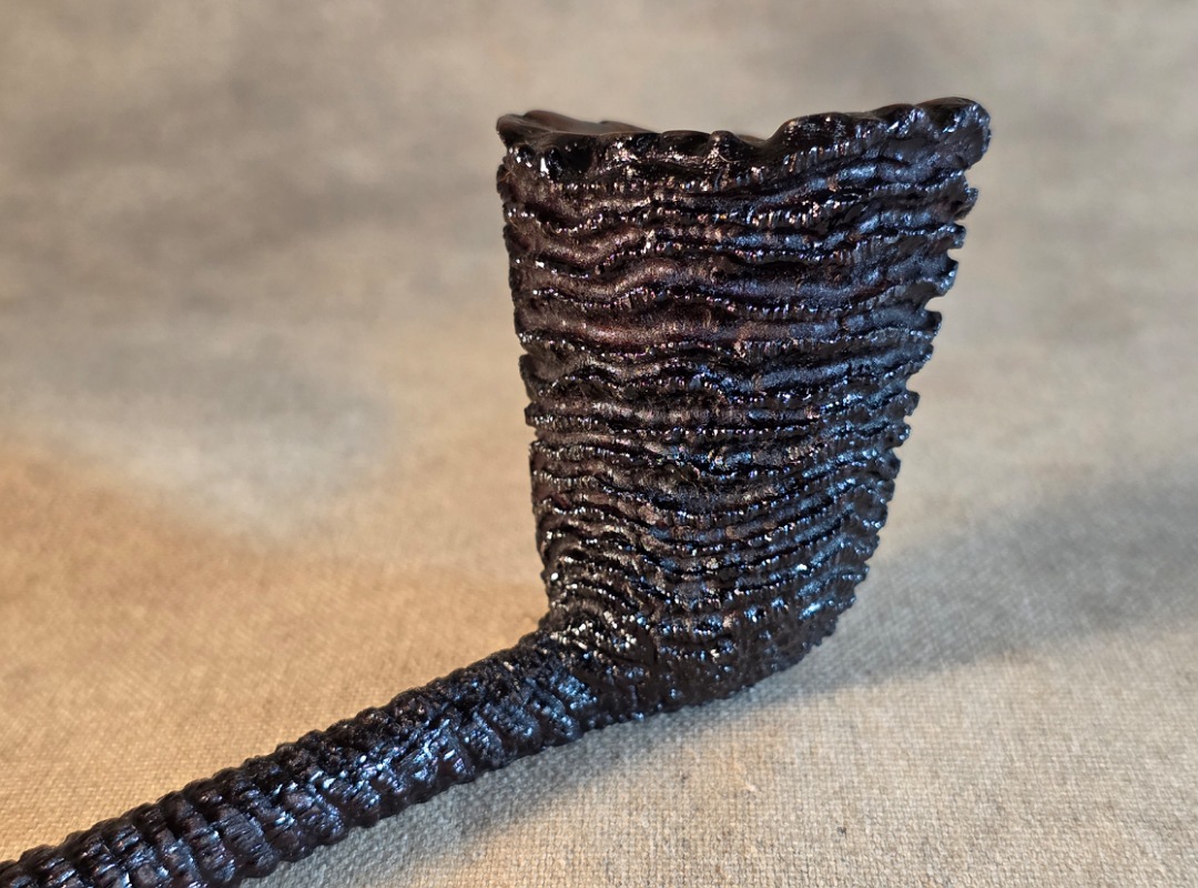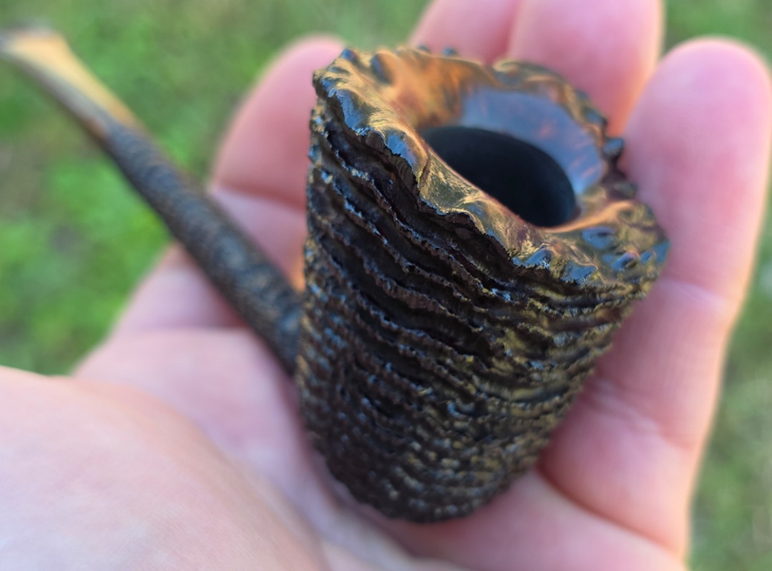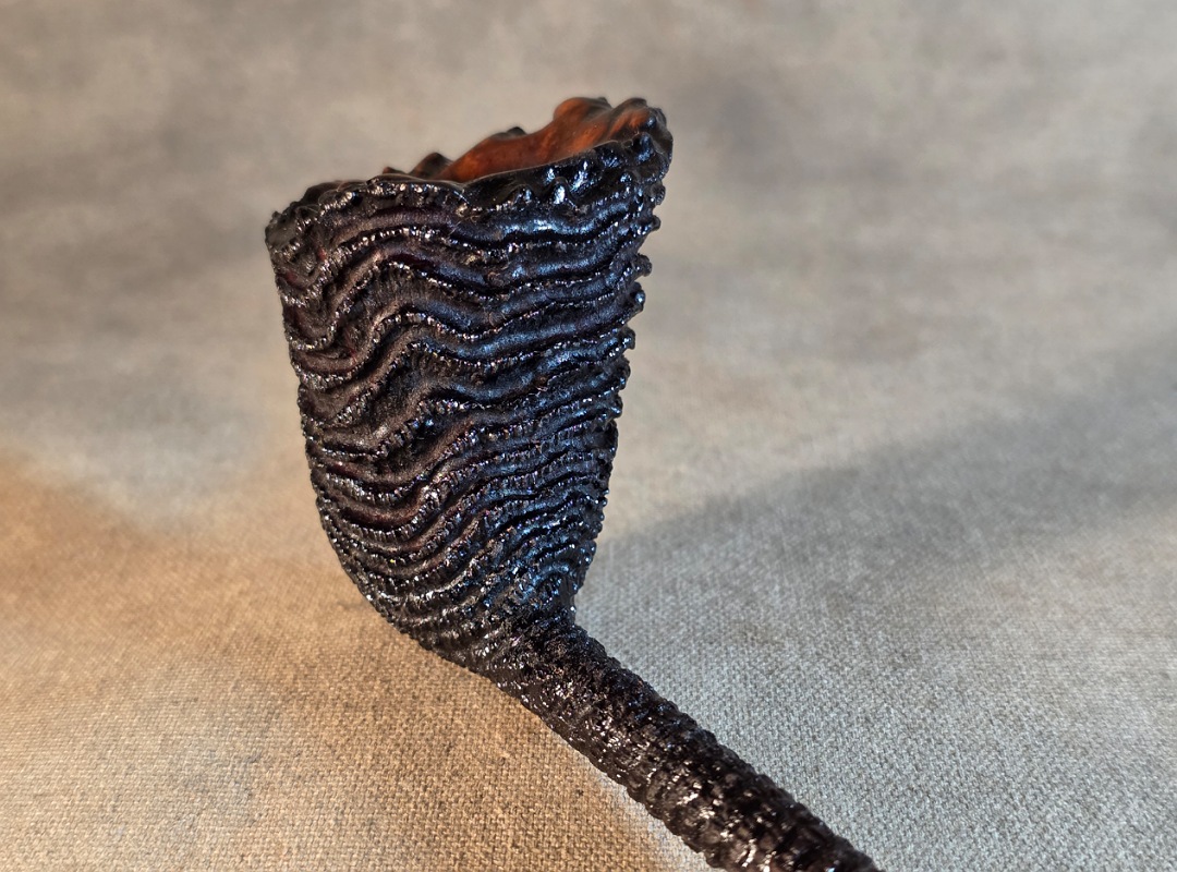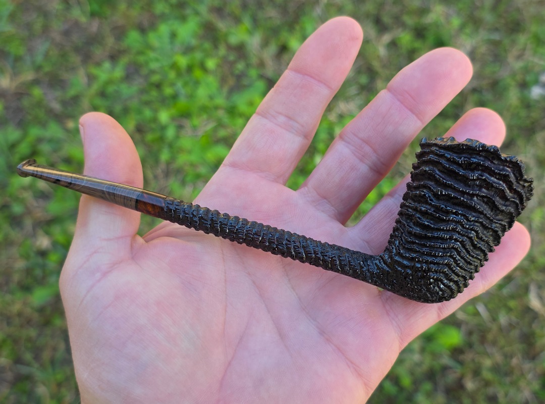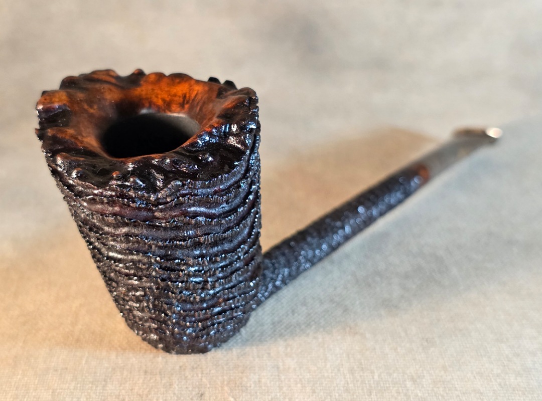 ThisĀ Cardinal House pipes Munn series Dublin shaped briar pipe is finished in a gorgeous “ring-blast” style carved rustication. The pencil-thin shank is reinforced with stainless steel tubing with a stainless tenon. The stem is expertly hand-cut from Limited Edition SEM Brindled Ebonite rod.