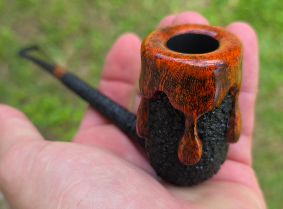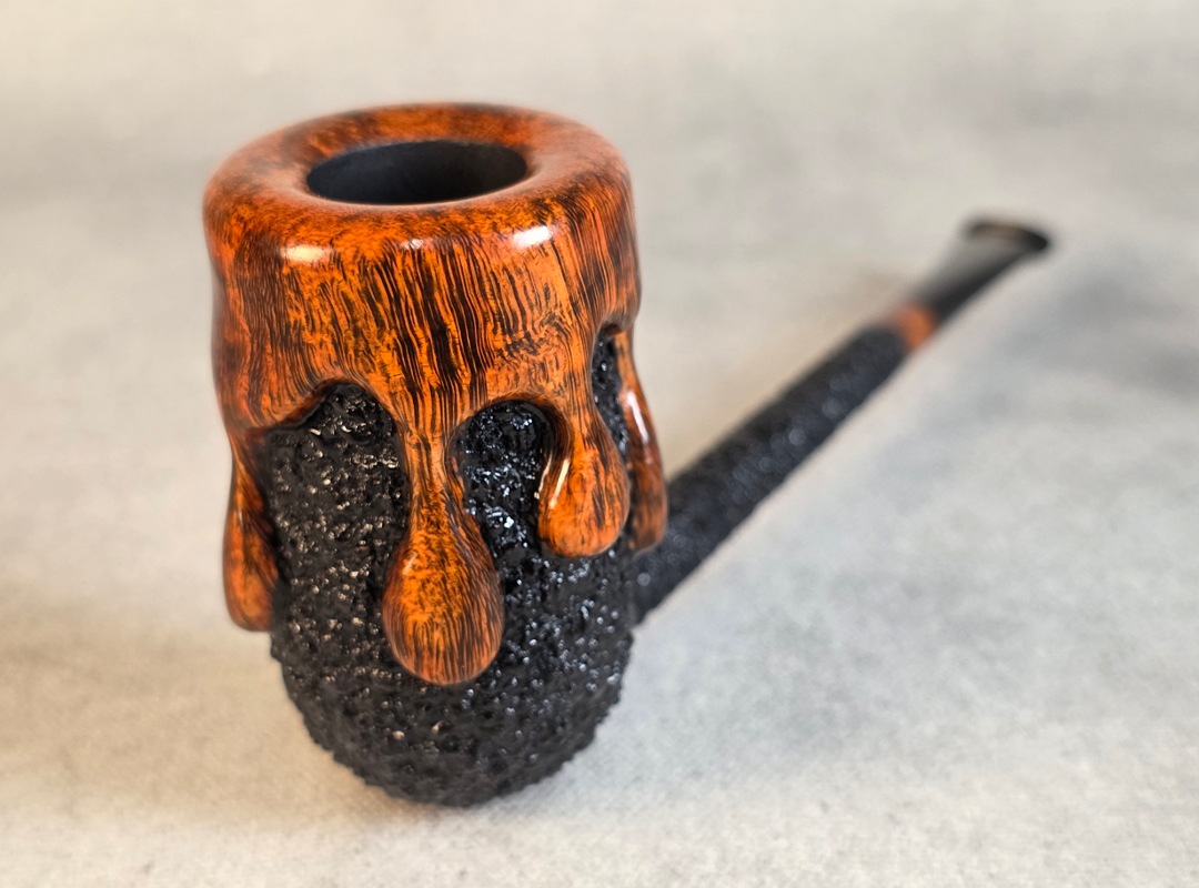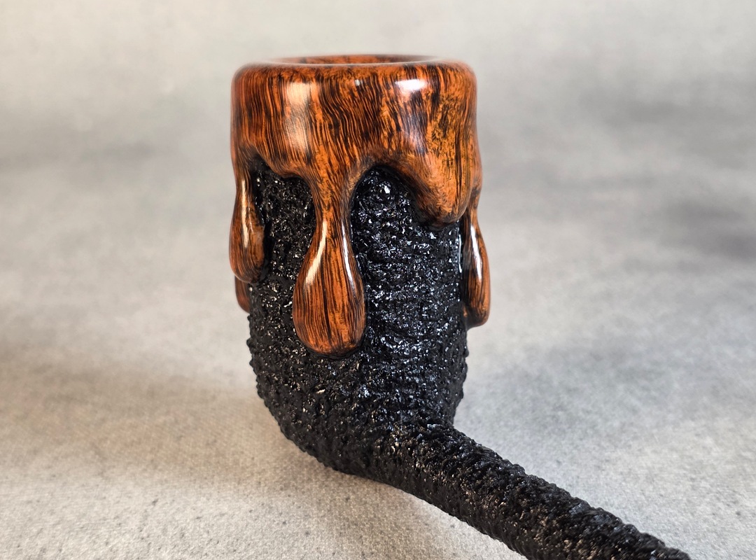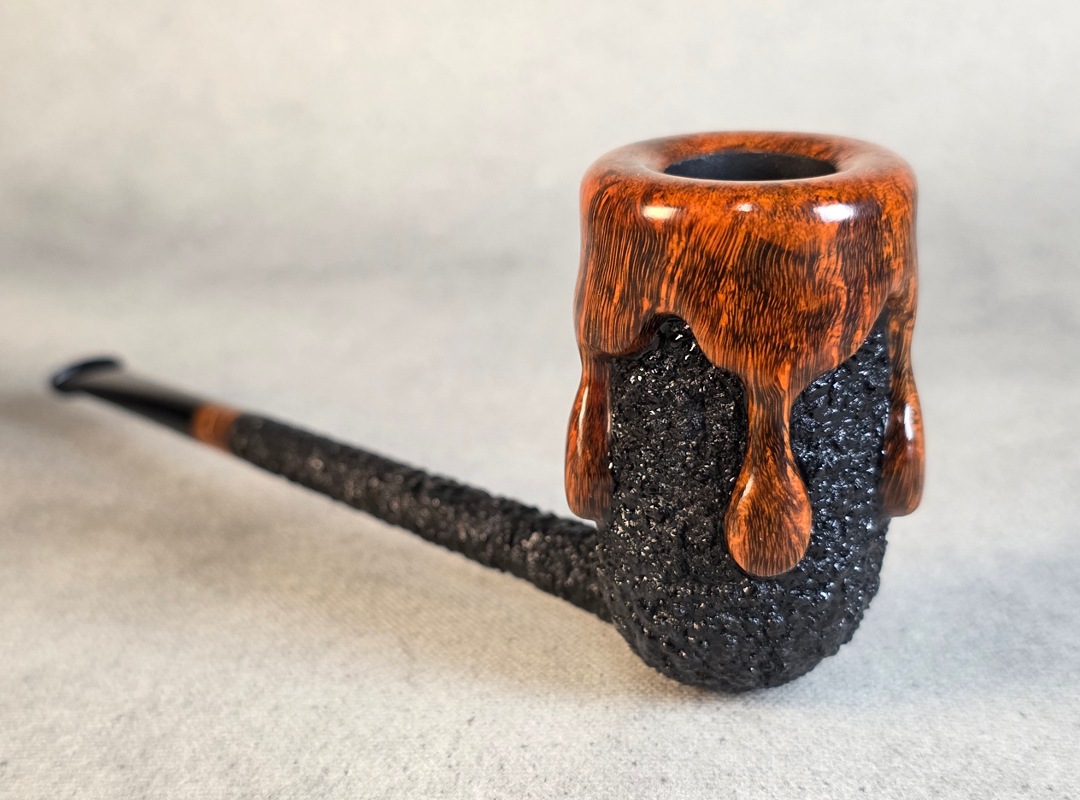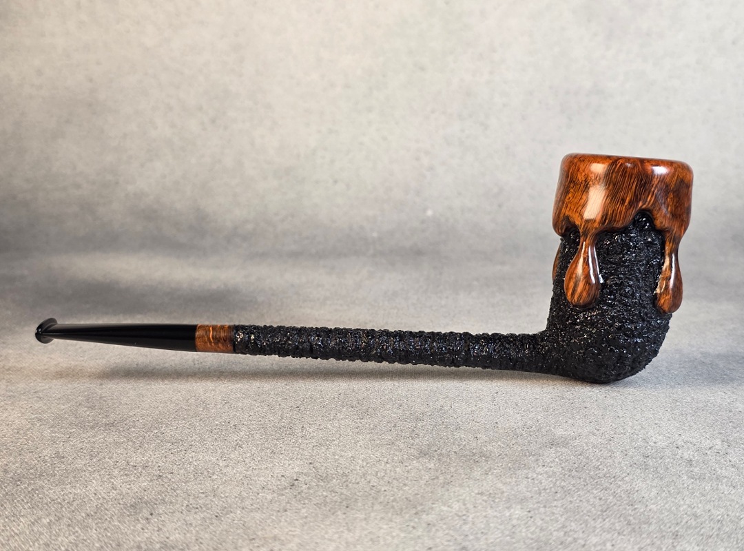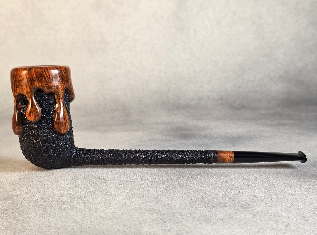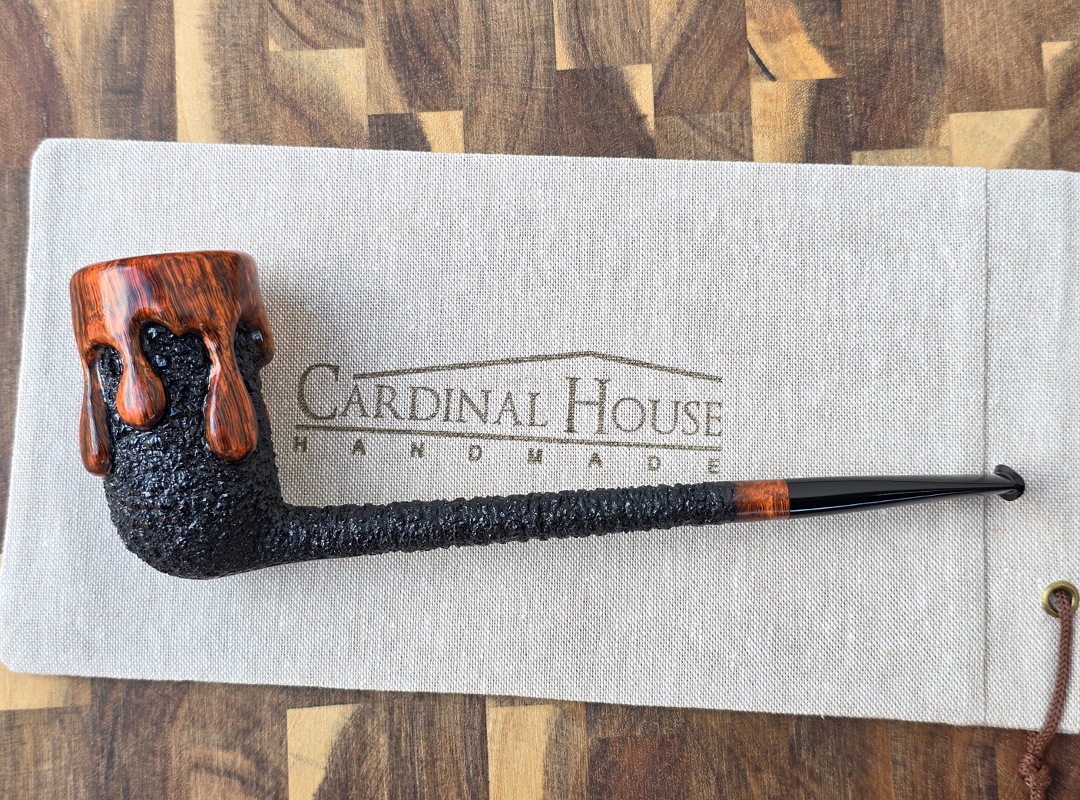 This Cardinal House pipes Munn series Stacked Billiard shaped briar pipe is painstakingly carved in my iconic “Wax-Drip” motif. The pencil-thin shank is reinforced with stainless steel tubing with a stainless tenon. The stem is expertly hand-cut from black NYH German Ebonite rod.