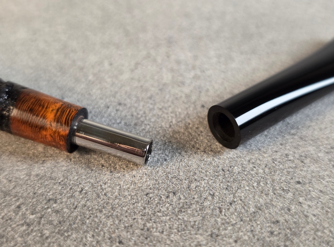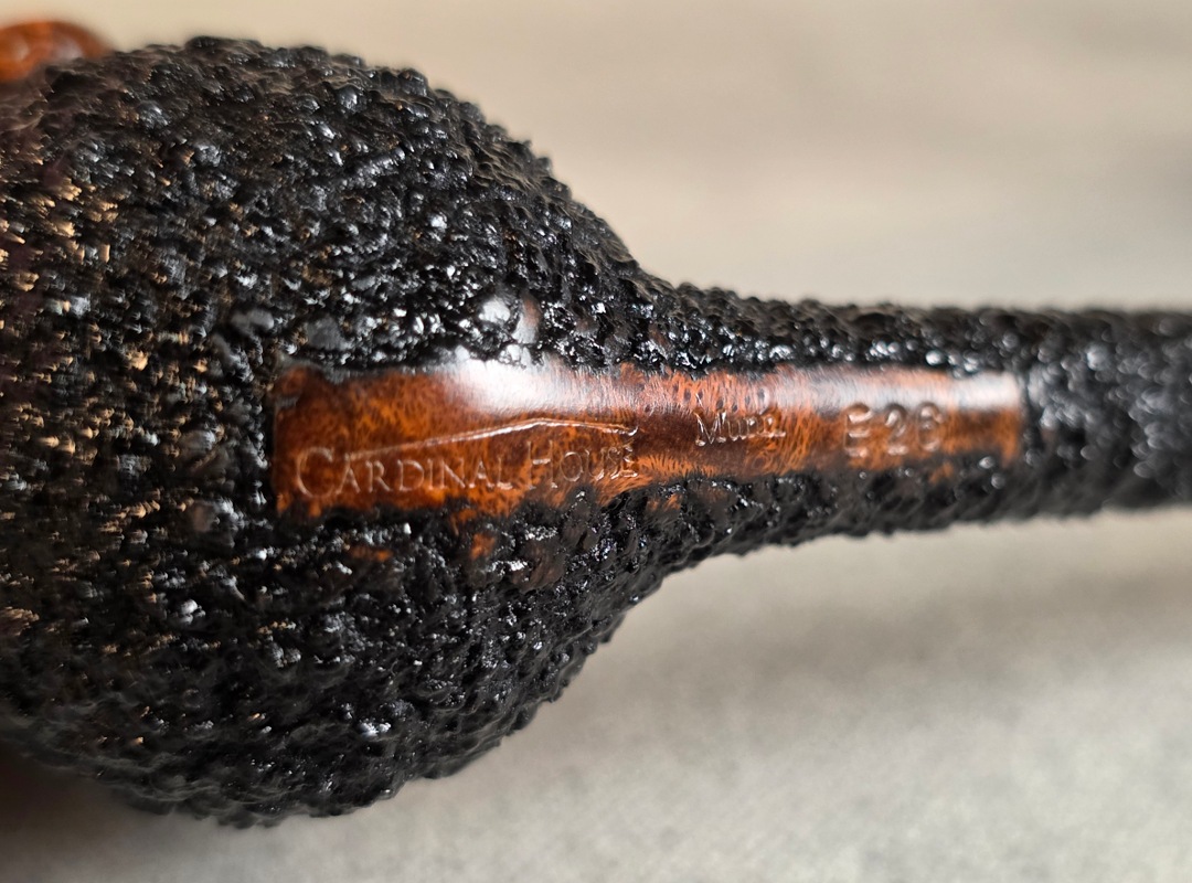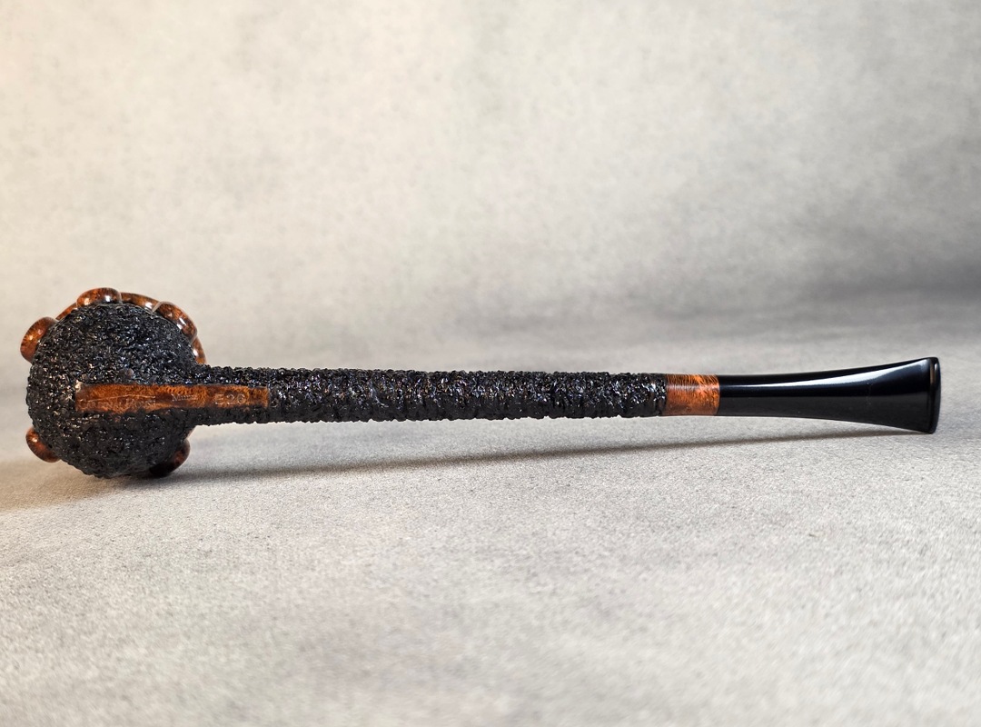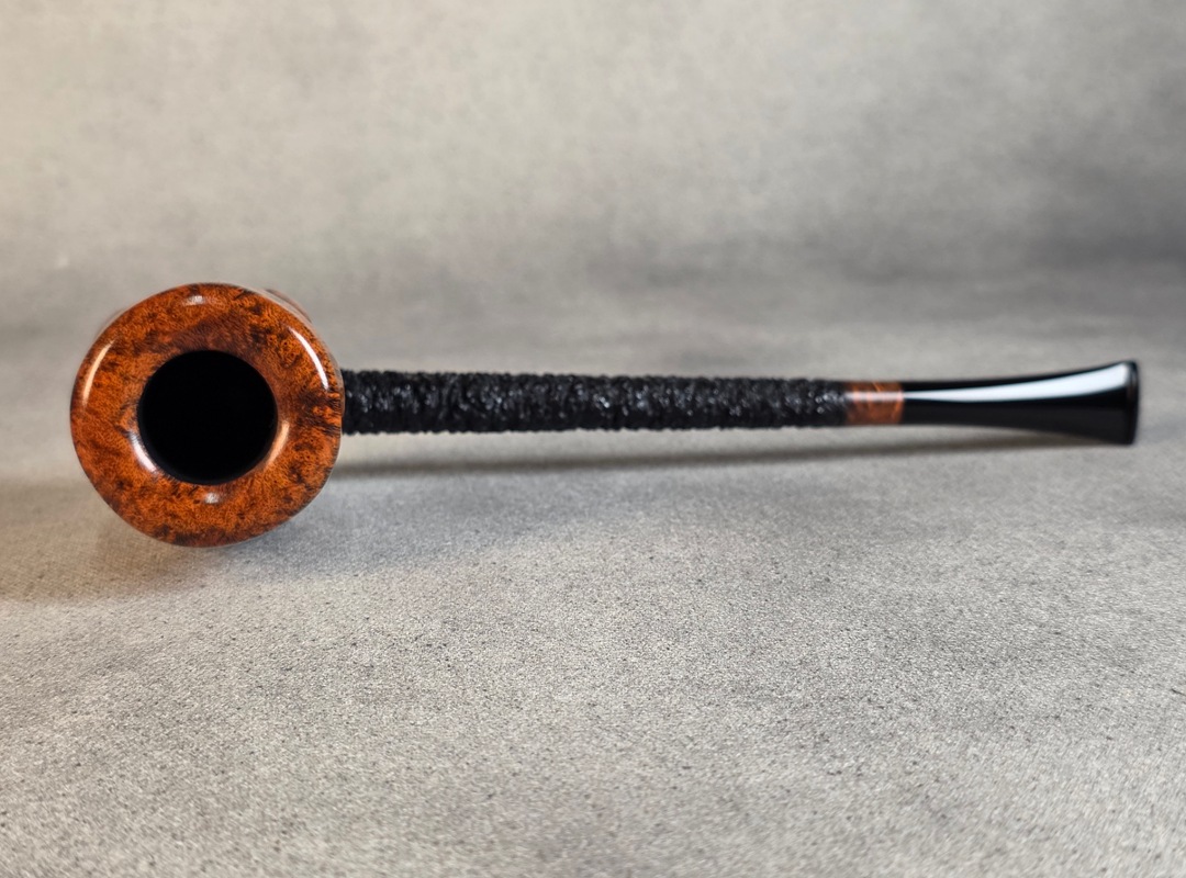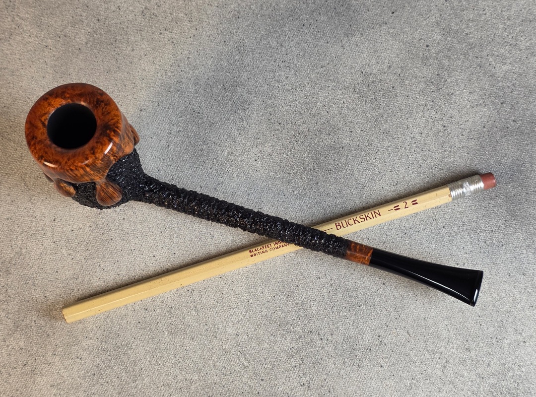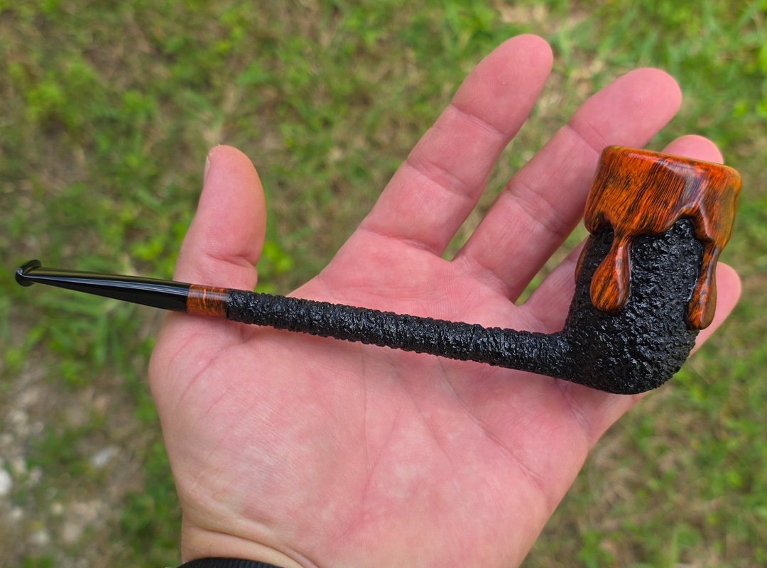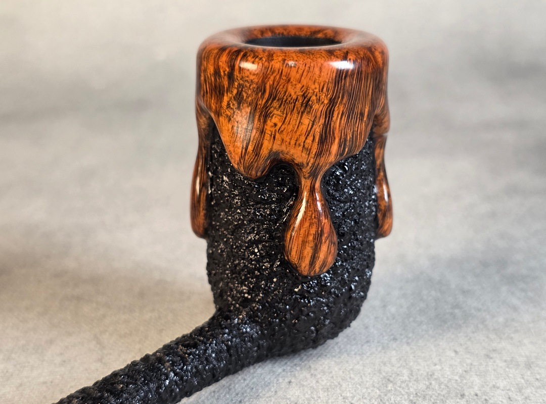 This Cardinal House pipes Munn series Stacked Billiard shaped briar pipe is painstakingly carved in my iconic “Wax-Drip” motif. The pencil-thin shank is reinforced with stainless steel tubing with a stainless tenon. The stem is expertly hand-cut from black NYH German Ebonite rod.