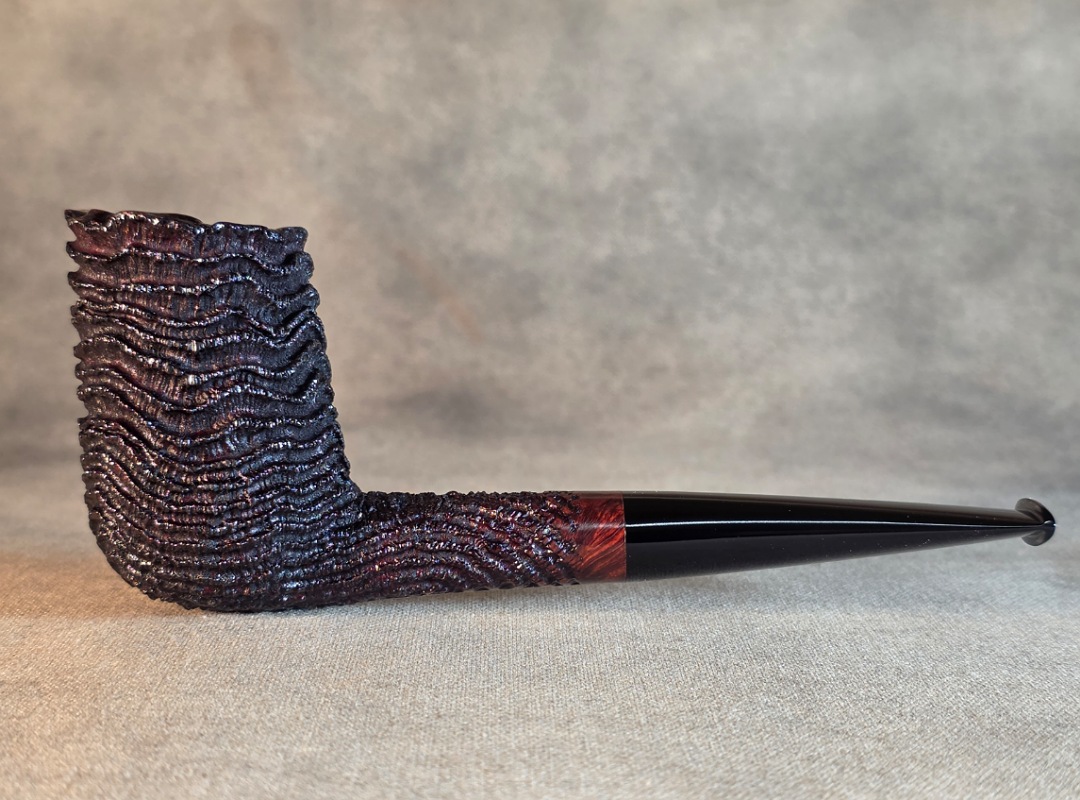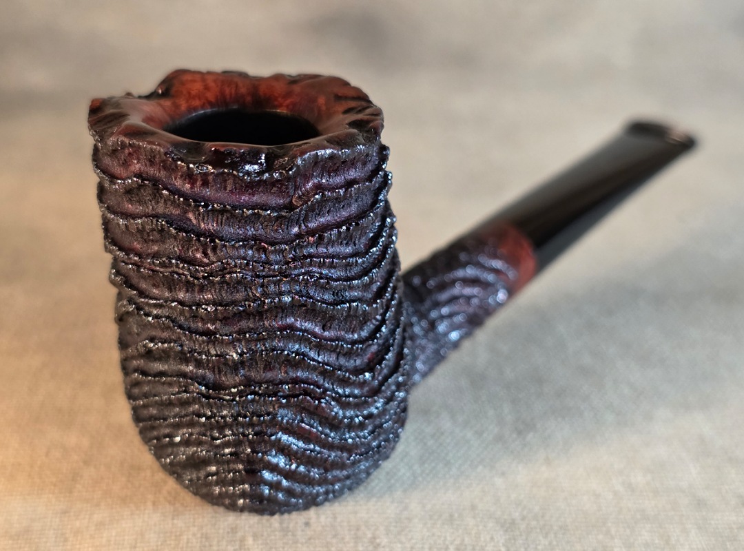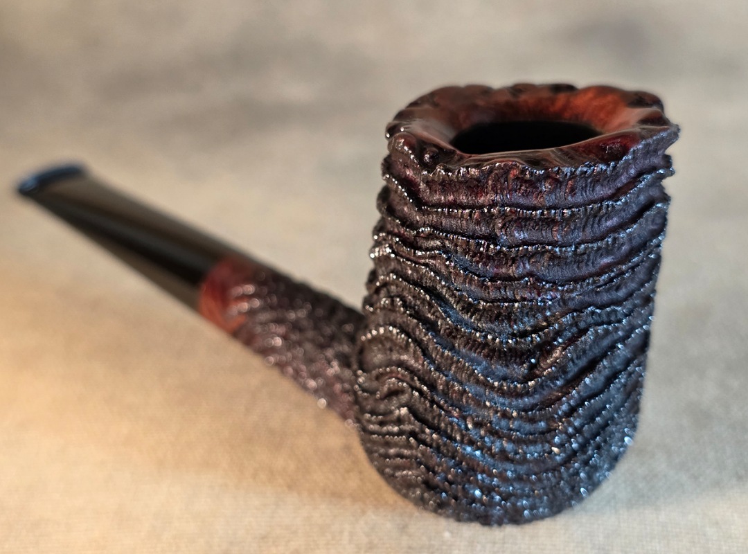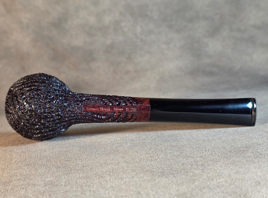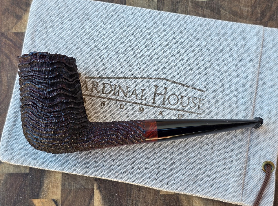 This Cardinal House pipes Munn series Stacked Billiard shaped briar pipe is finished in a dynamic “ring-blast” style carved rustication. It features a rim of natural Plateau. The stem is expertly hand-cut from black NYH German Ebonite rod.