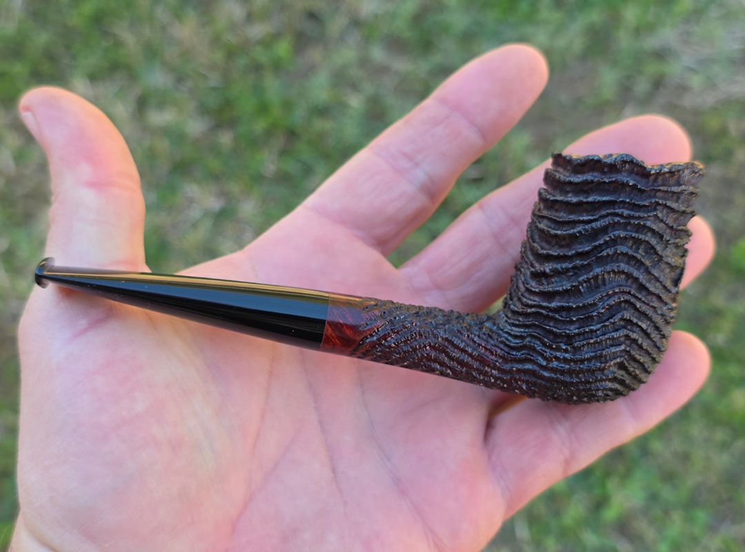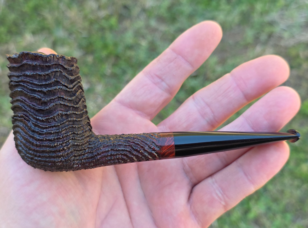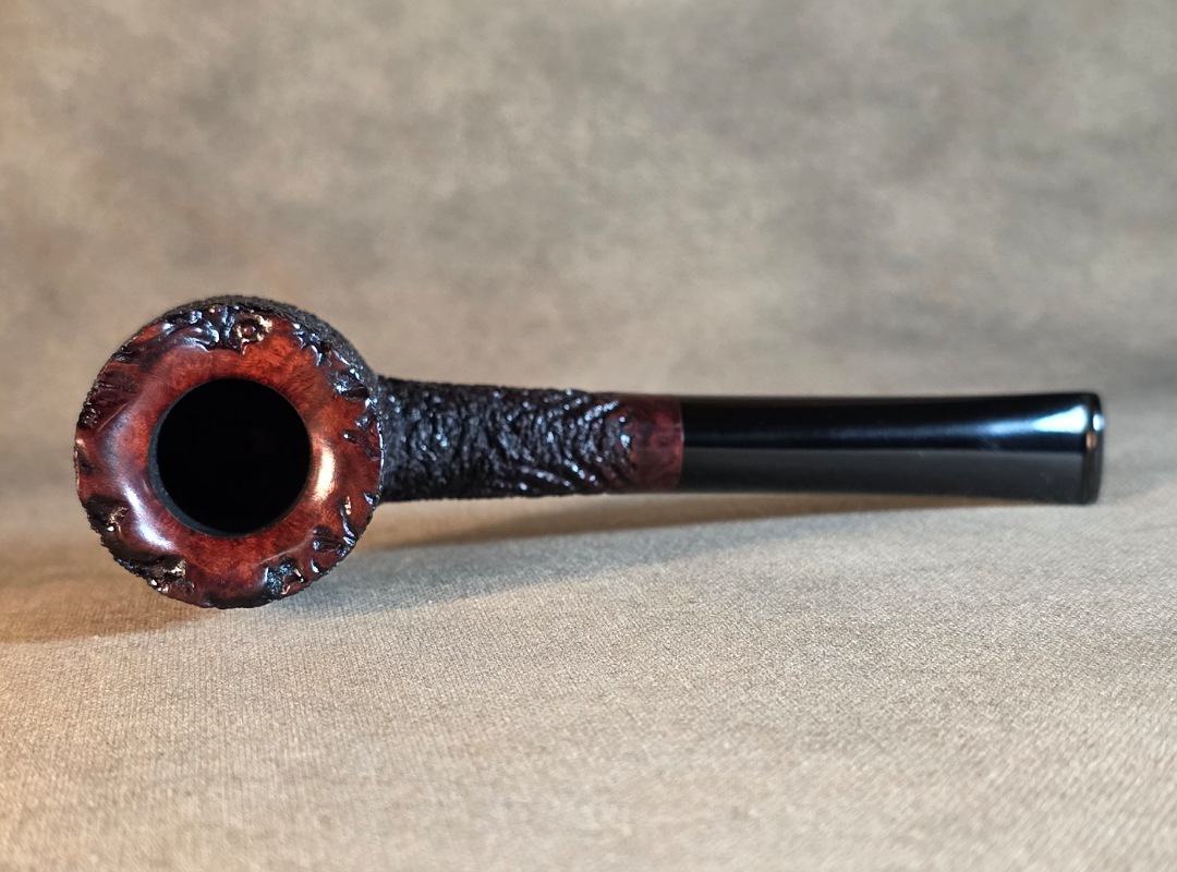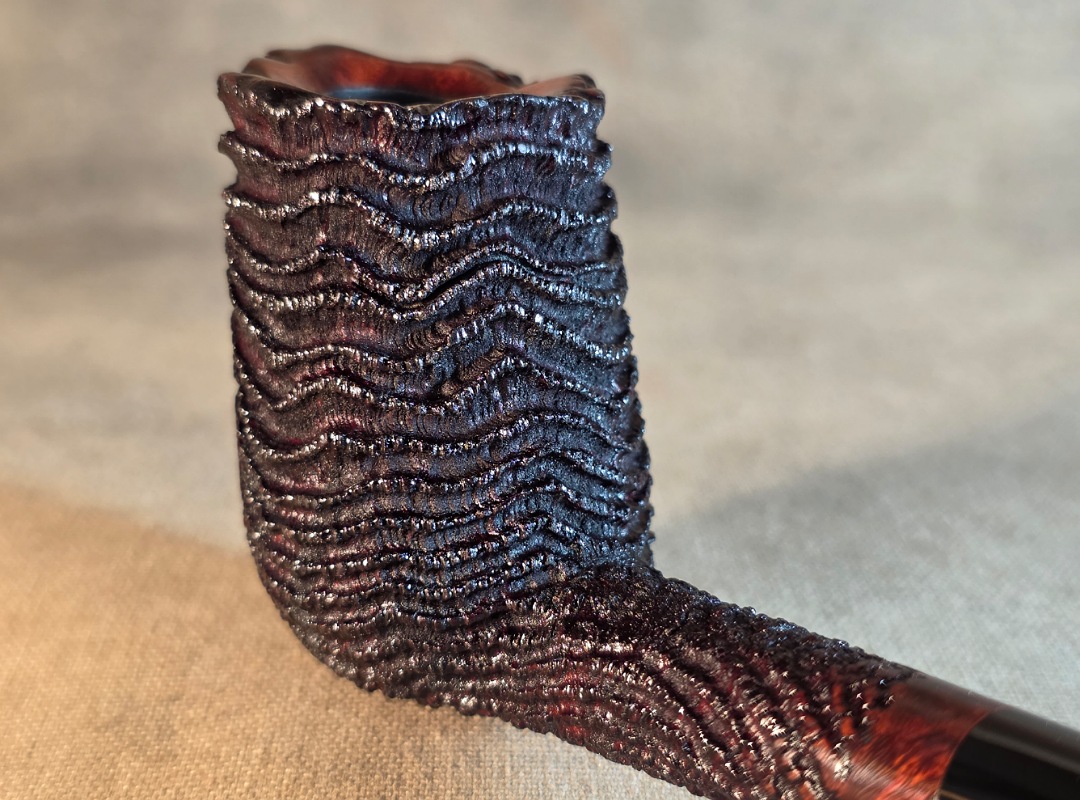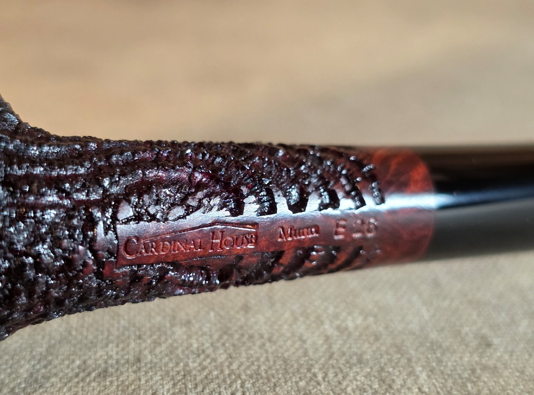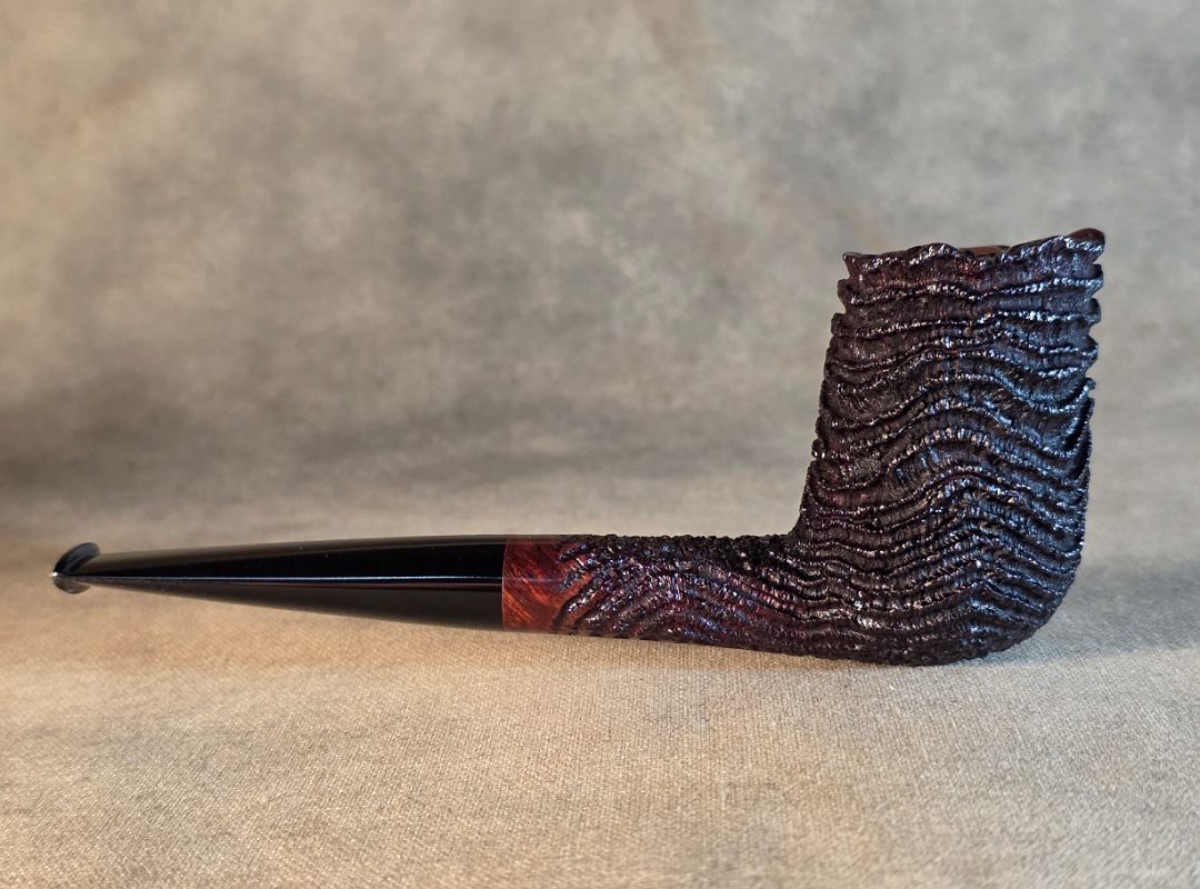 This Cardinal House pipes Munn series Stacked Billiard shaped briar pipe is finished in a dynamic “ring-blast” style carved rustication. It features a rim of natural Plateau. The stem is expertly hand-cut from black NYH German Ebonite rod.
