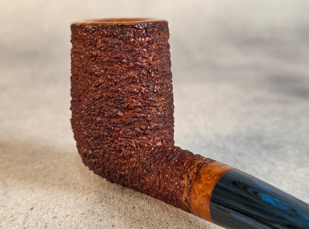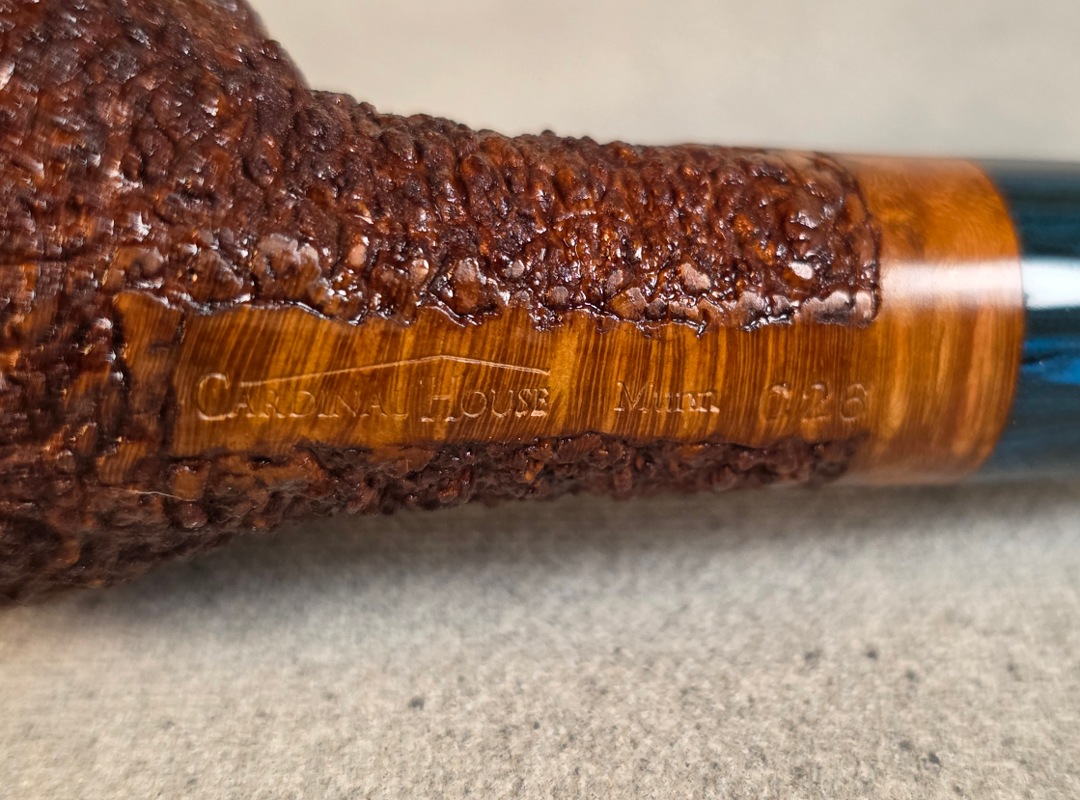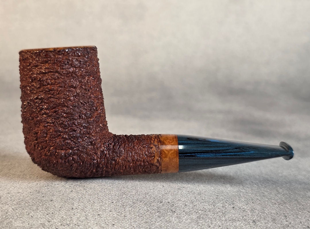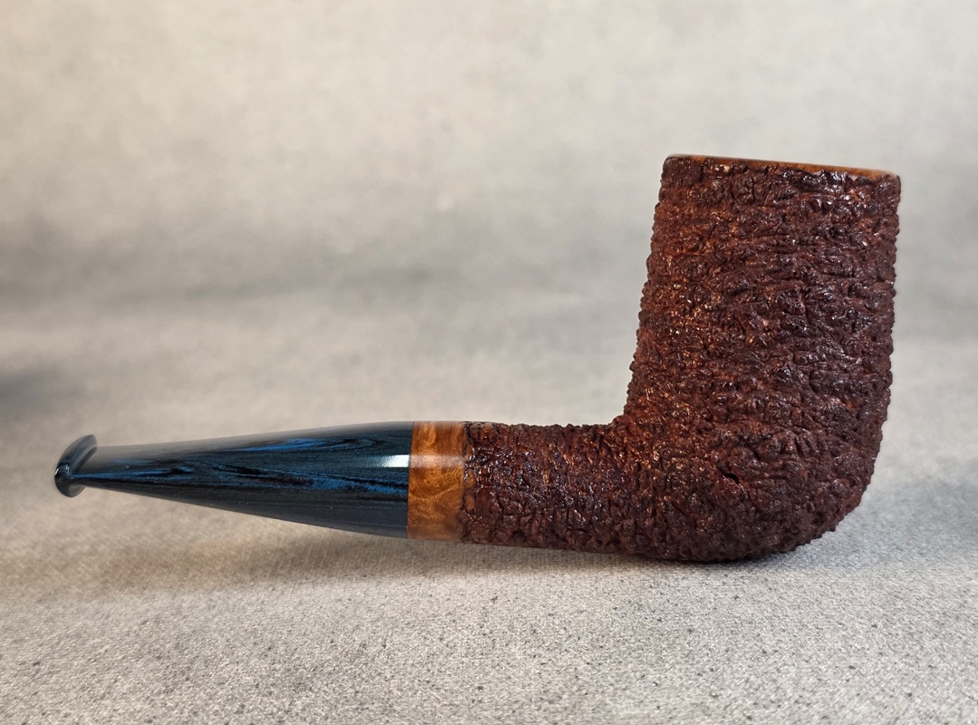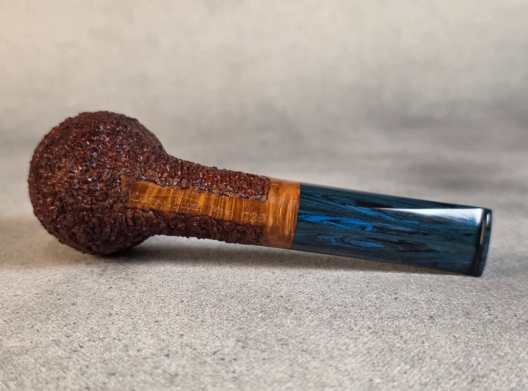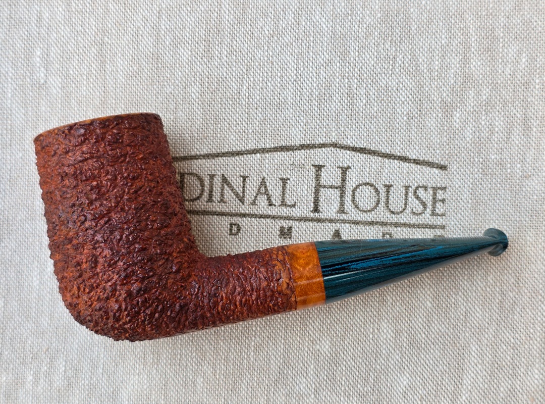 ThisĀ Cardinal House pipes Munn series Stubby Stacked Billiard shaped briar pipe is finished in a gorgeous, organic looking “pebble” style rustication. The stem is expertly hand-cut from blue/black NYH German Brindle Ebonite rod.