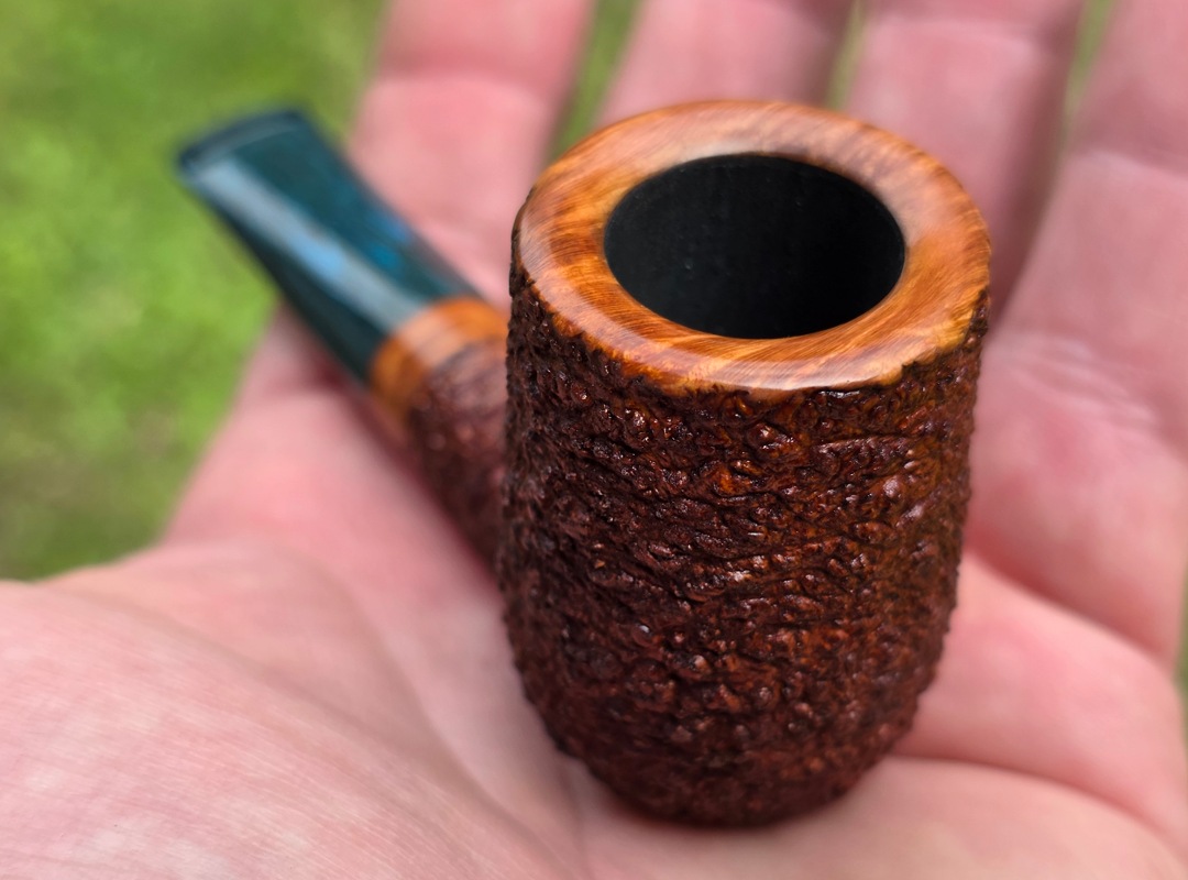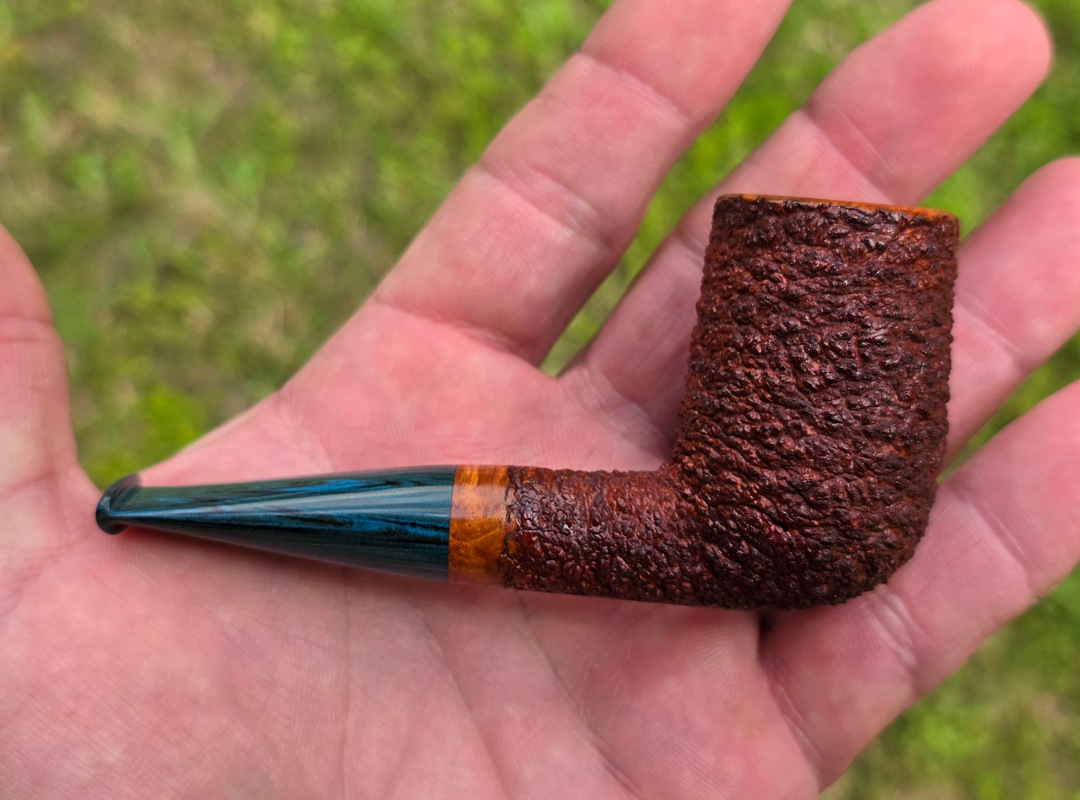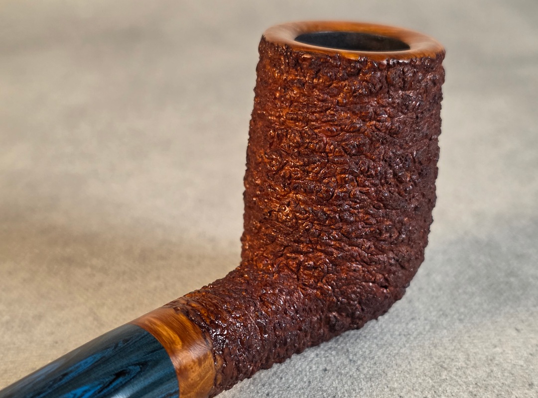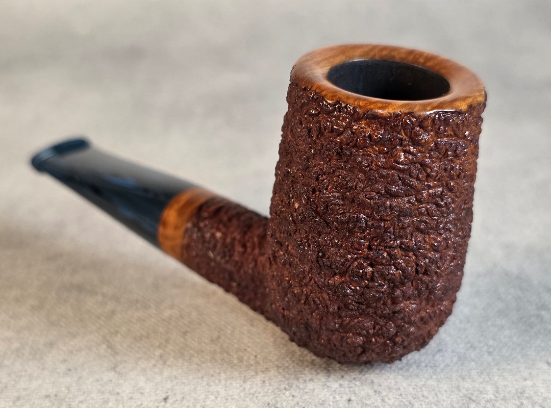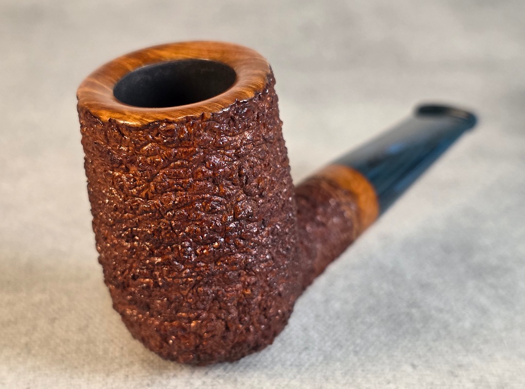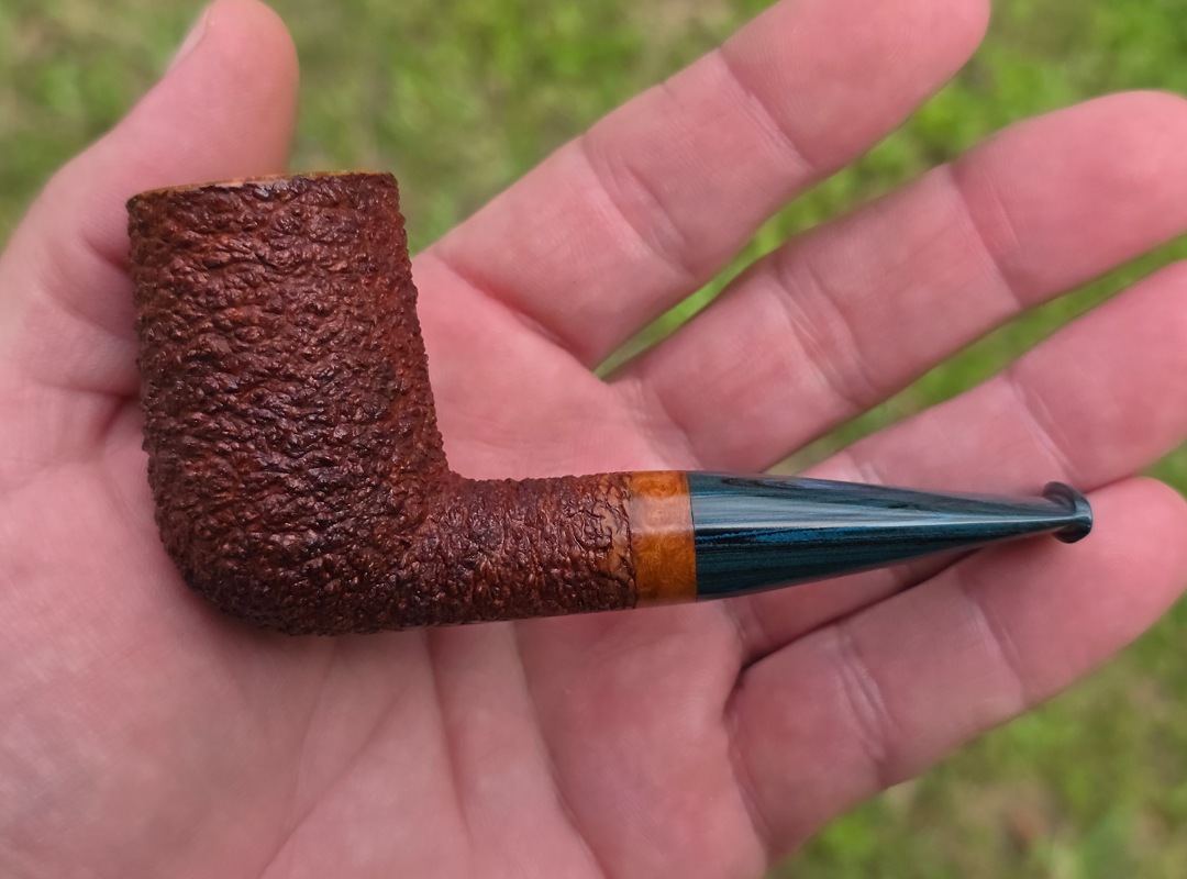 ThisĀ Cardinal House pipes Munn series Stubby Stacked Billiard shaped briar pipe is finished in a gorgeous, organic looking “pebble” style rustication. The stem is expertly hand-cut from blue/black NYH German Brindle Ebonite rod.