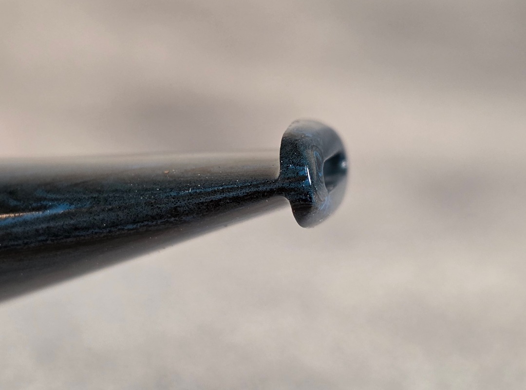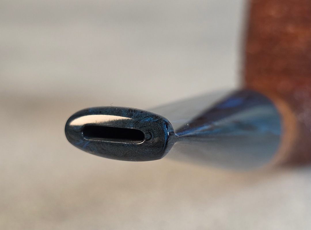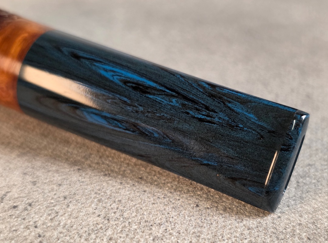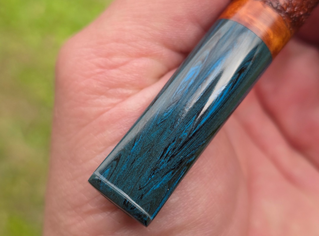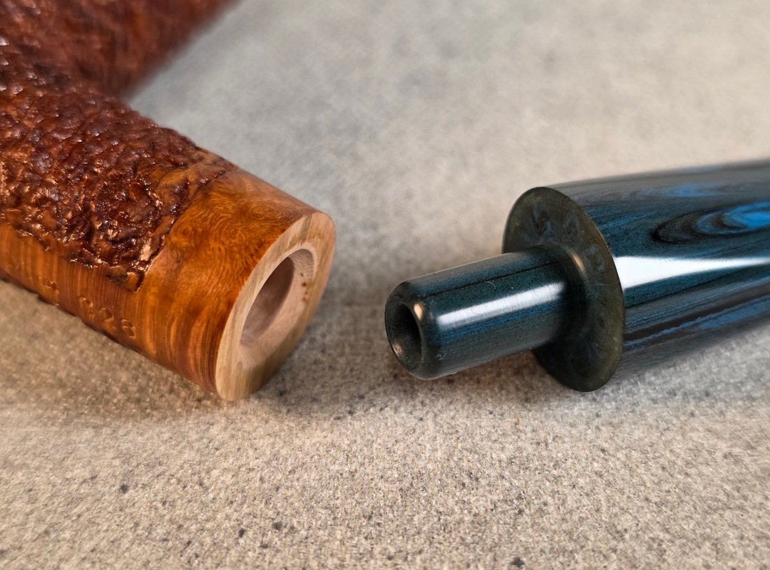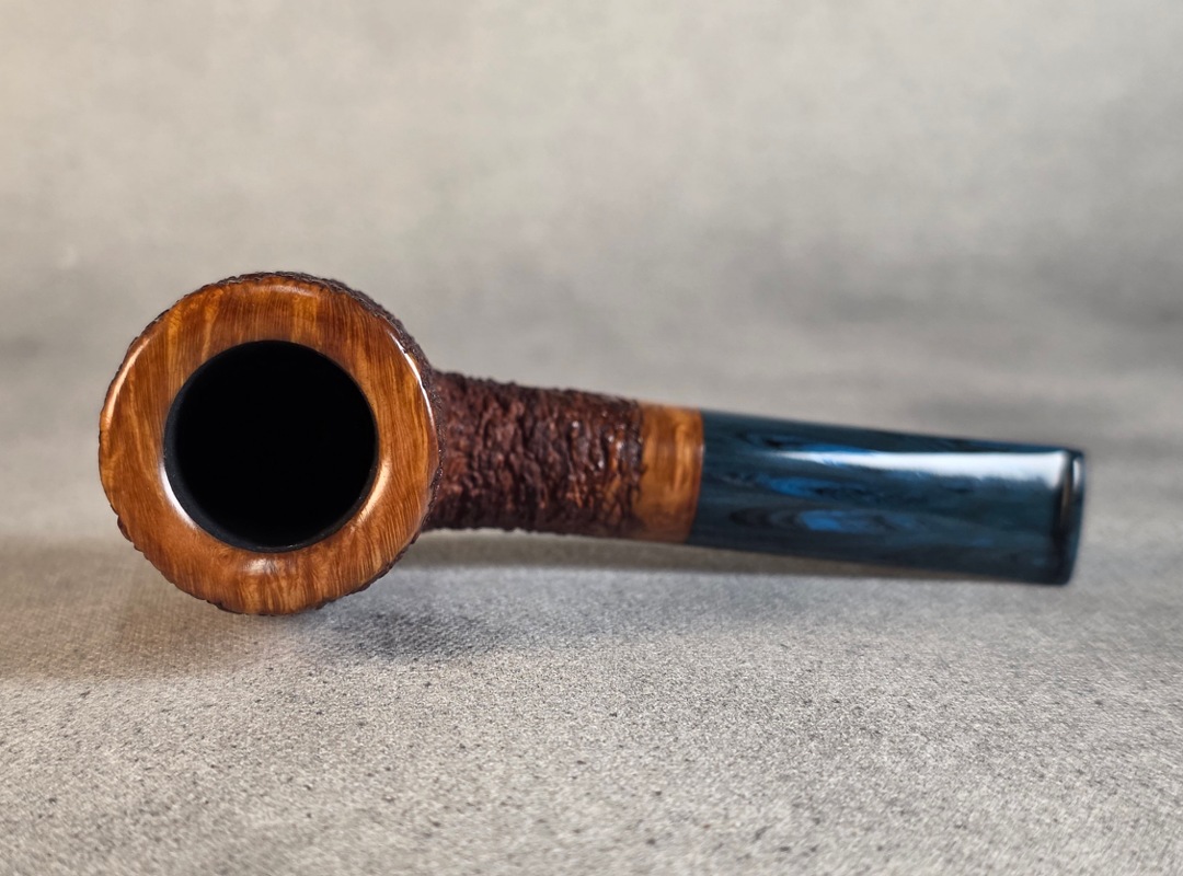ThisĀ Cardinal House pipes Munn series Stubby Stacked Billiard shaped briar pipe is finished in a gorgeous, organic looking “pebble” style rustication. The stem is expertly hand-cut from blue/black NYH German Brindle Ebonite rod.